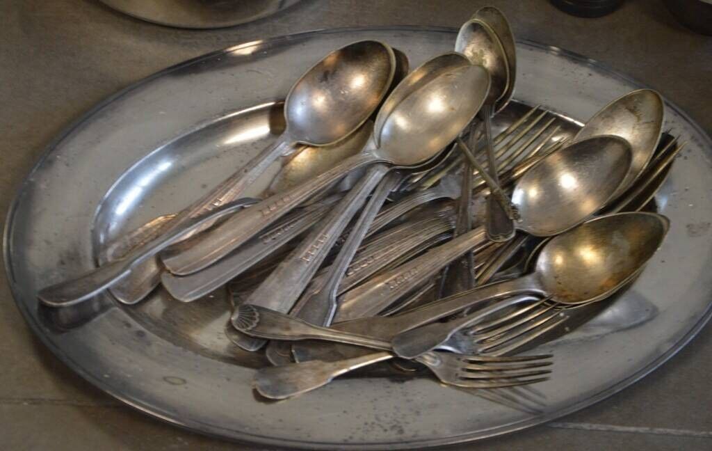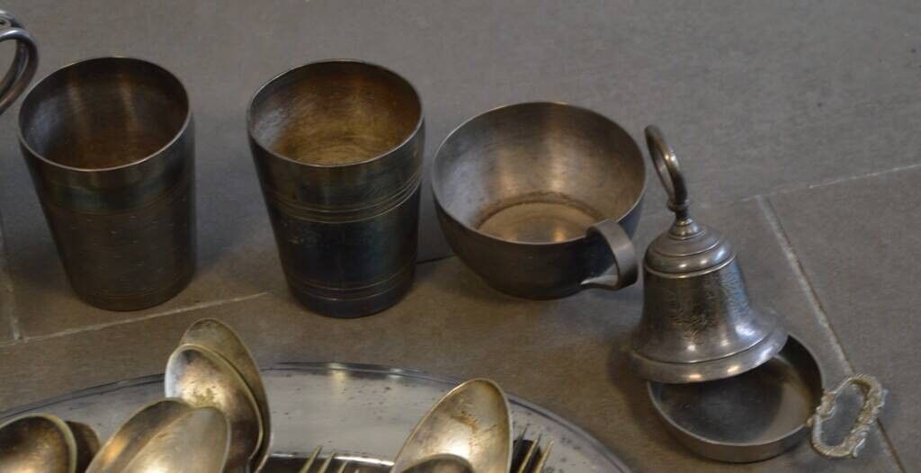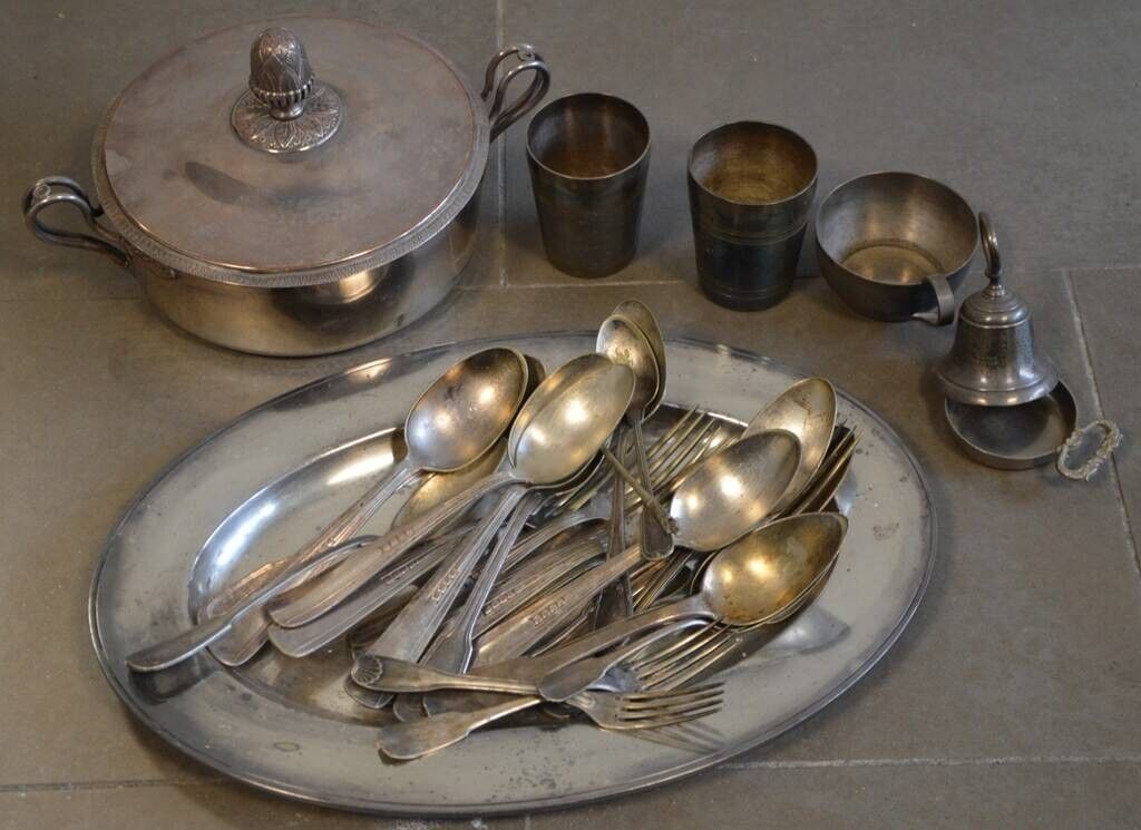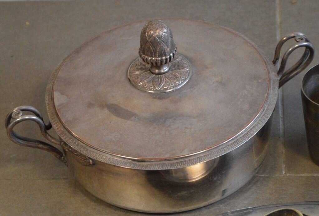 on y joint un pot à bouillon couvert en métal argenté, 2 timbales, une cloche, une tasse en métal argenté, un lot de couverts dépareillés en métal argenté dépareillés dont Ercuis et Christofle et un taste vin en métal.