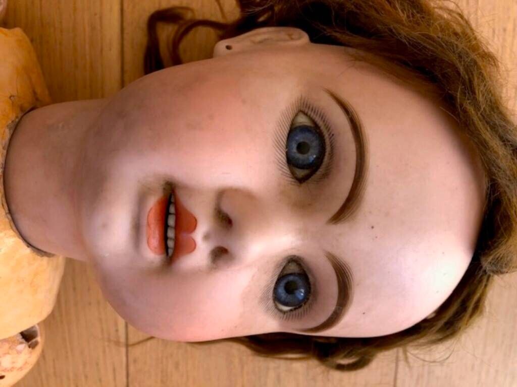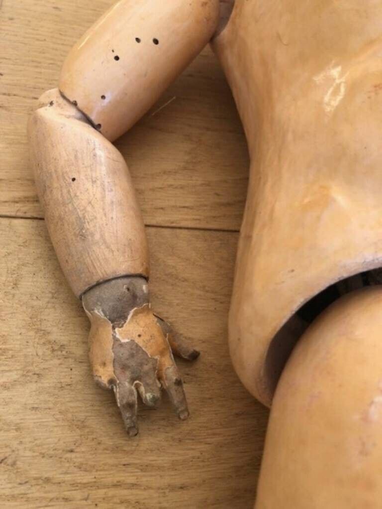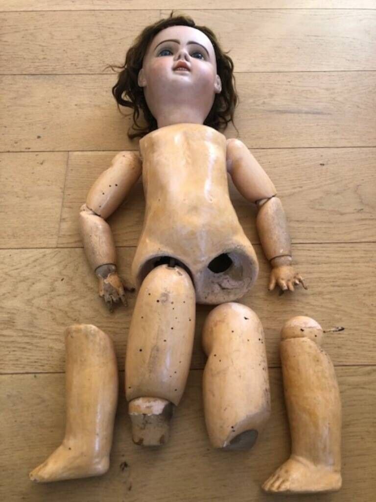 Grande poupée en porcelaine et corps en composition et bois.