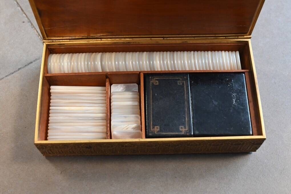 et incrustation de plaque de nacre et d'émail, contenant des jetons en nacre et des cartes à jouer.