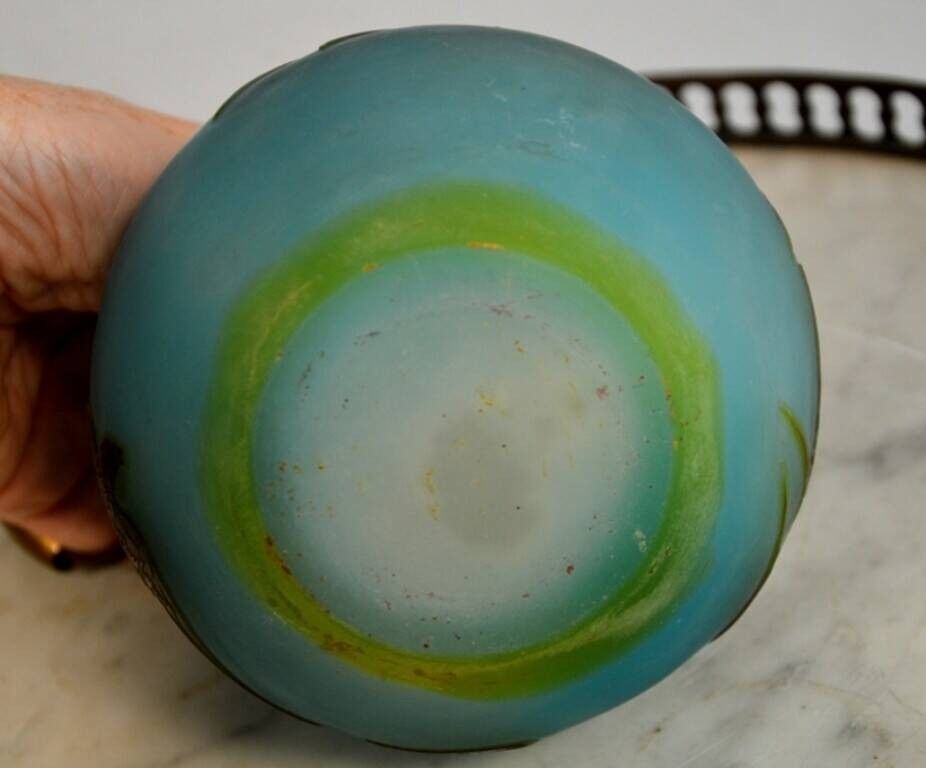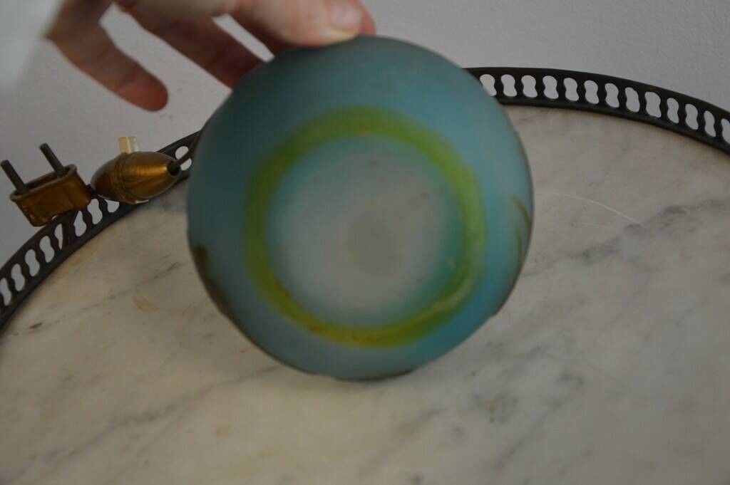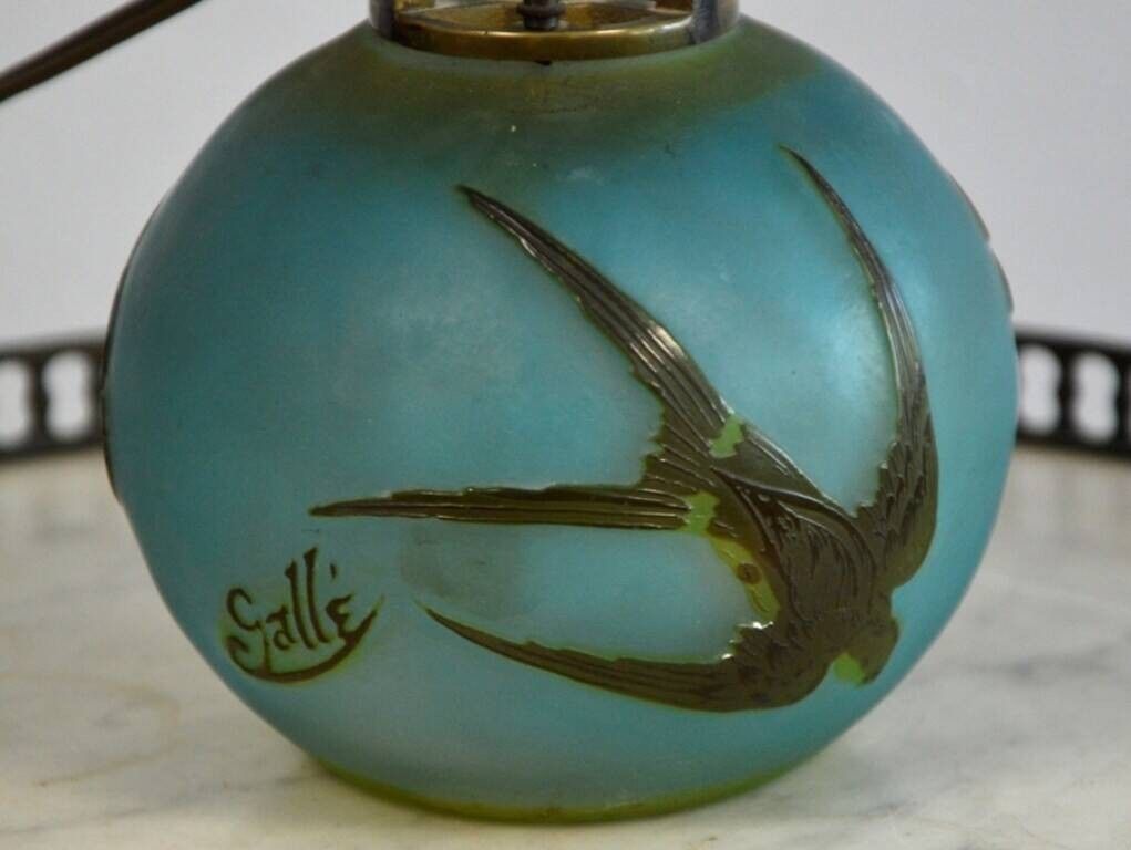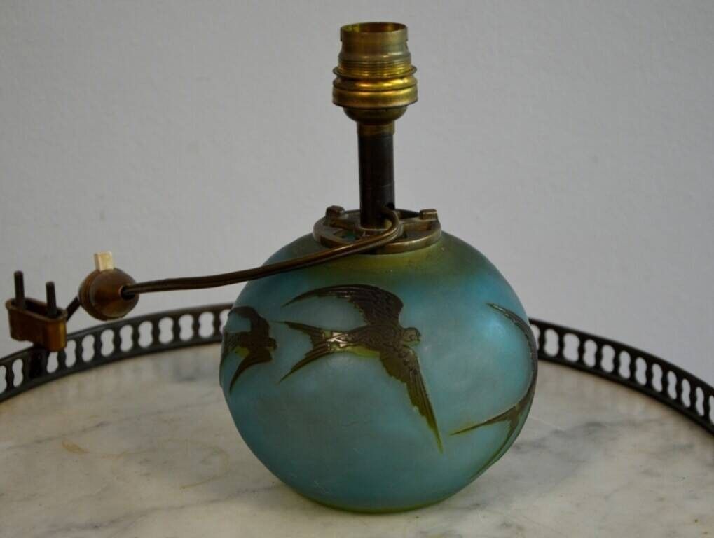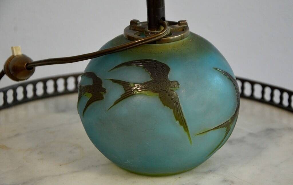 Lampe ronde en verre multicouche dégagé à l'acide à décor d'hirondelles sur fond bleu. Signé Gallé.