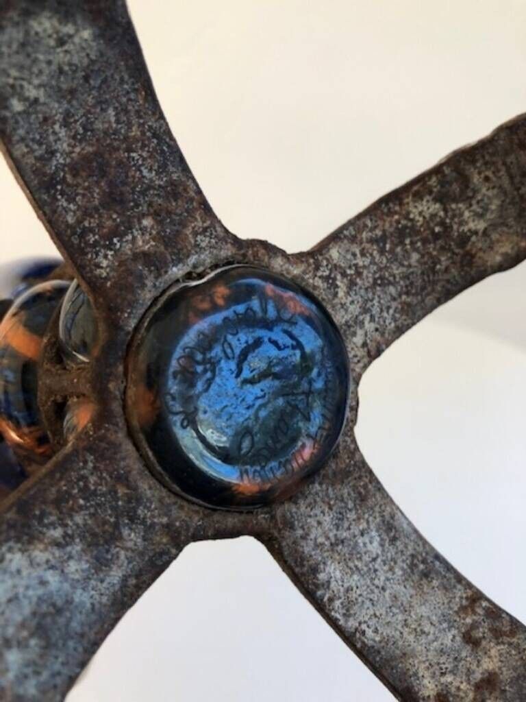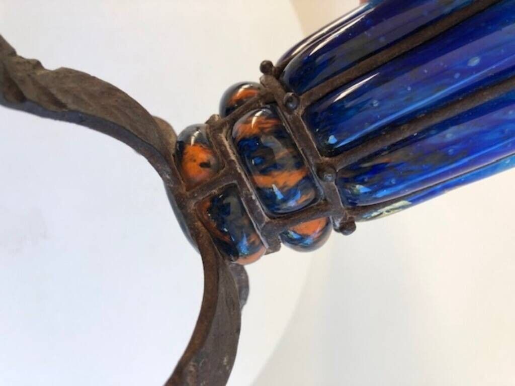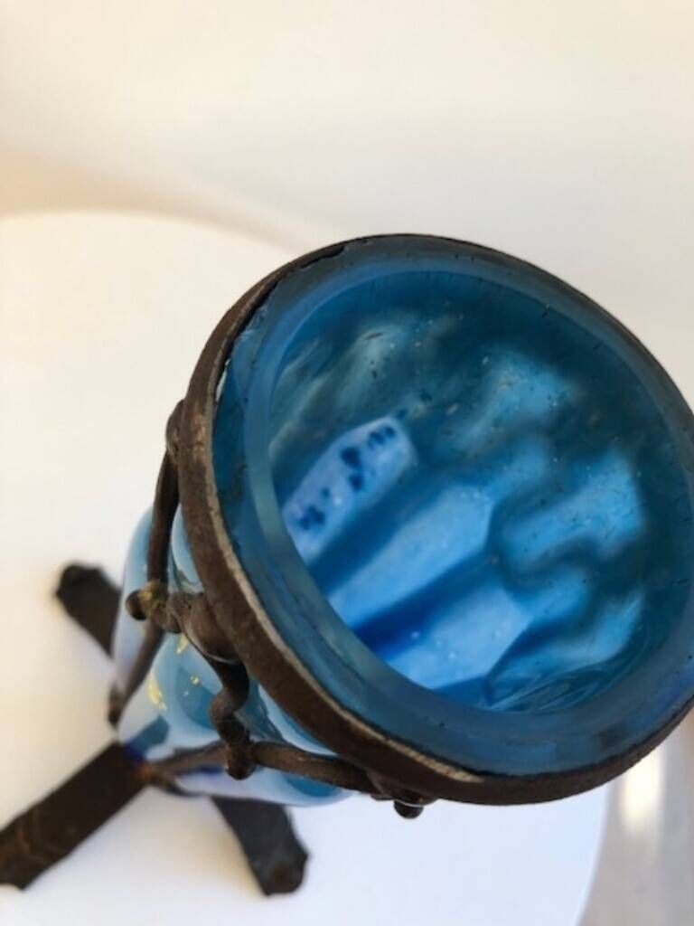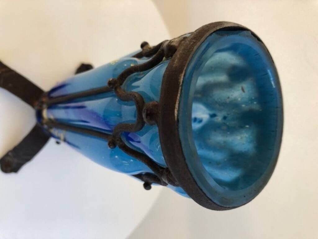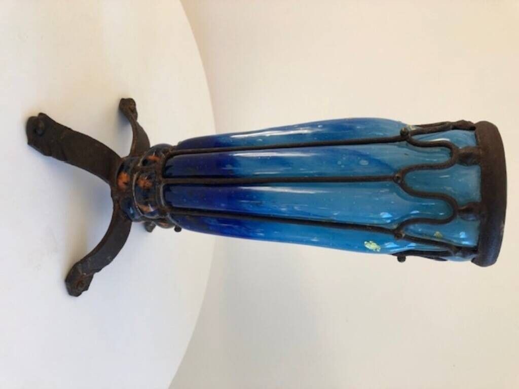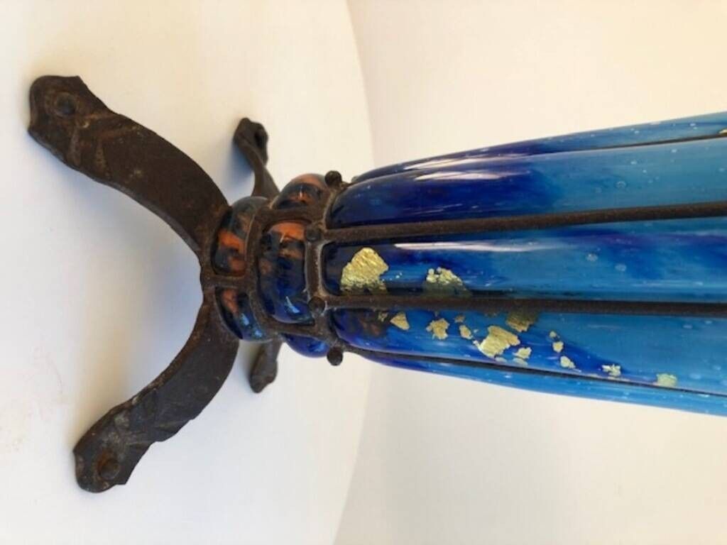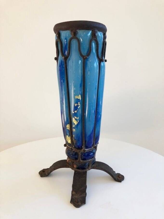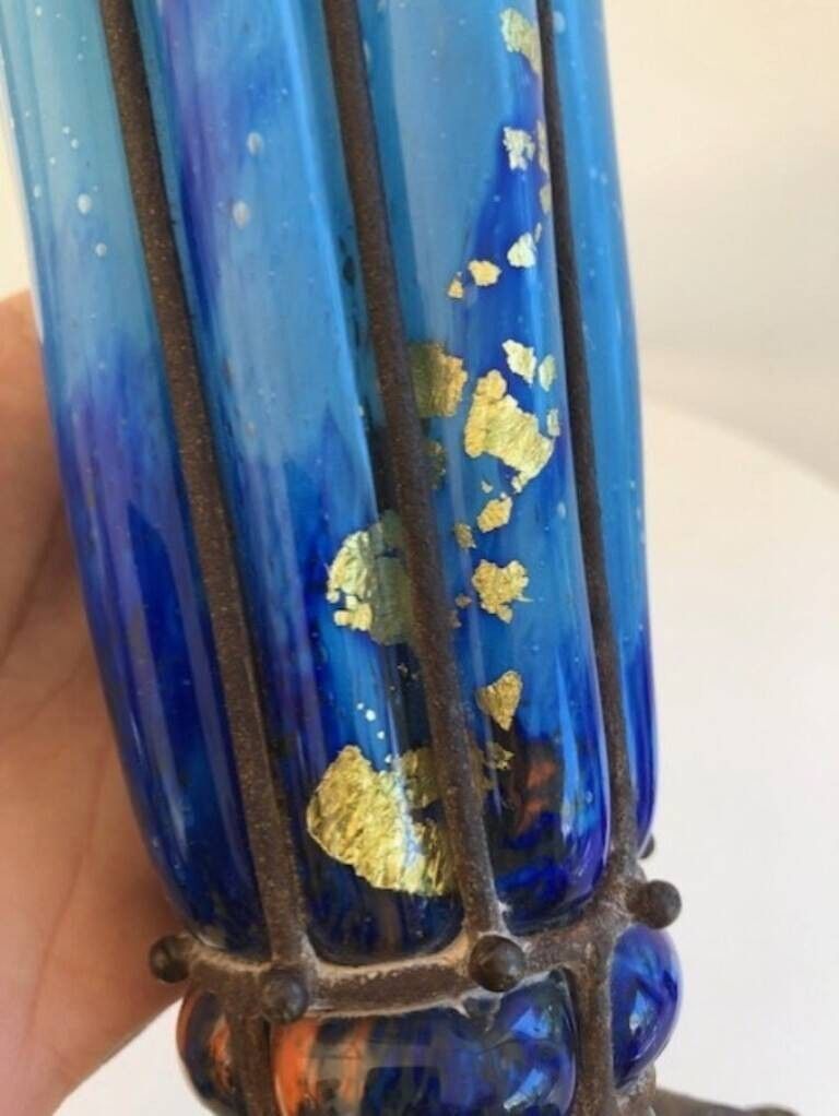 Vase en verre et feuilles d’or, armature en fer forgé, signé au-dessous.