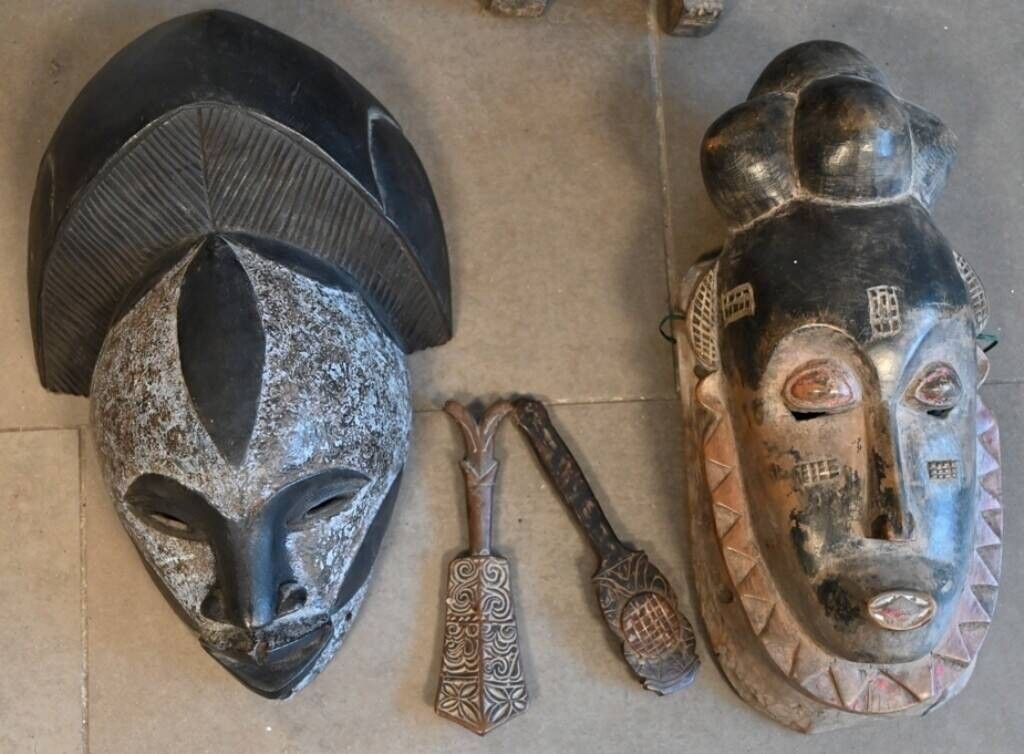 en bois sculpté, deux masques style Punu, deux cuillères en bois sculpté pour l'impression des tissus