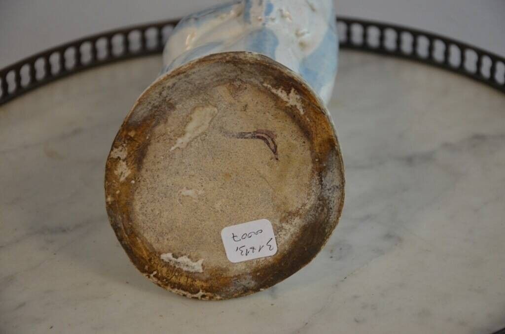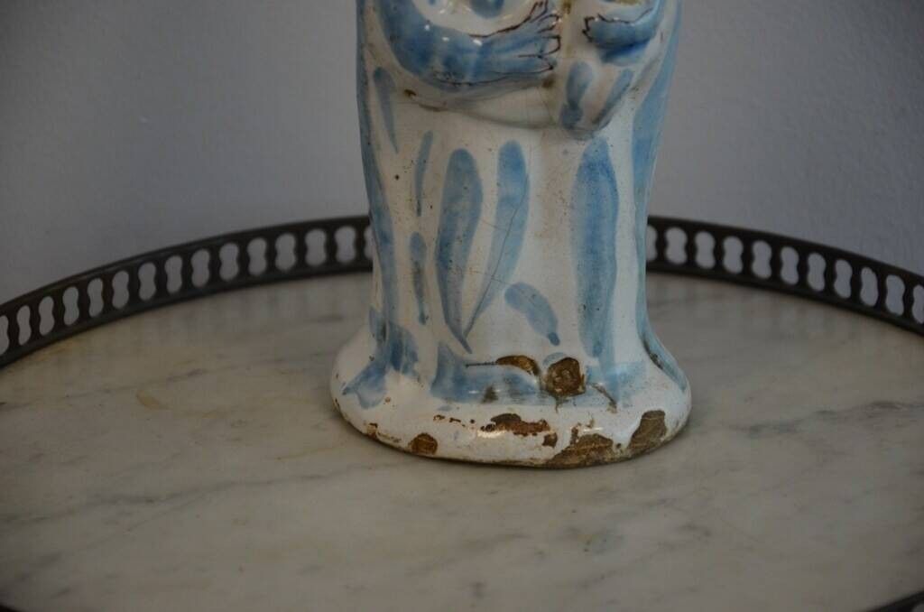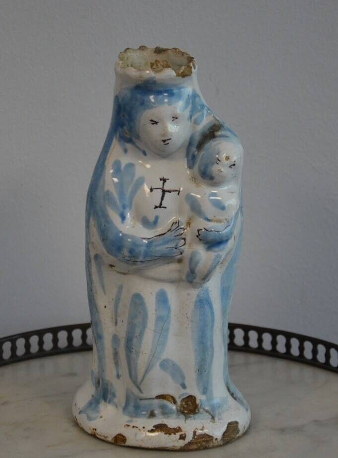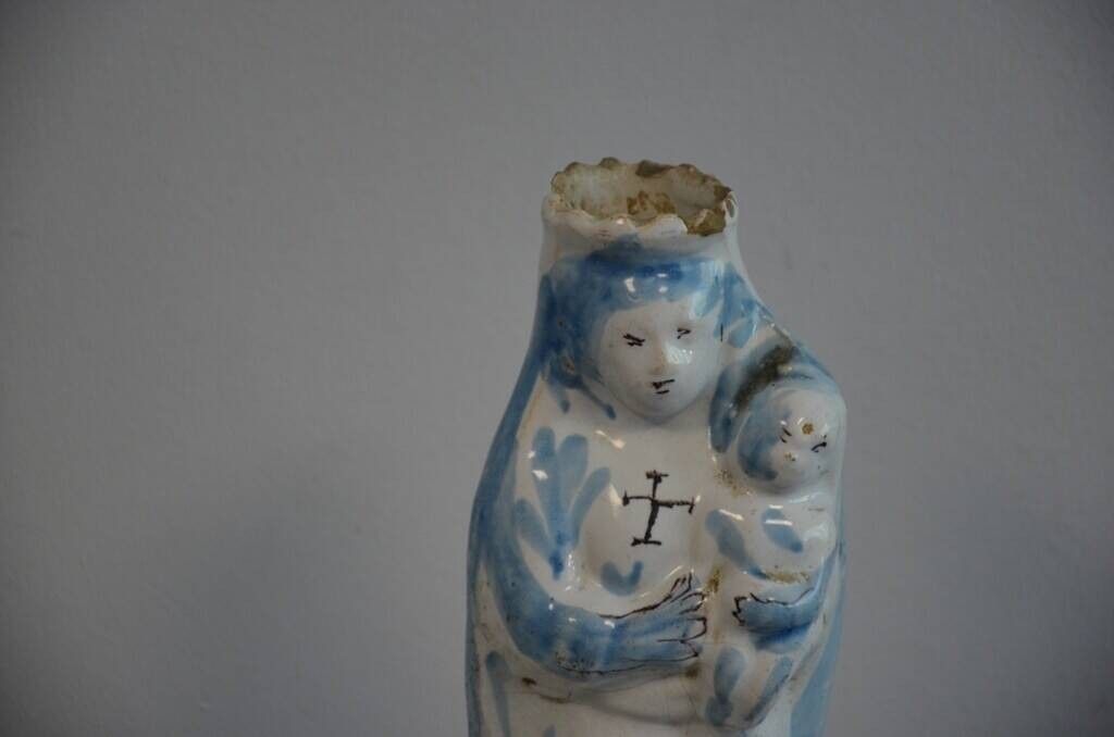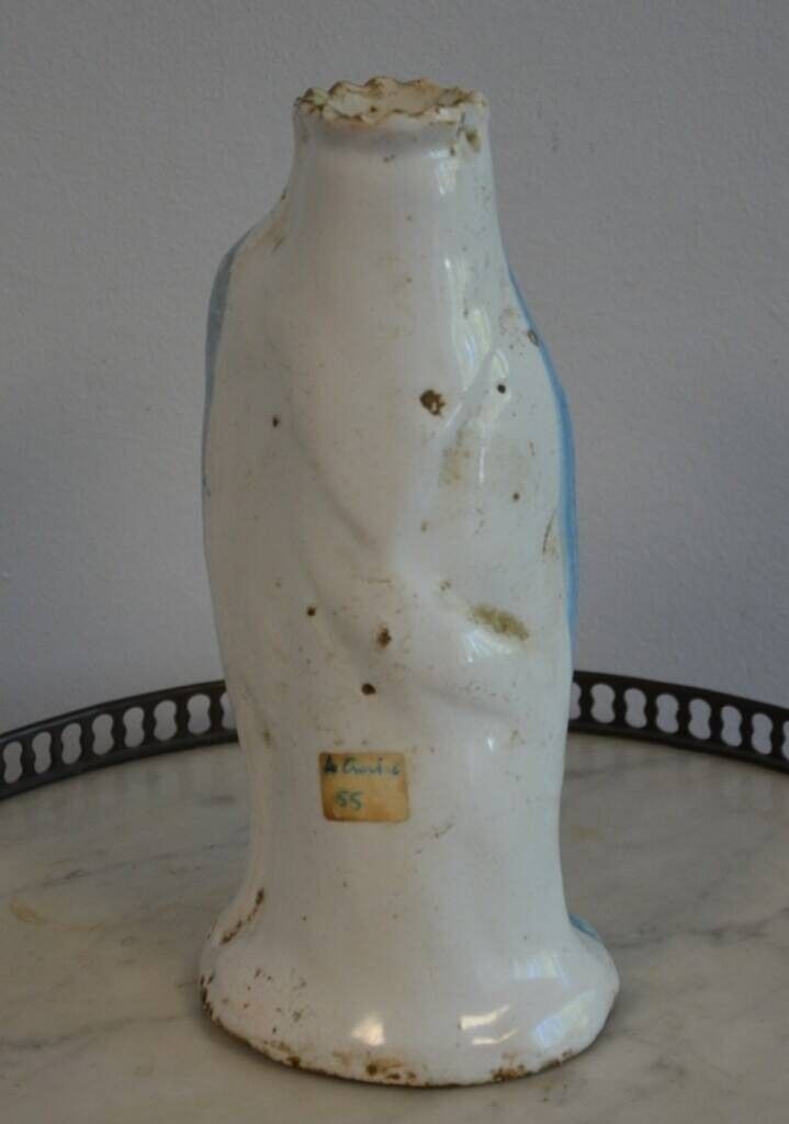 en céramique émaillée blanche et bleu, la Vierge porte une croix manganèse sur la poitrine.