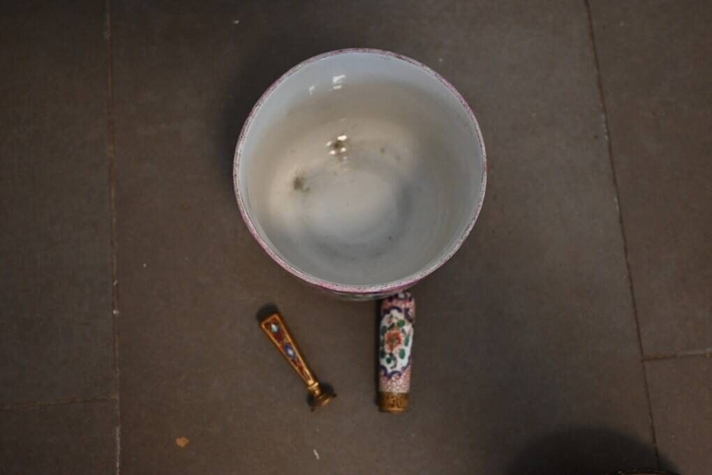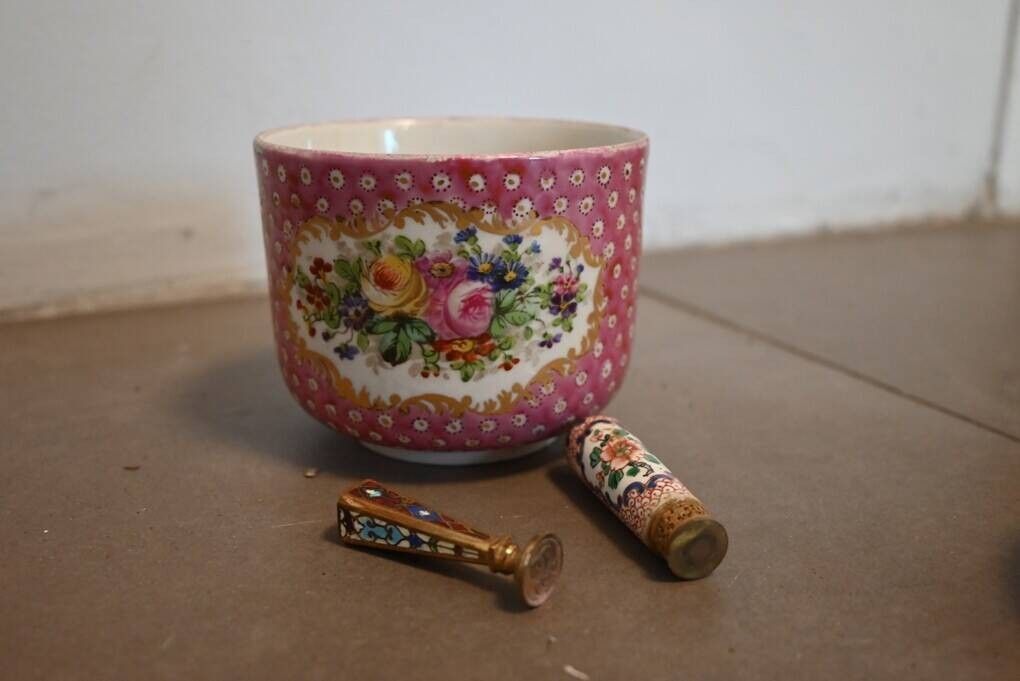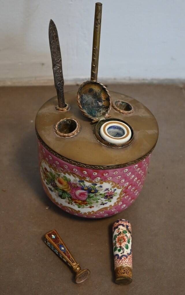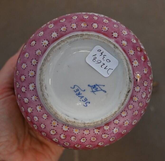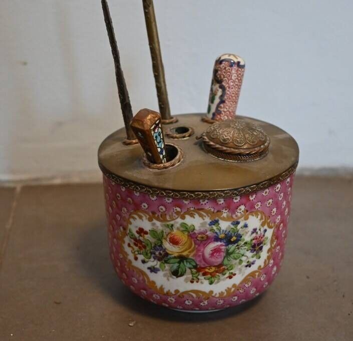 à décor de fleurs avec couvercle en laiton et des accessoires (rapportés), portant une marque dessous en bleu sur couverte Sèvres (?)