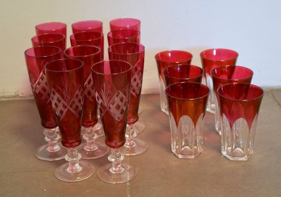à champagne et 6 petits gobelets en verre taillé rouge.