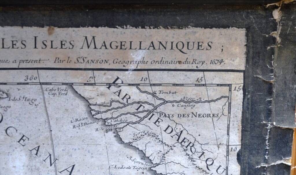 en ses principales partiesoù sont distingués les uns des autres Les États suivant qu'ils appartiennent présentement, aux François, Castillans, Portugais, Hollandais, tirée de toutes les relations qui ont été paru jusques à présent par le Sieur SANSON, Géographe ordinaire du Roy, présentée à Monseigneur le Dauphin. Hubert JAILLOT. Contrecollée sur toile, monté pour être accrochée grâce à une architrave et un barre en bois mouluré, laqué noir et doré.