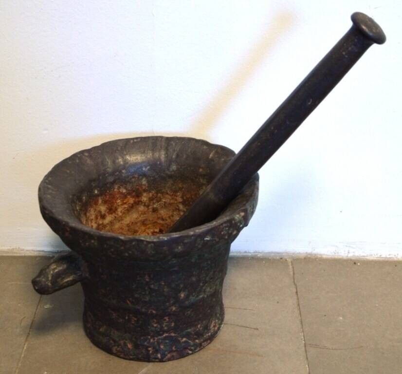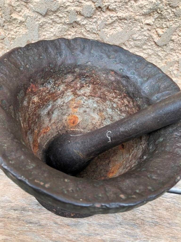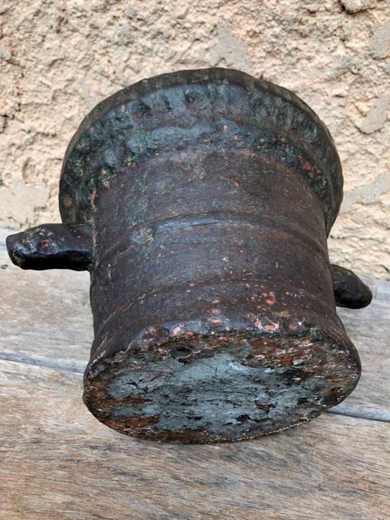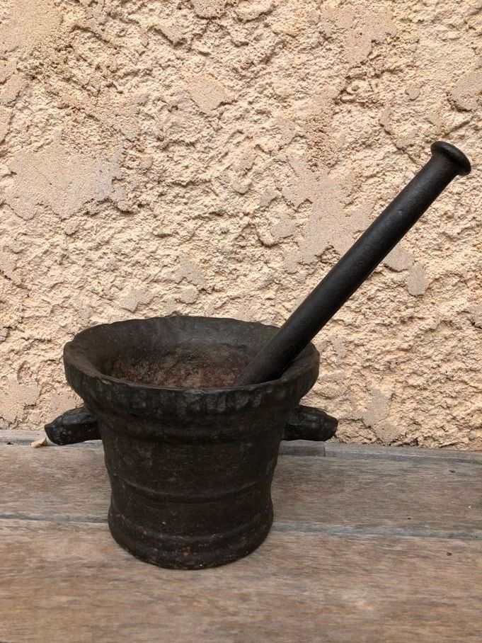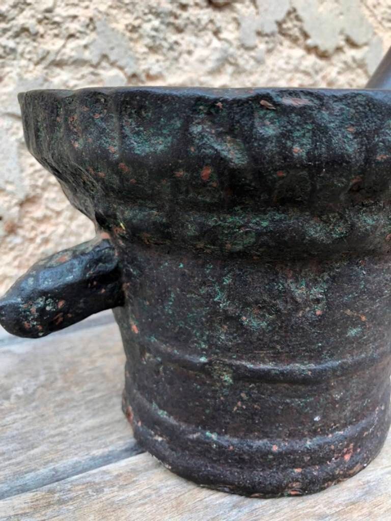 Imposant mortier avec son pilon en fonte de fer/bronze martelé