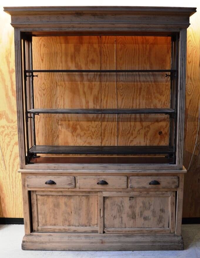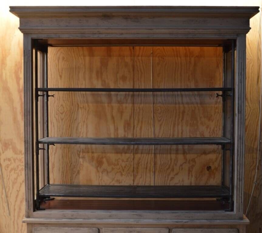 présentant trois étagères en partie haute, ouvrant par trois tiroirs en ceinture et deux portes coulissantes en partie basse.