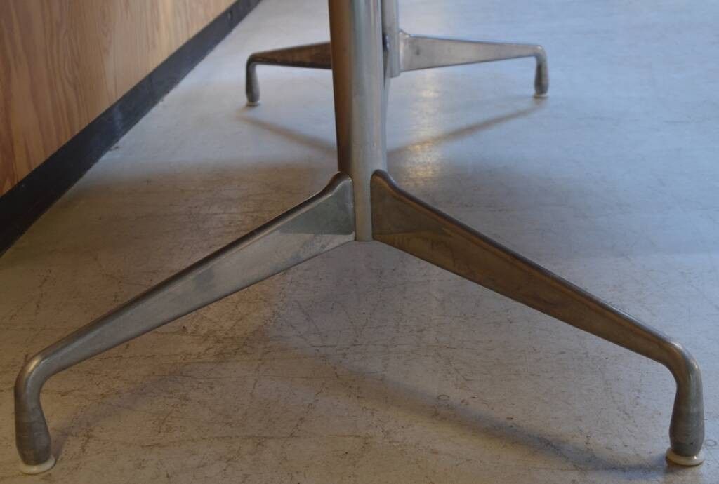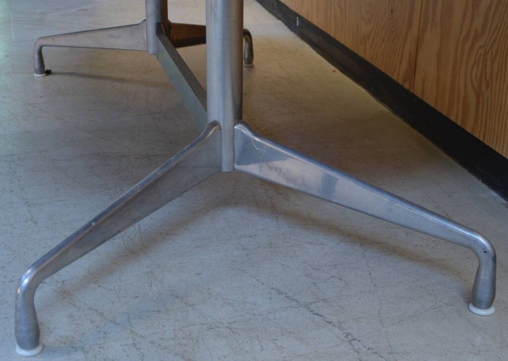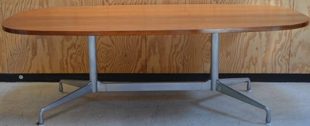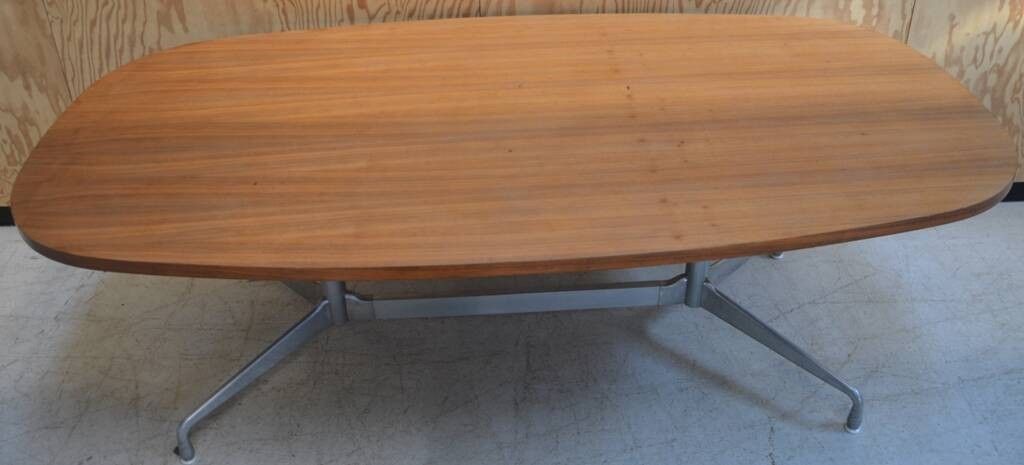 Grande table de salle à manger ou de réunion à double piètement cruciforme en fonte d'aluminium, plateau ovale en noyer du Colorado.