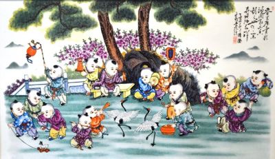 Grande plaque en porcelaine polychrome à décor d'enfants jou…