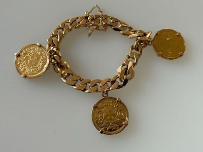 Gourmette en or 750 millièmes ornée de trois 20 francs Suiss…
