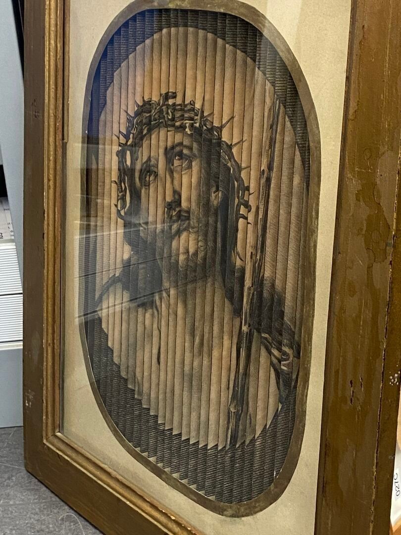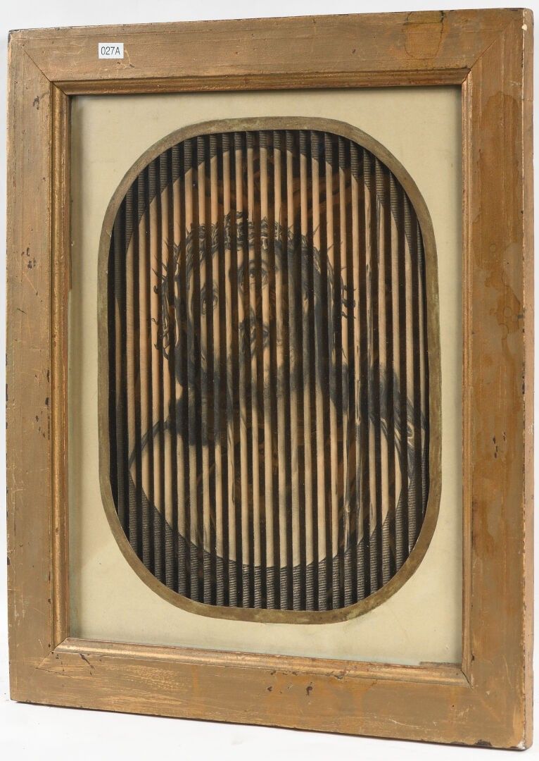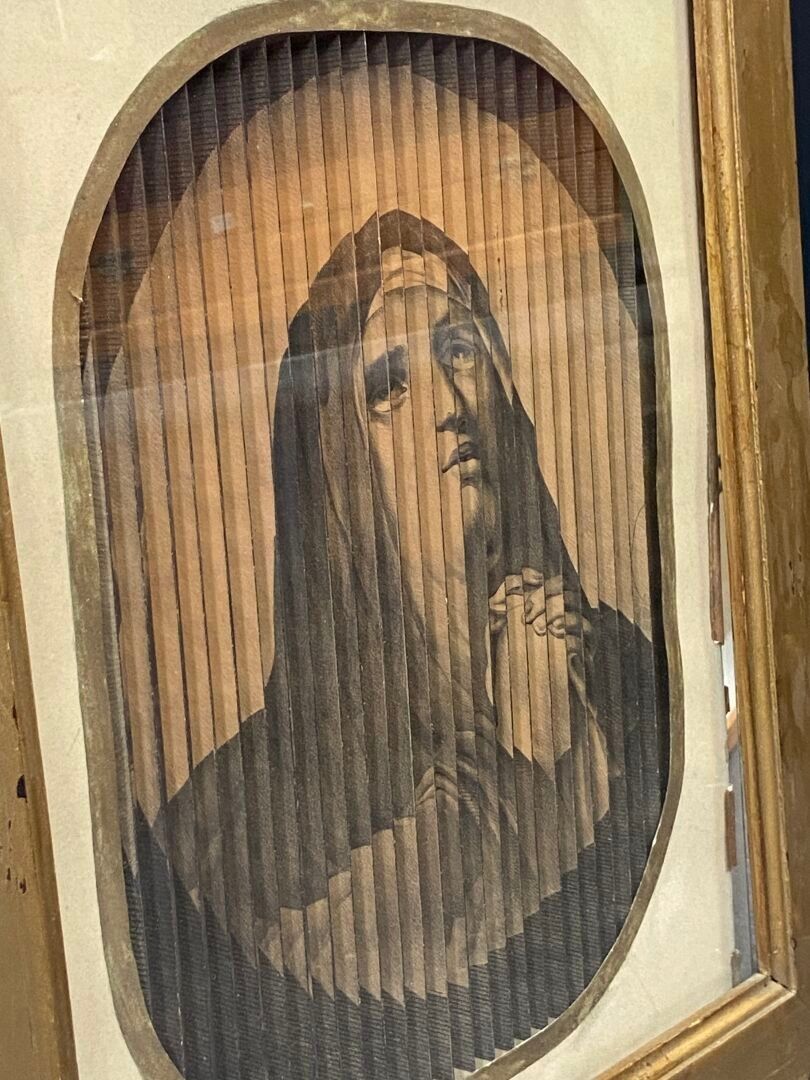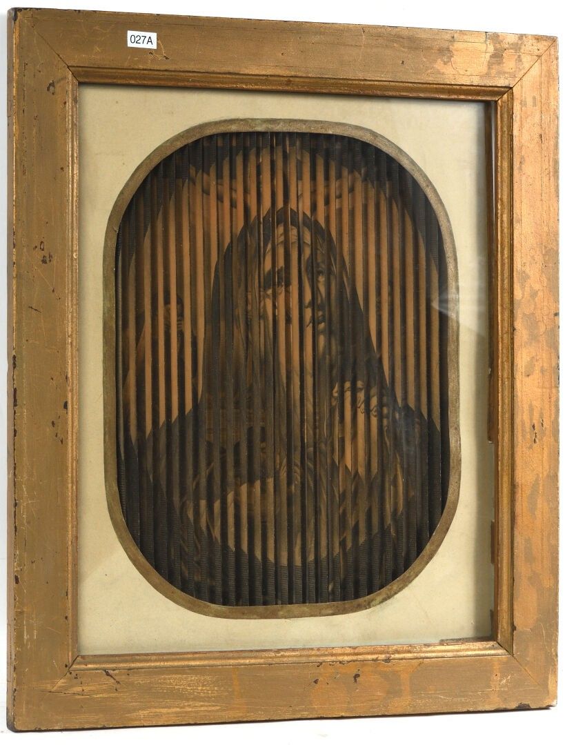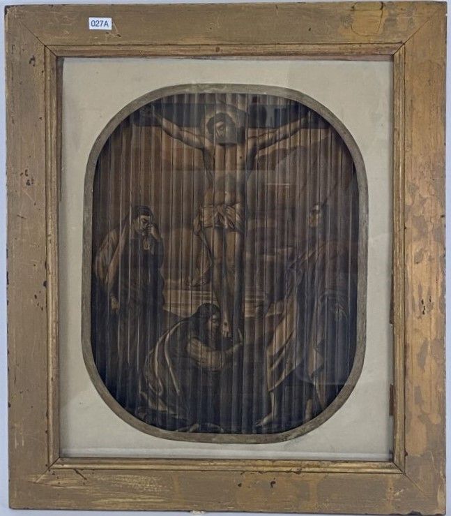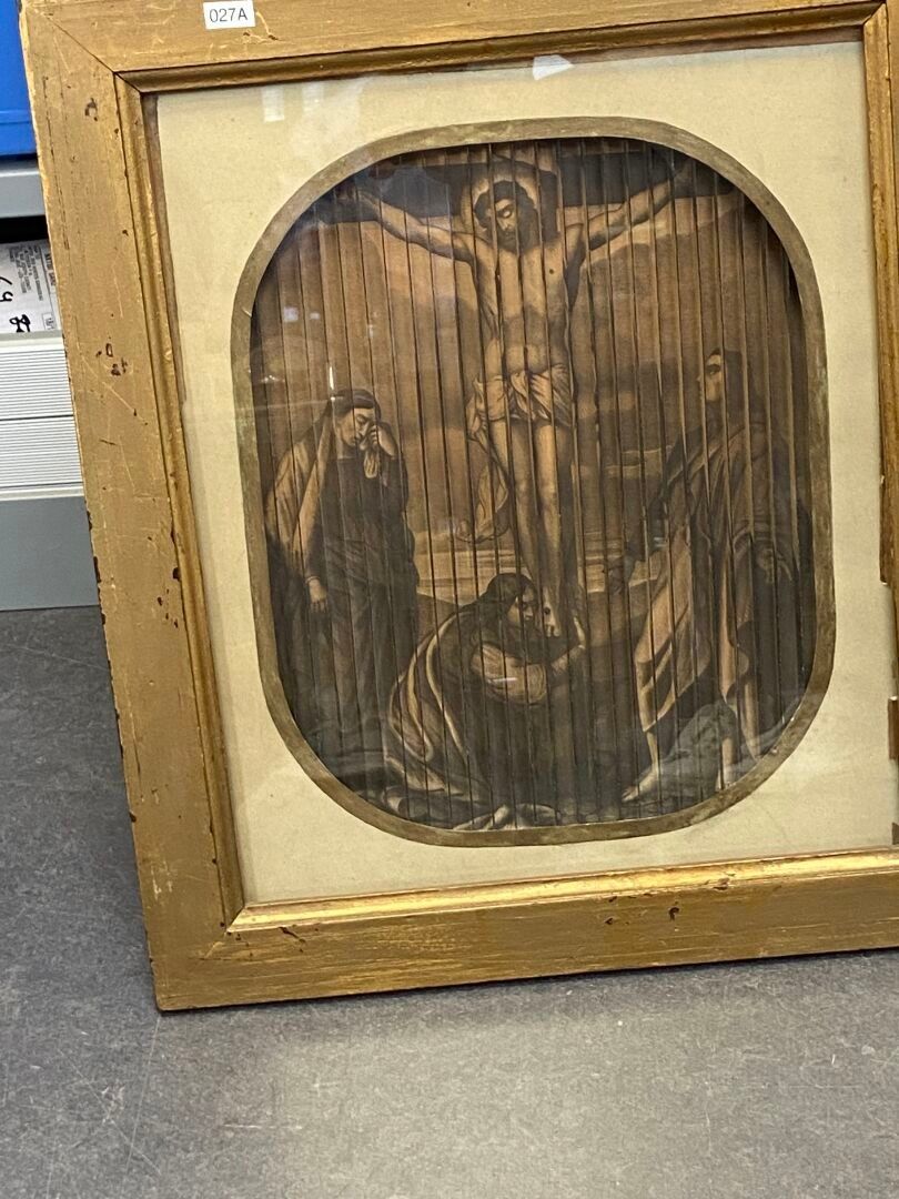 **École française XIXe. Portrait de la Vierge, Crucifixion et Ecce Homo. Gravure en noir en relief lenticulaire. 44 x 37 cm.