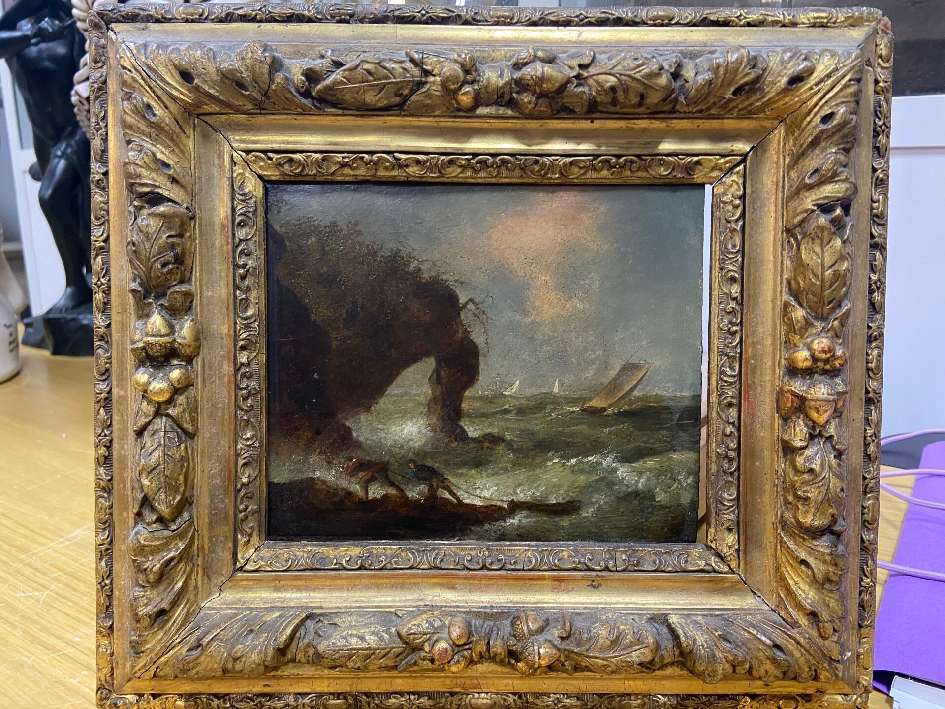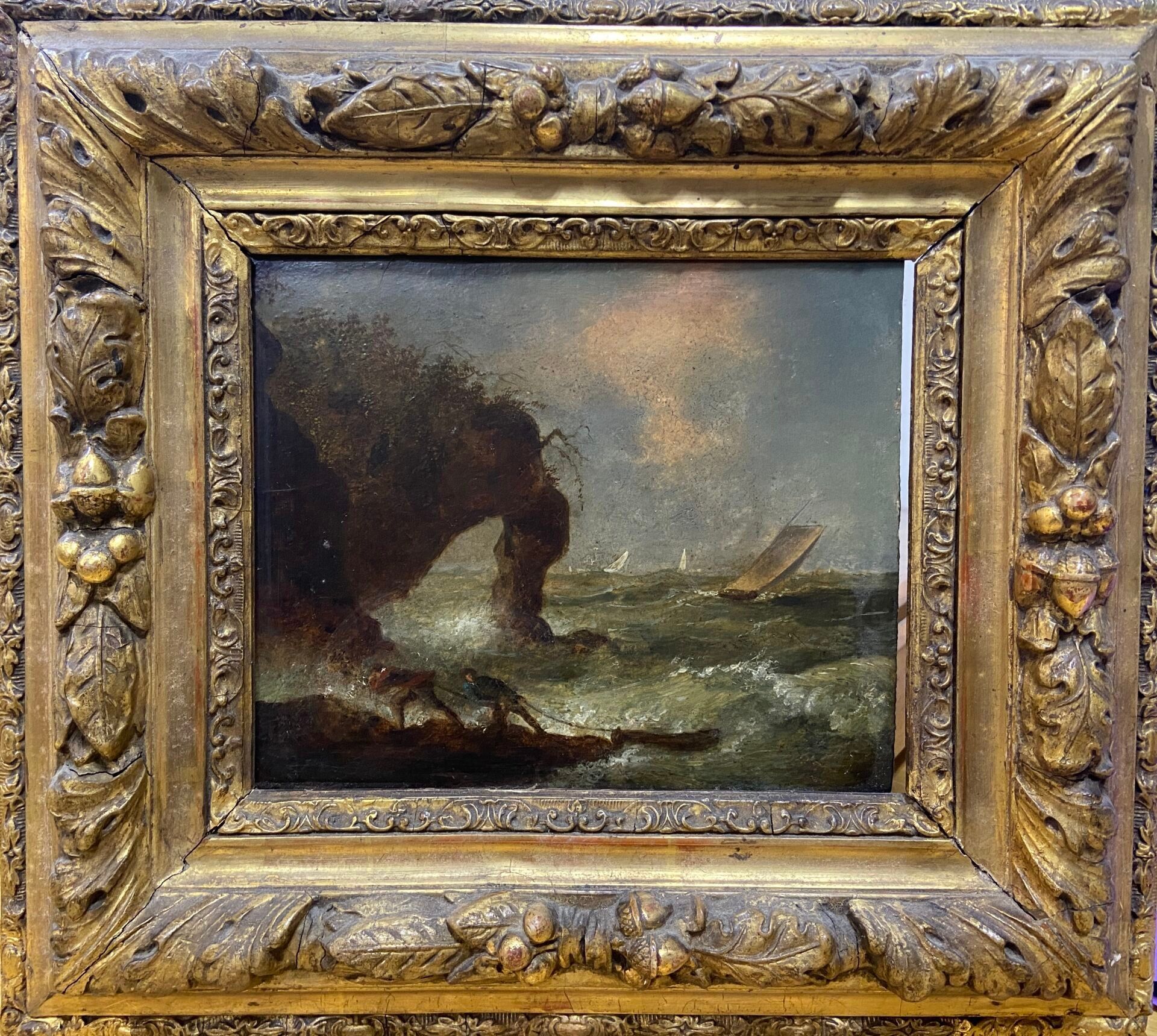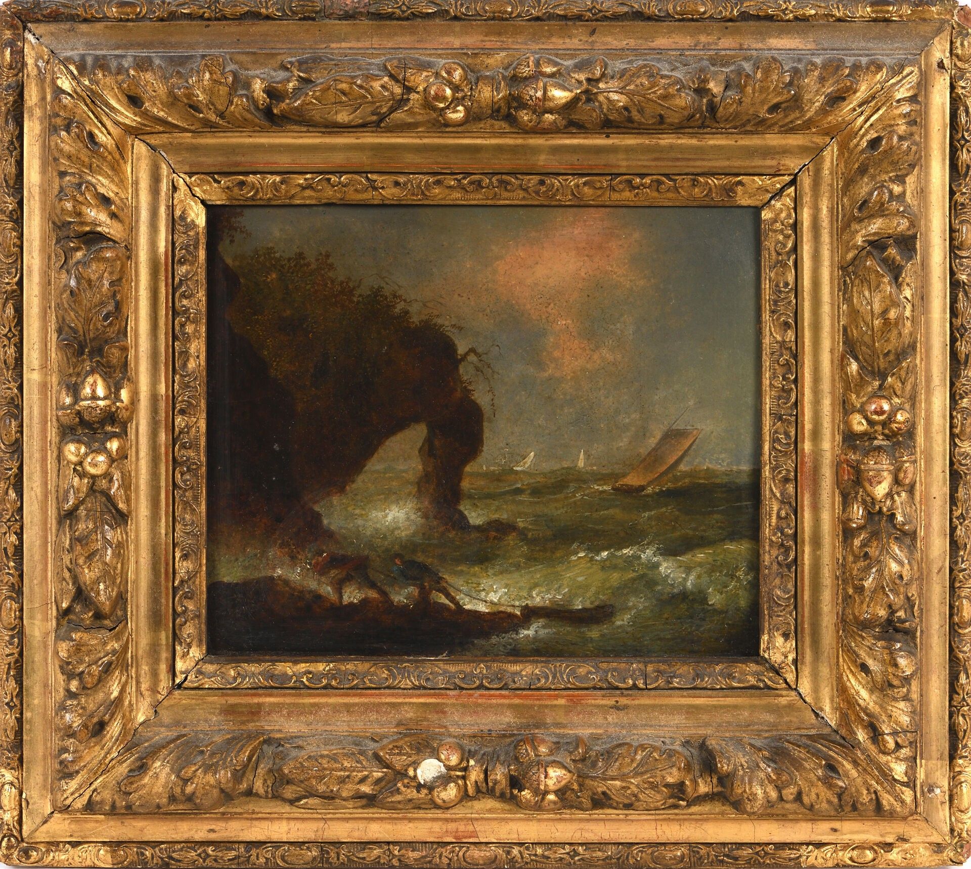 Cadre en bois et stuc doré à décor d'une frise de feuilles d'acanthe et de chêne, glands et feuilles.