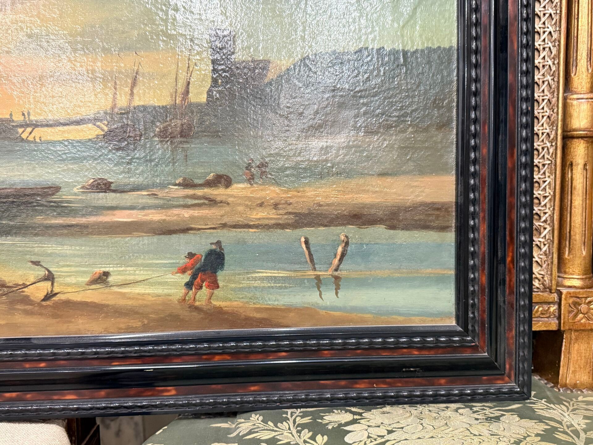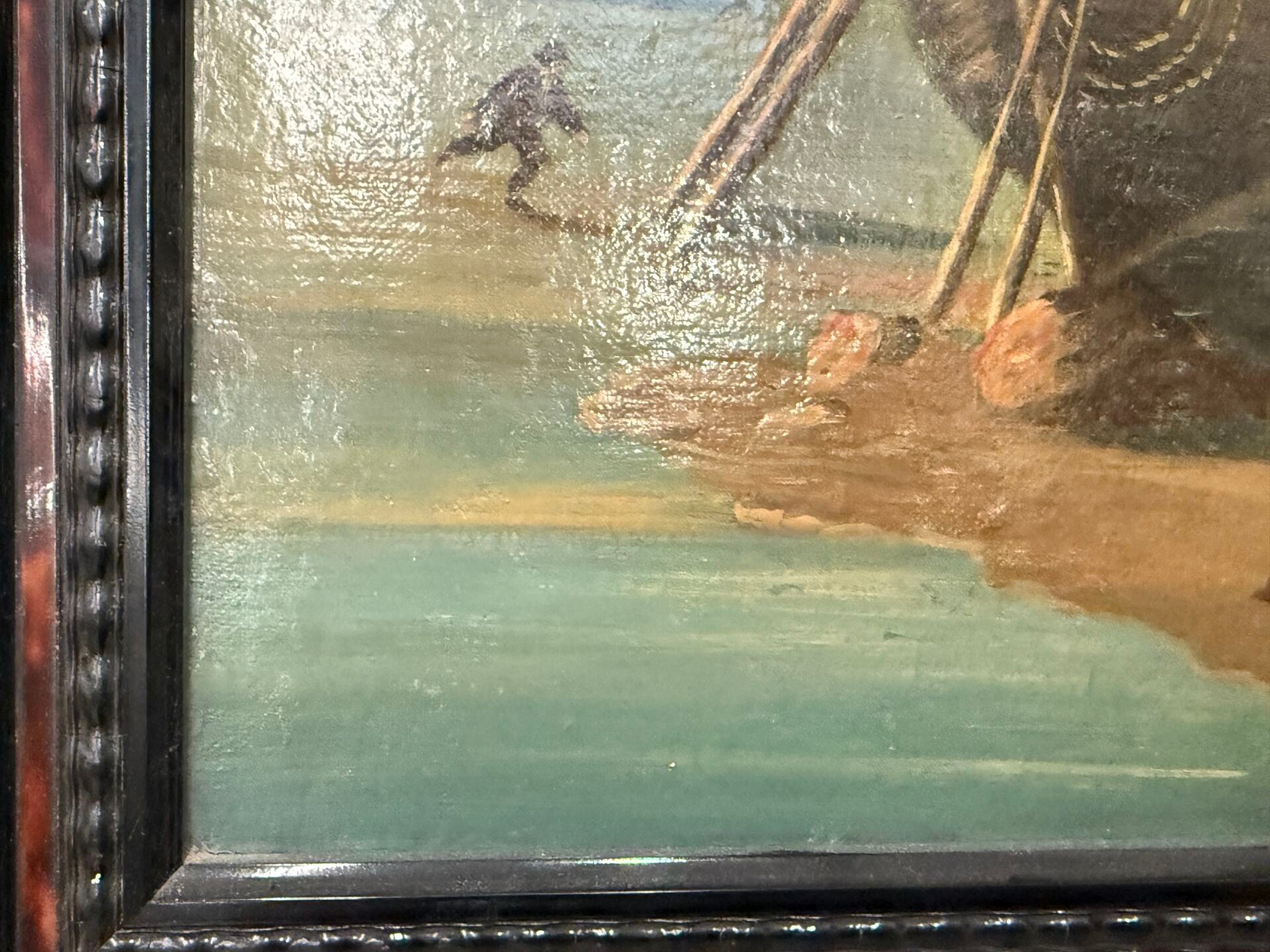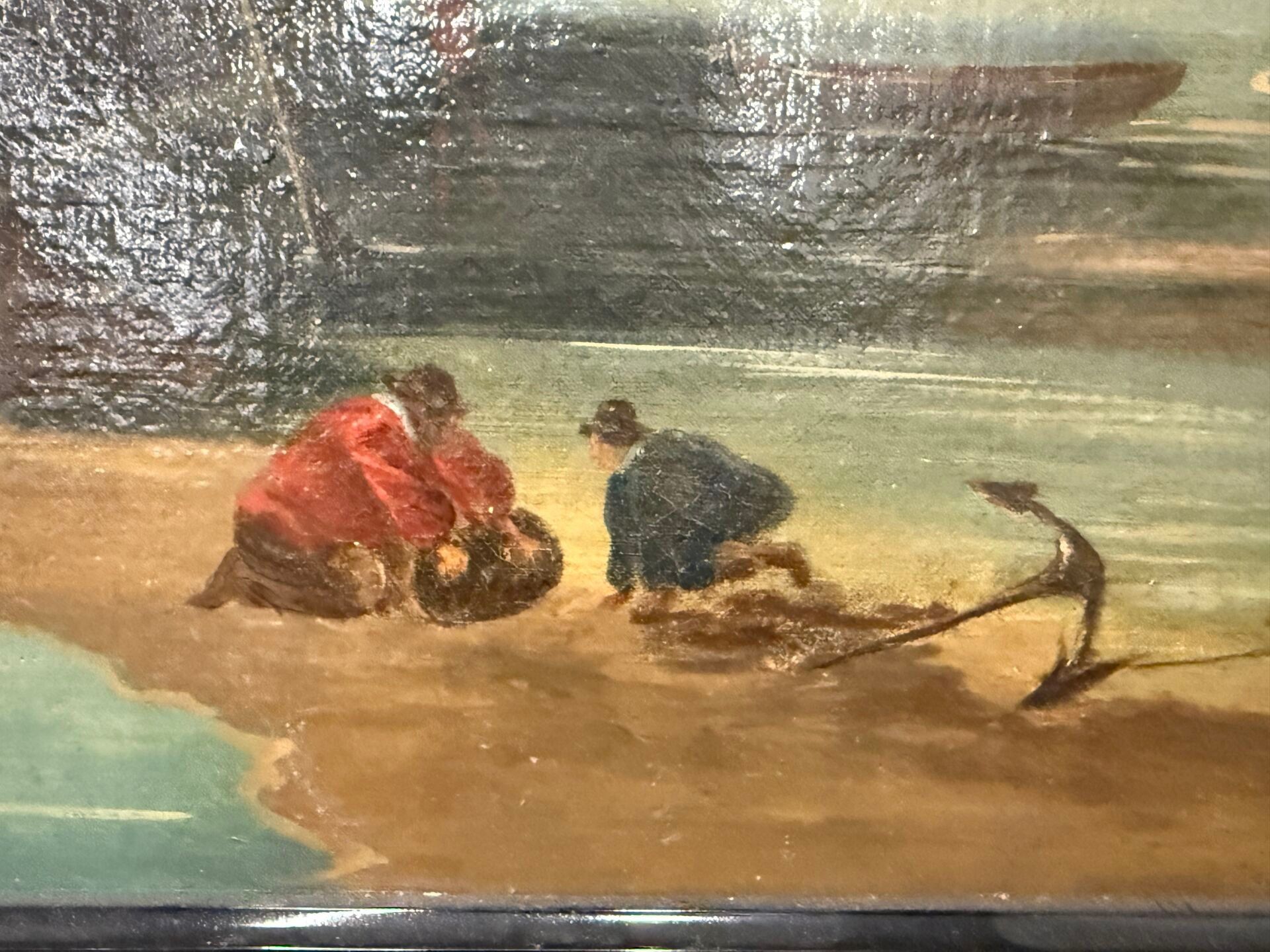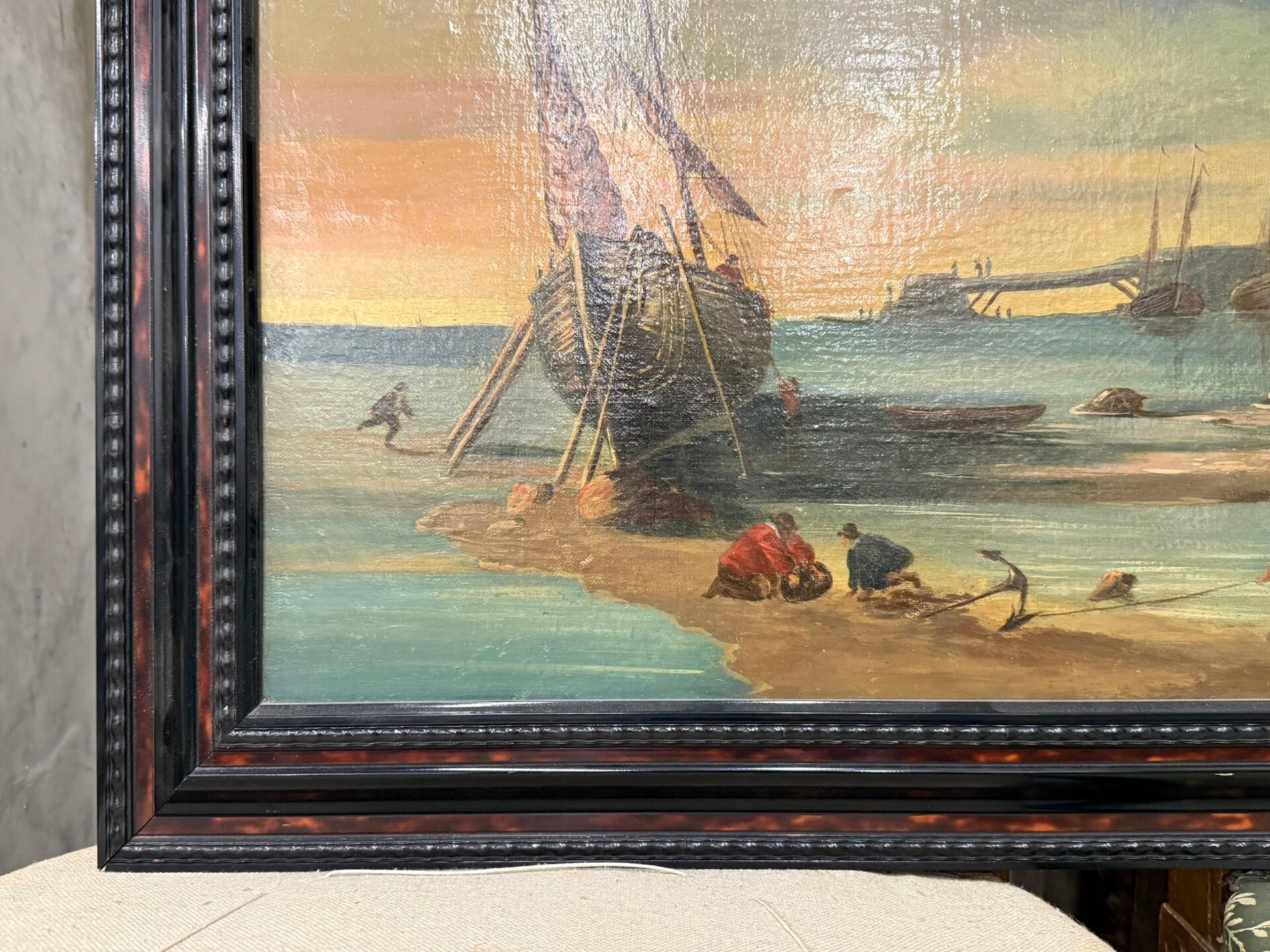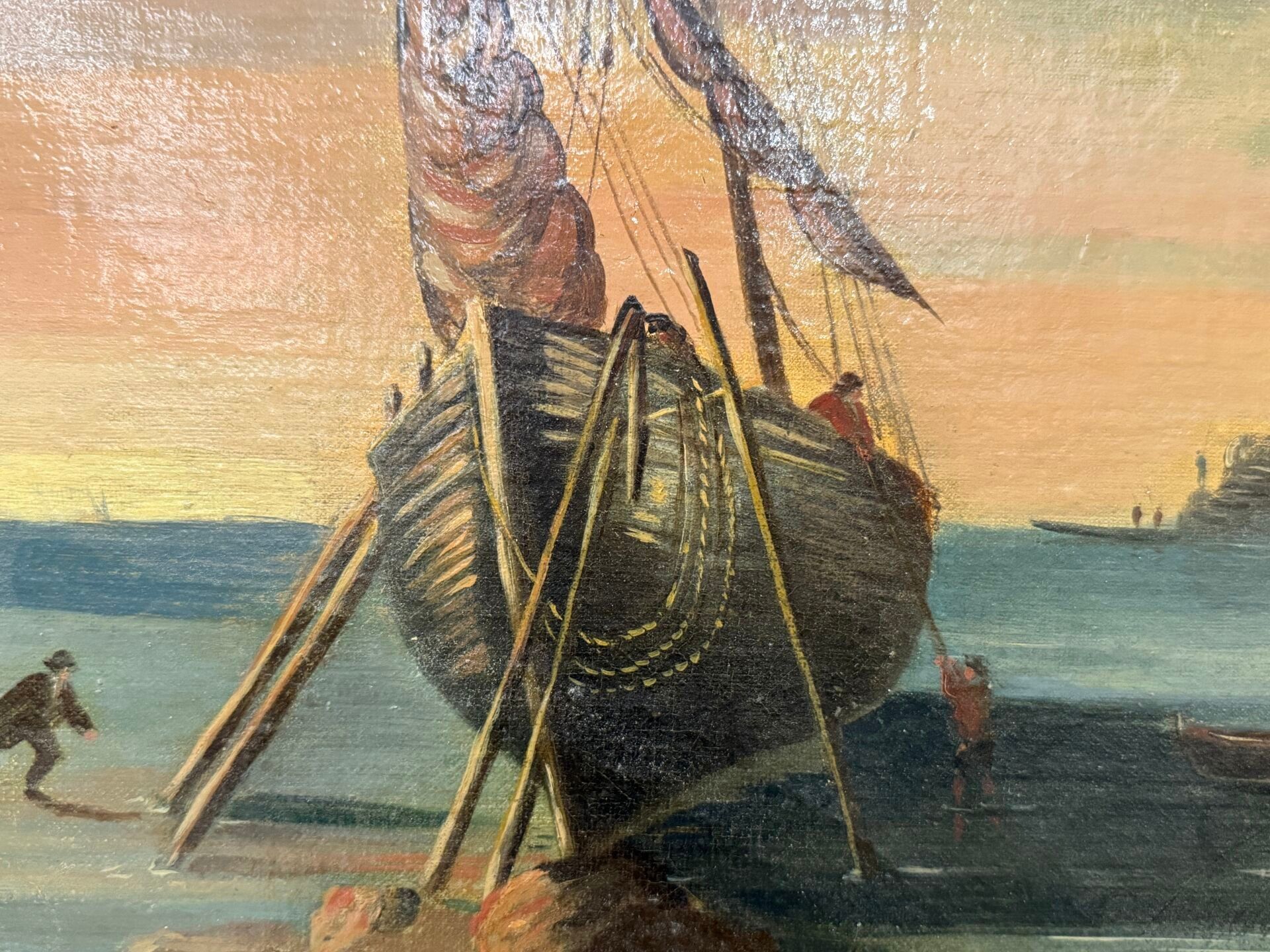 École italienne fin XVIIIe, début XIXe. Pêcheurs s'afférant sur la grève. Huile sur toile. 48 x 64 cm. (rentoilage).