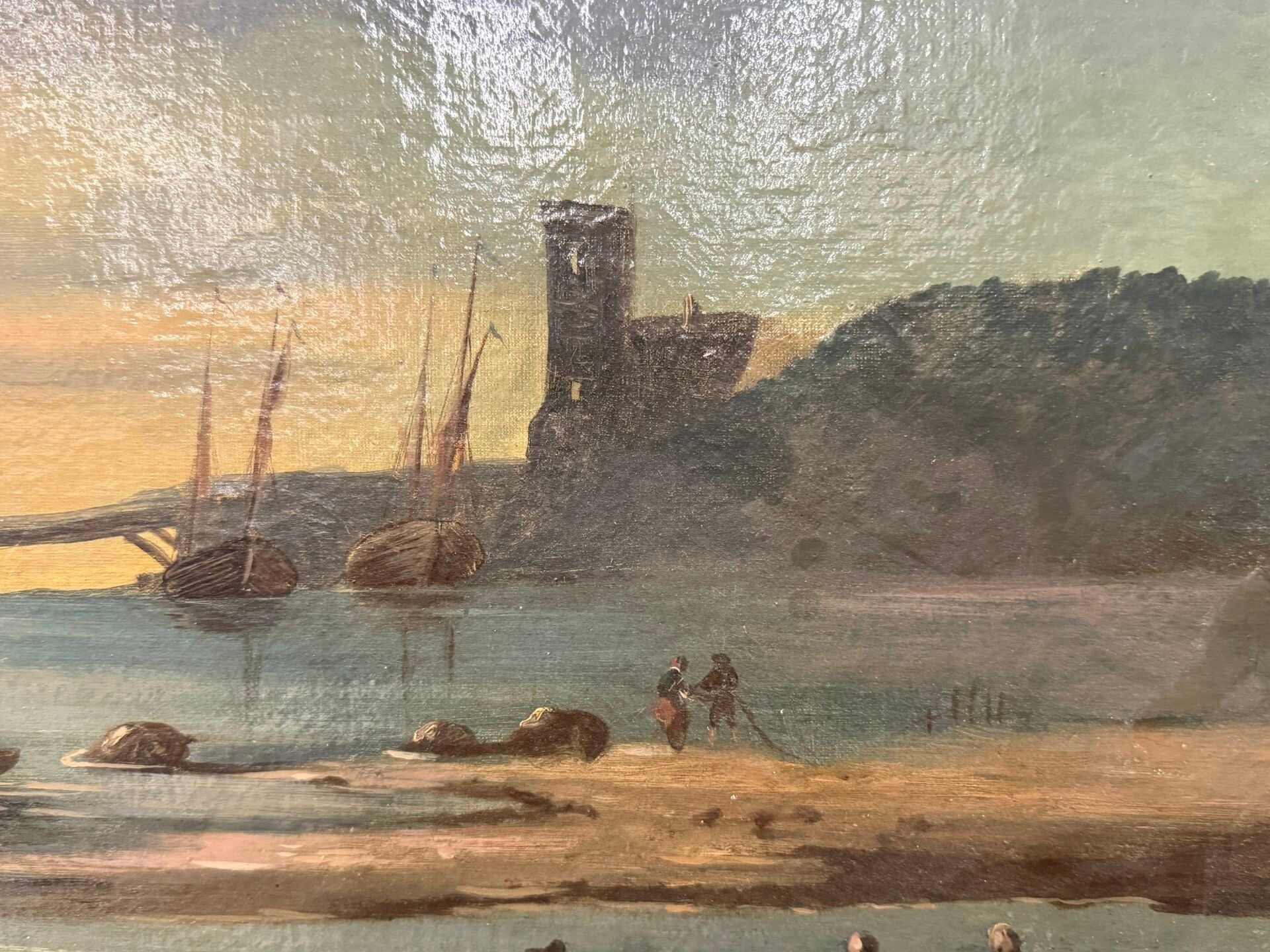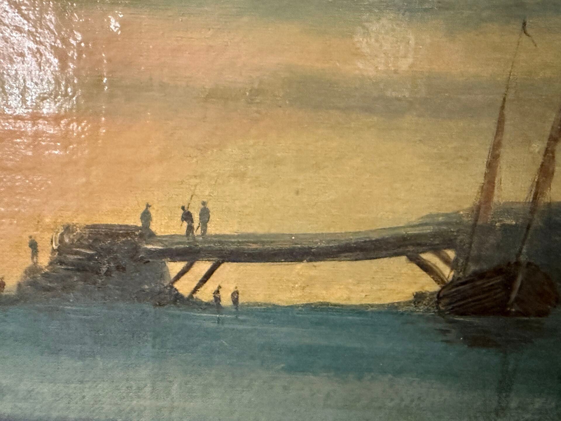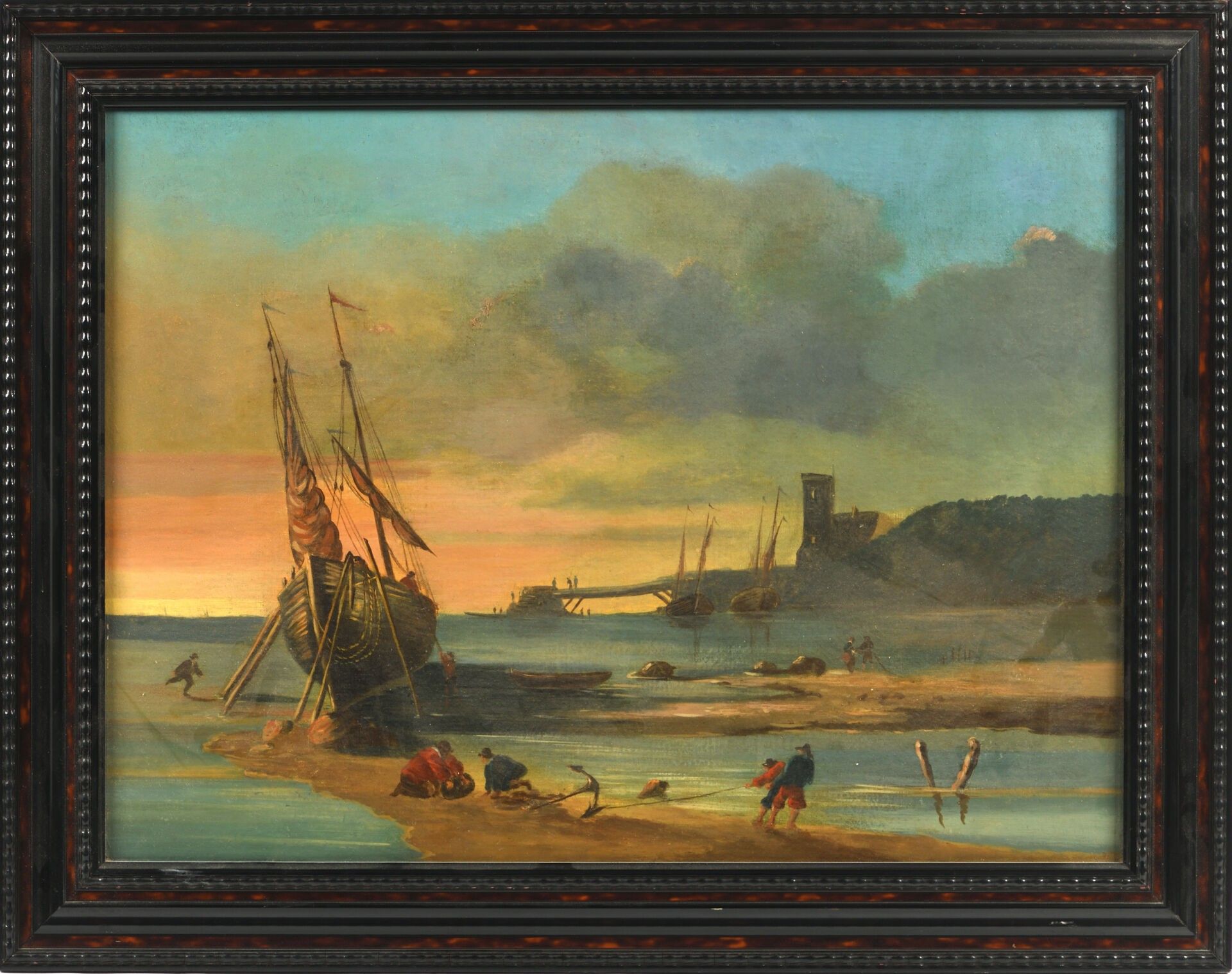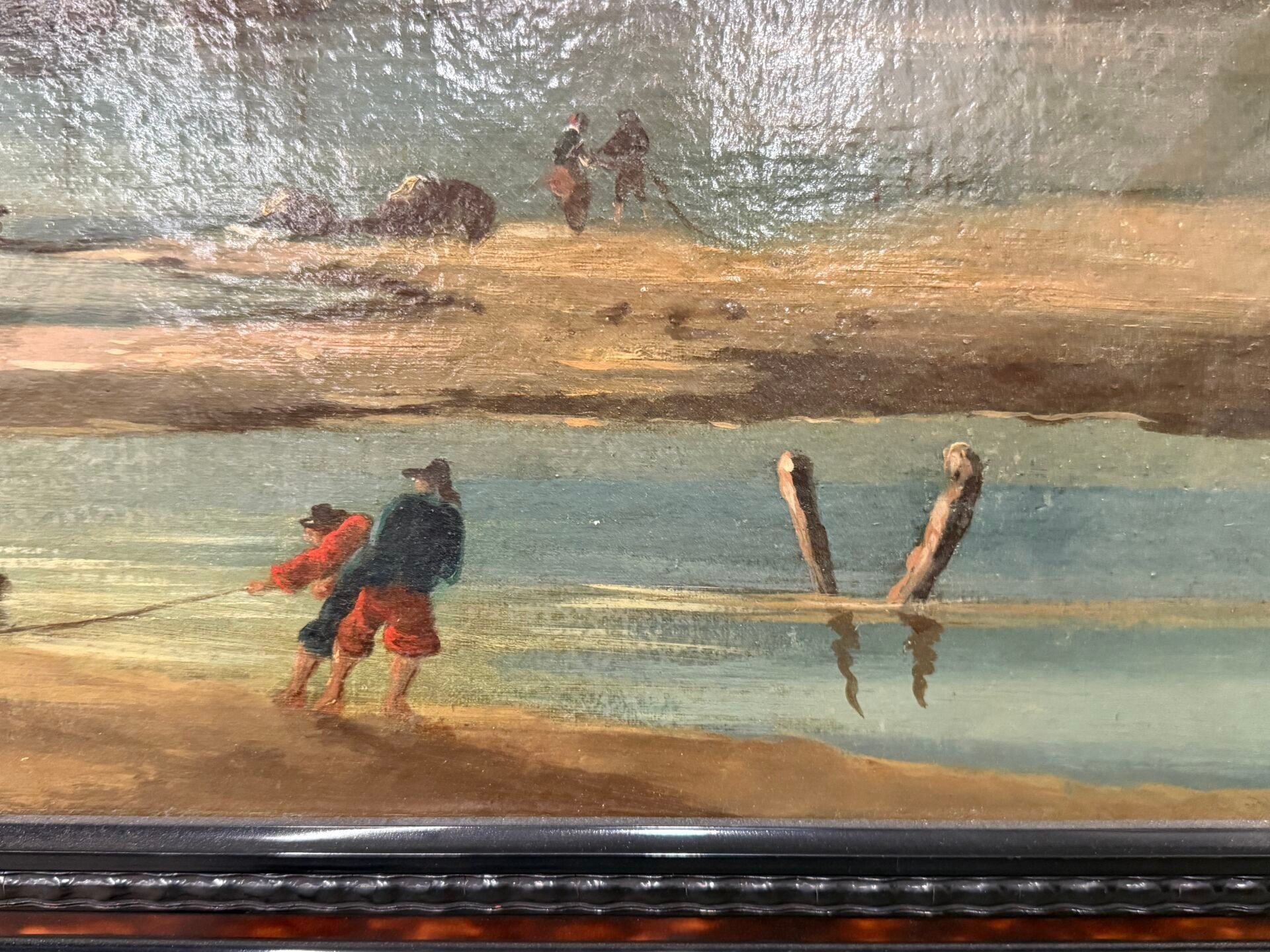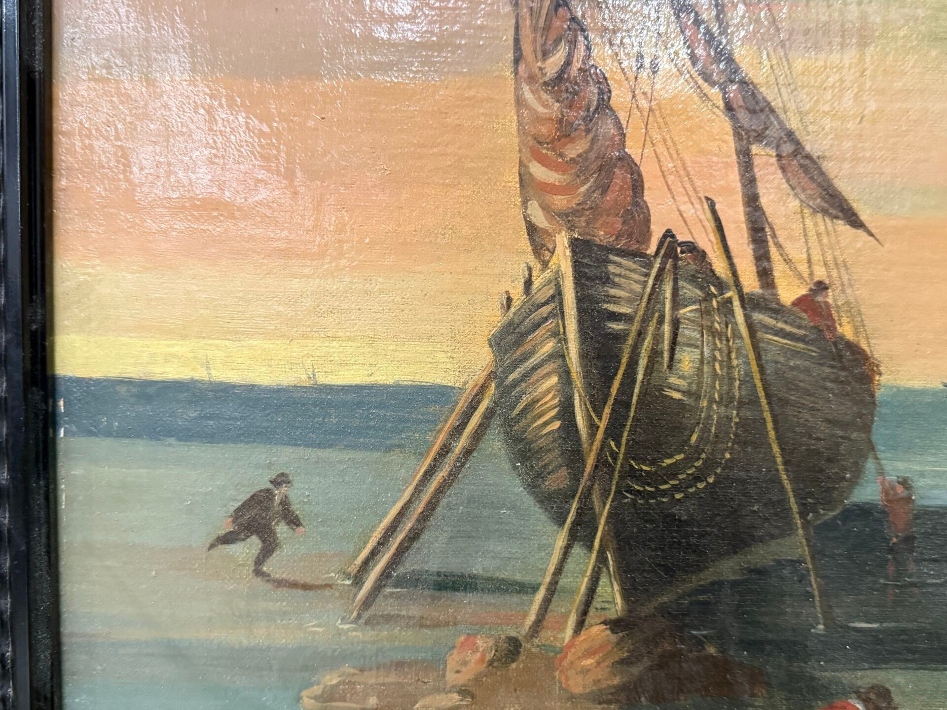 École italienne fin XVIIIe, début XIXe. Pêcheurs s'afférant sur la grève. Huile sur toile. 48 x 64 cm. (rentoilage).