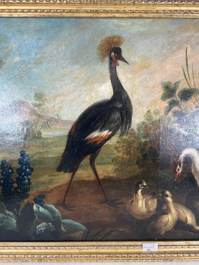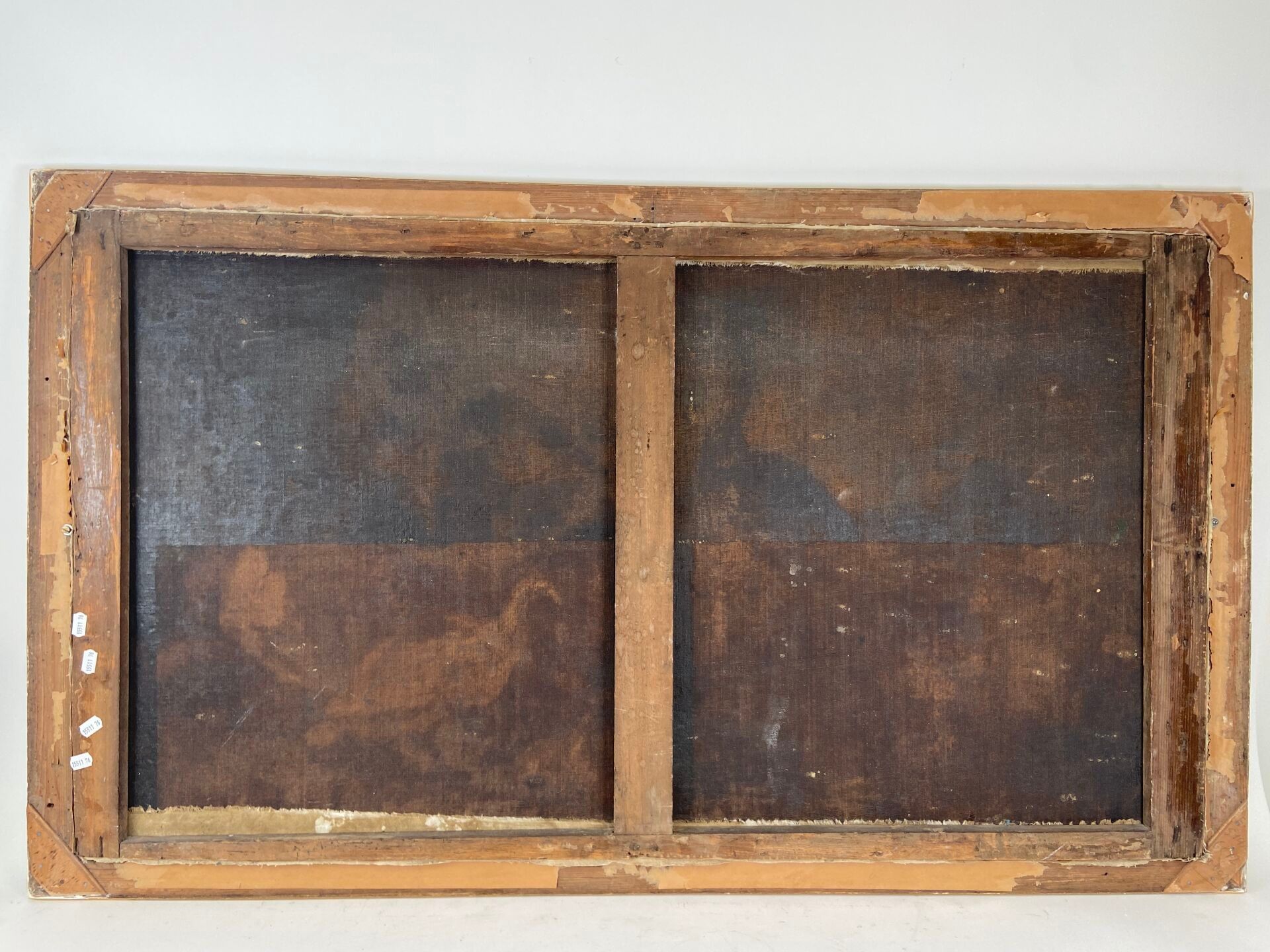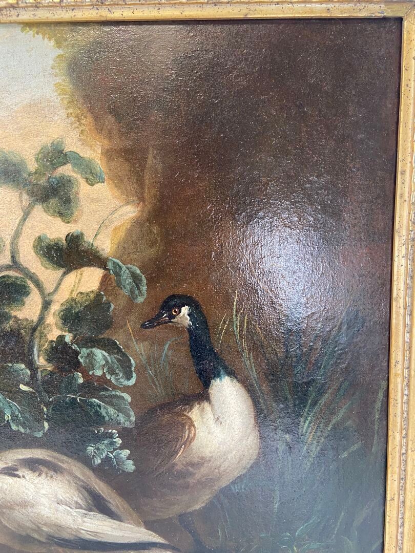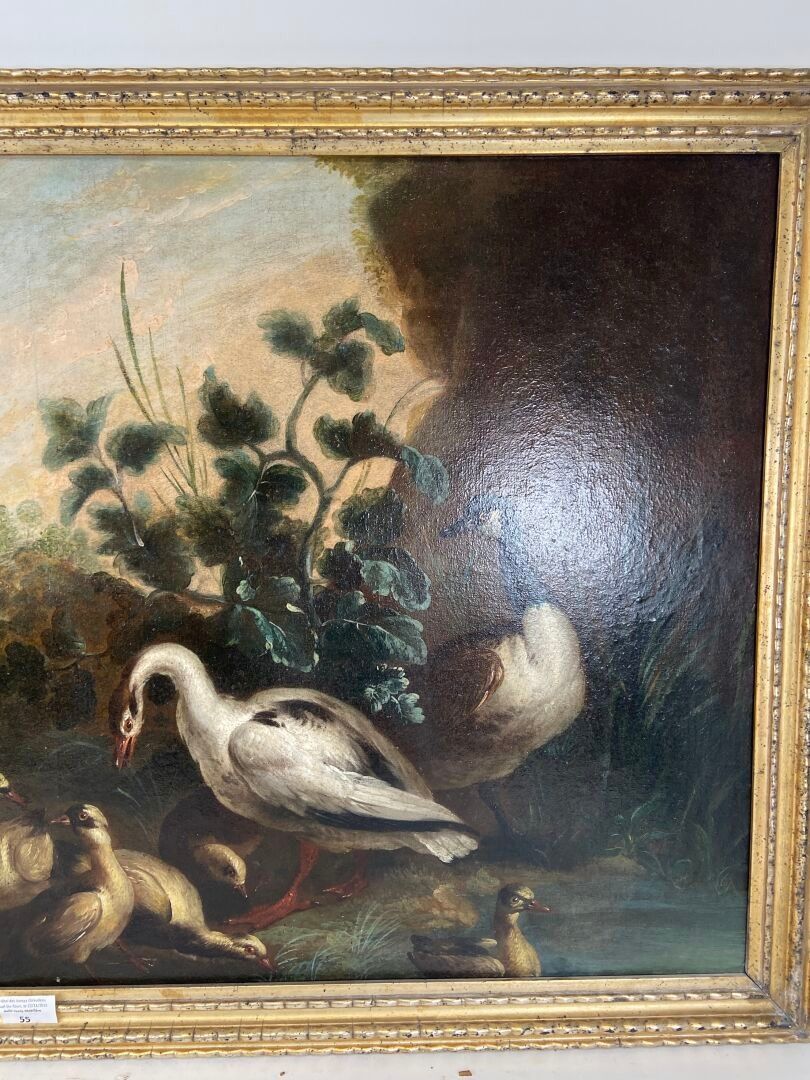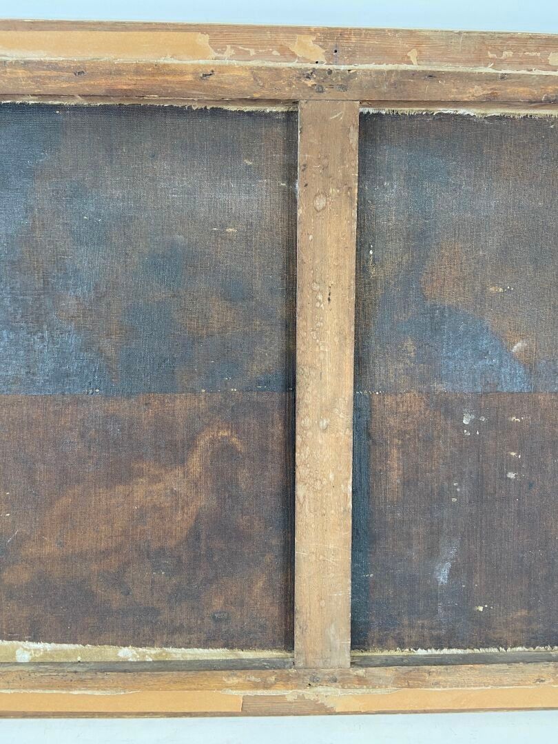 École française XVIIIe, entourage de Claude François DESPORTES (1695-1774). Gibier d'eau dans un paysage. Huile sur toile, élément de dessus de porte. 58 x 102 cm. (rentoilage). Expert : René MILLET