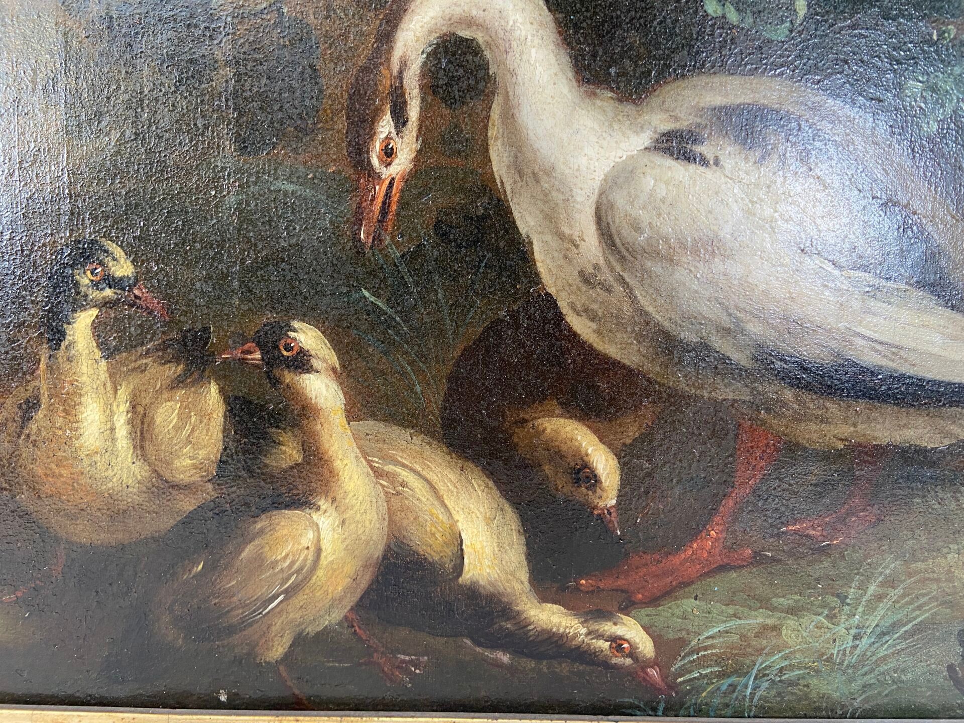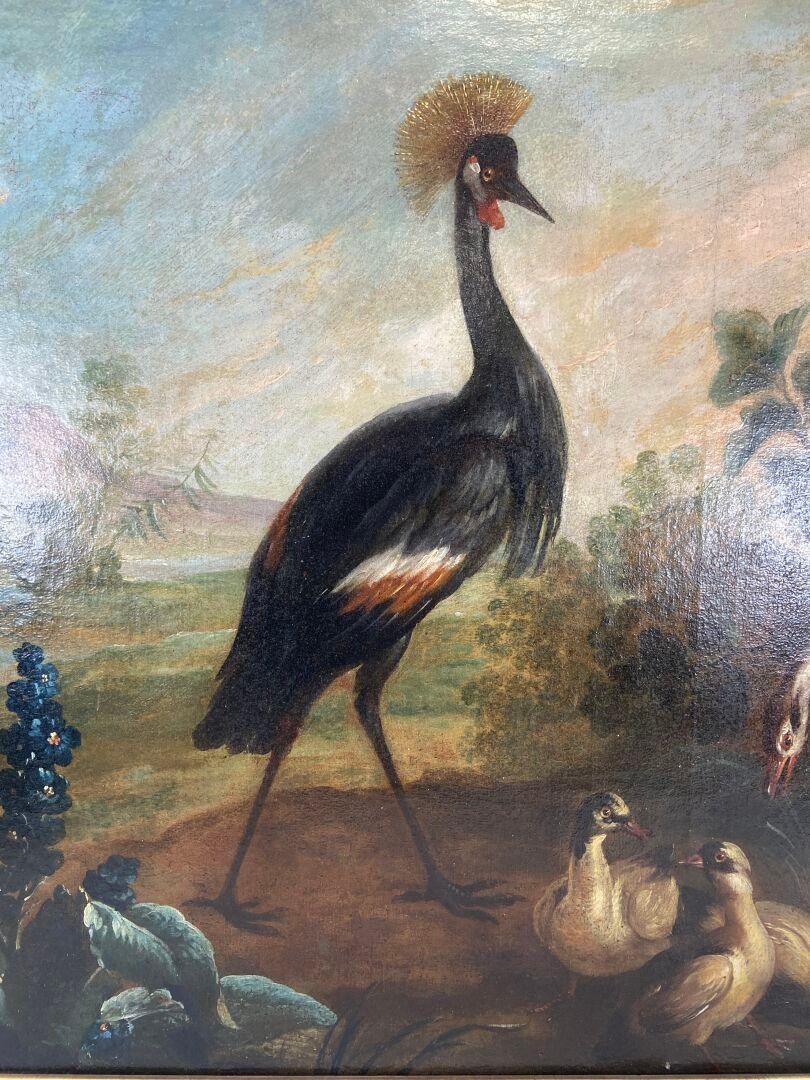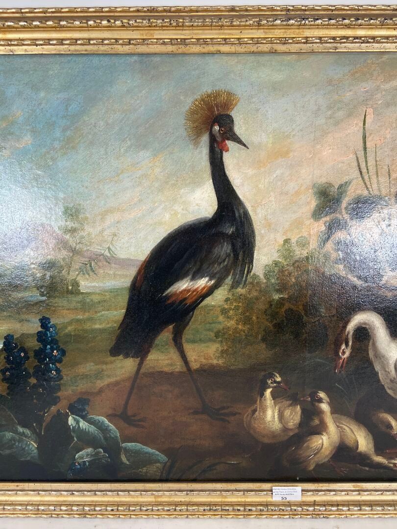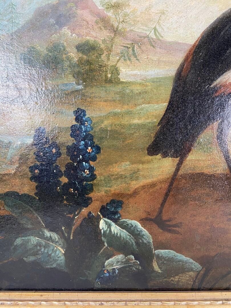 École française XVIIIe, entourage de Claude François DESPORTES (1695-1774). Gibier d'eau dans un paysage. Huile sur toile, élément de dessus de porte. 58 x 102 cm. (rentoilage). Expert : René MILLET