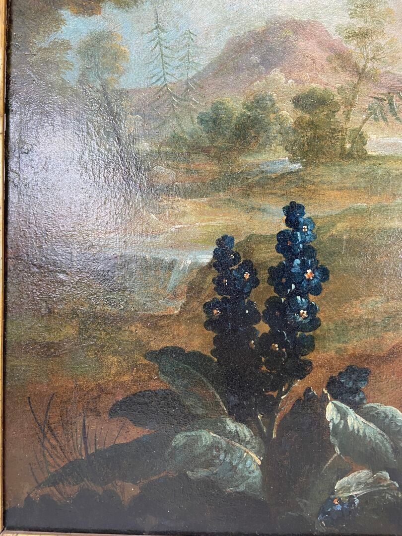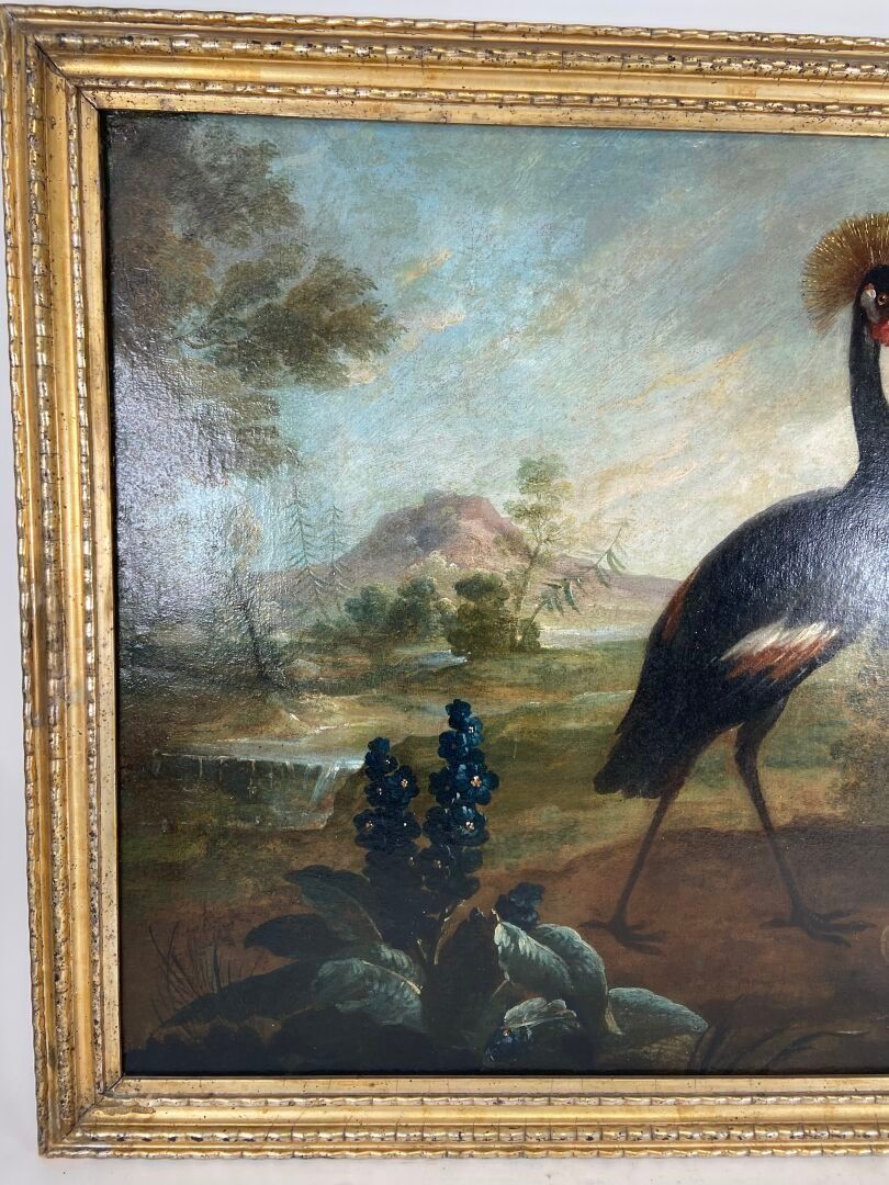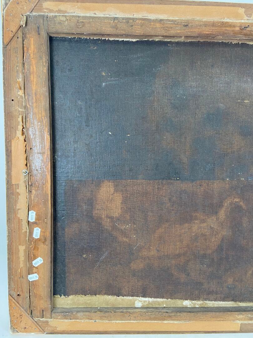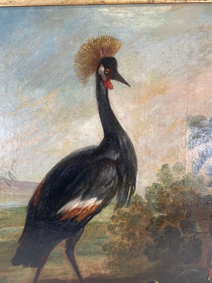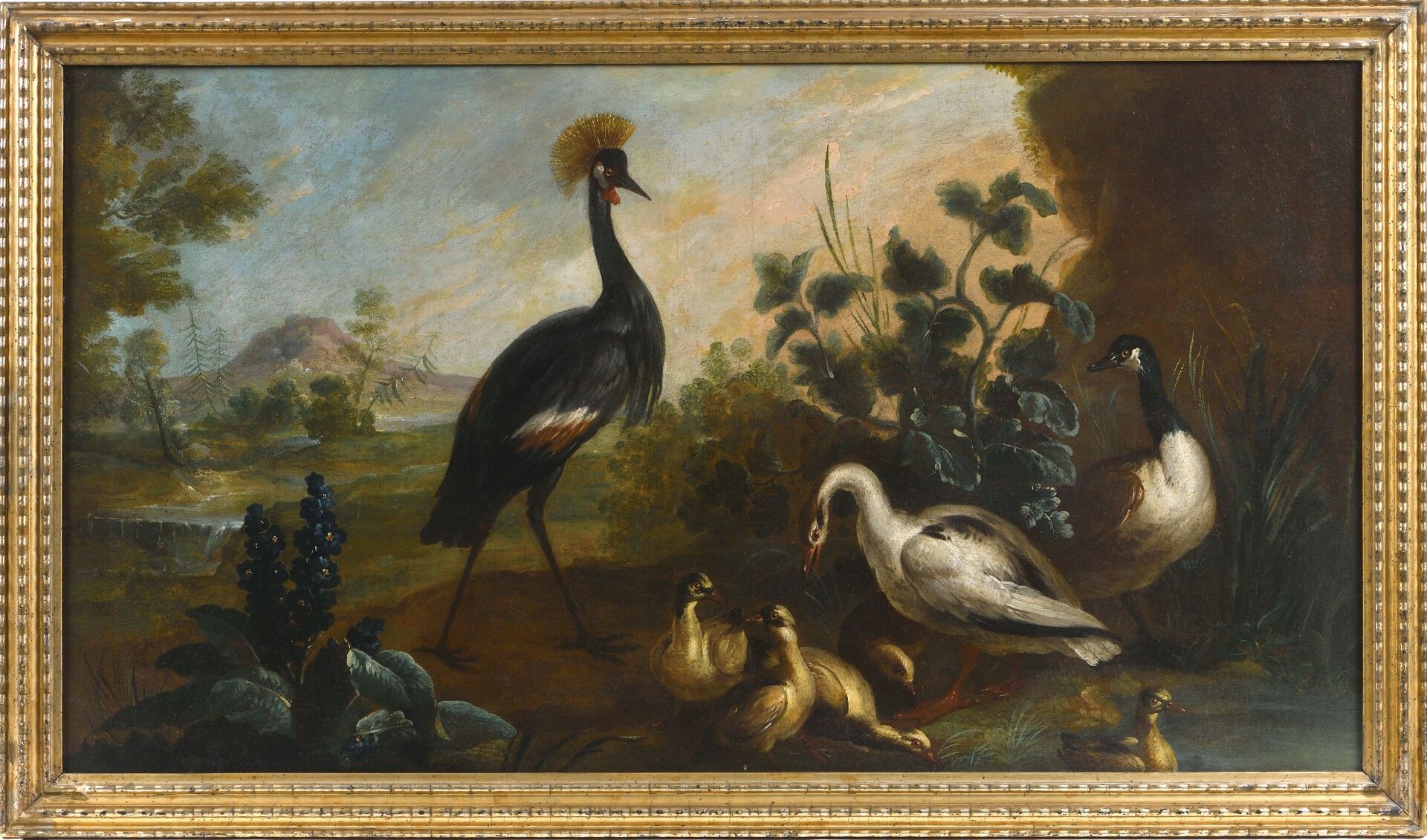 École française XVIIIe, entourage de Claude François DESPORTES (1695-1774). Gibier d'eau dans un paysage. Huile sur toile, élément de dessus de porte. 58 x 102 cm. (rentoilage). Expert : René MILLET