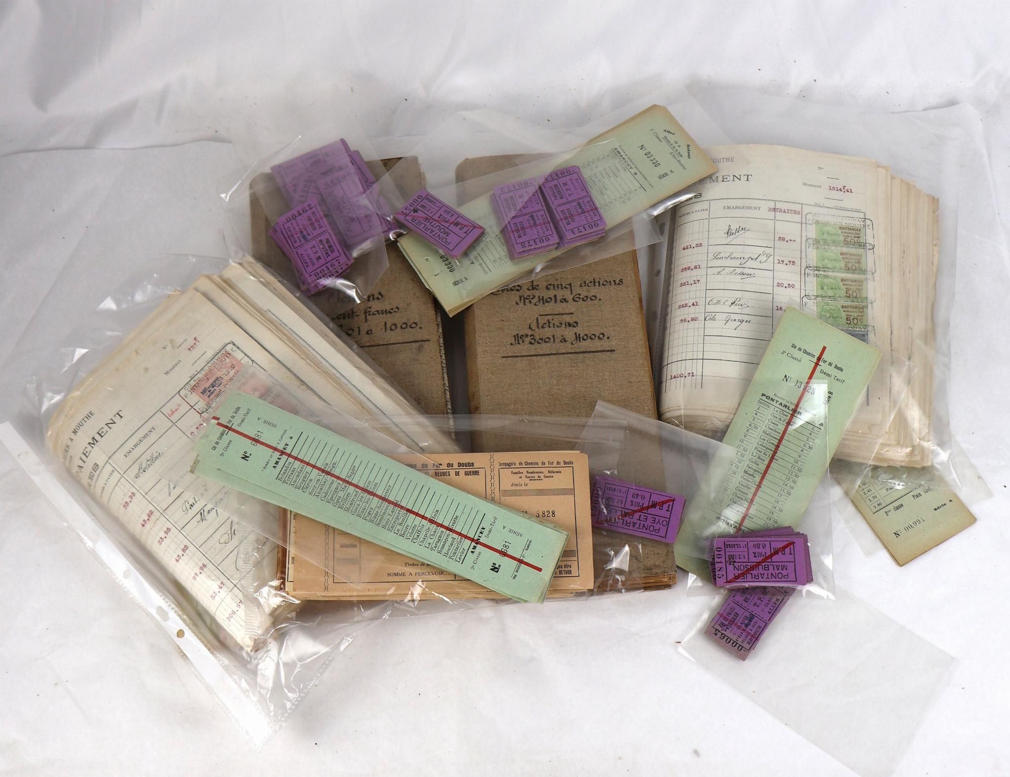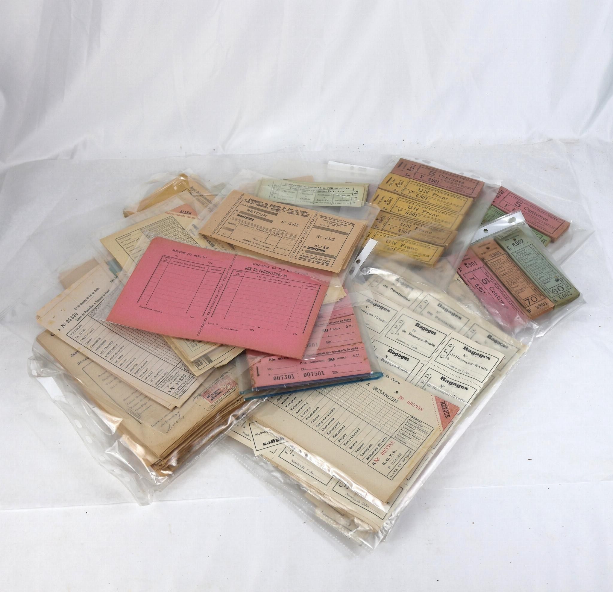 Billets avec souches : Pontarlier-Foncine-le-Haut (Billets plein et demi-tarif), Pontarlier-Besançon, tramway de Pontarlier à Mouthe, Souillot à Pontarlier. Chemins de fer du Doubs. Fiches d’avis de réception d’un colis (Vierges). Billets à destination ou en provenance de Pontarlier, Besançon-Rivottes (Aller et Retour), Entreportes, Amancey, Bolandoz, Cléron, Montrond, Montrond, Cléron, Beure, Busy-Larnod, Souillot, Chaux-Neuve, Amancey, Houtaud, Sombacour. Billets avec souches, Billets « Chien ». Avis de dépôt, de fournitures, bagagerie de Pontarlier et de Besançon, etc.