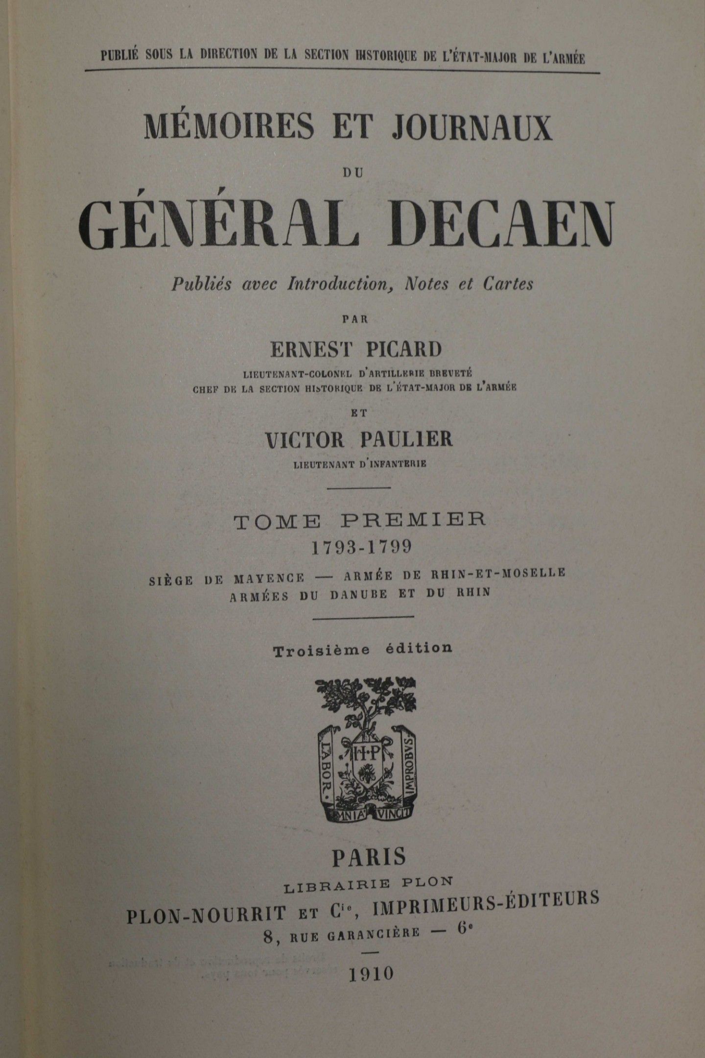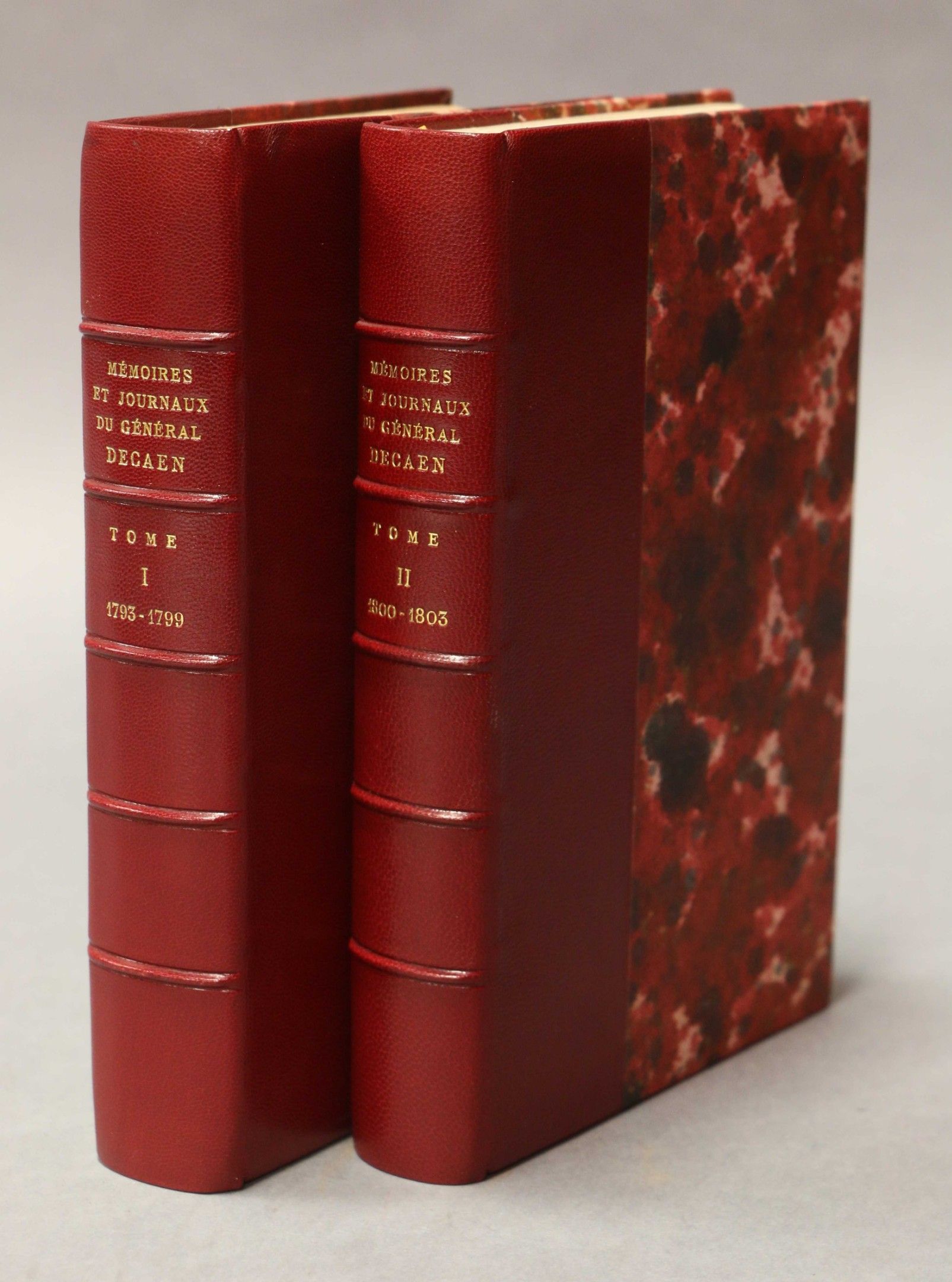 DECAEN (Général). Mémoires et journaux du général Decaen publiés avec introduction, notes et cartes. Troisième édition. Paris, Plon, 1910-1911, 2 vol. in-8, demi-rel. bas., dos à nerfs, couv. conserv. (rel. mod.). Avec un portrait en frontispice. Sans les cartes.