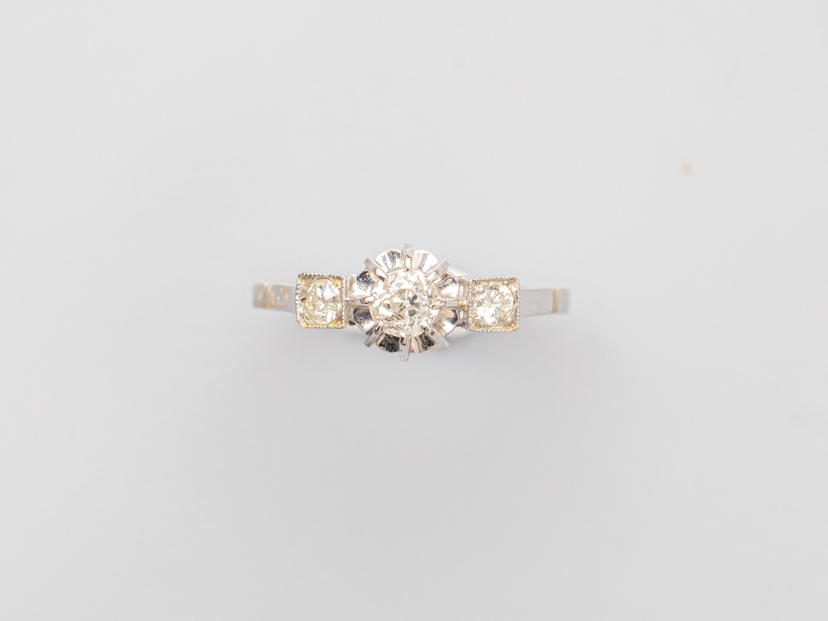 Bague en or gris 750°/°° (18K), sertie d'un diamant taille ancienne de 0.20 ct environ, épaulé de deux petits diamants taille ancienne. 2 g. TDD 57. Largeur: 7.3 mm.