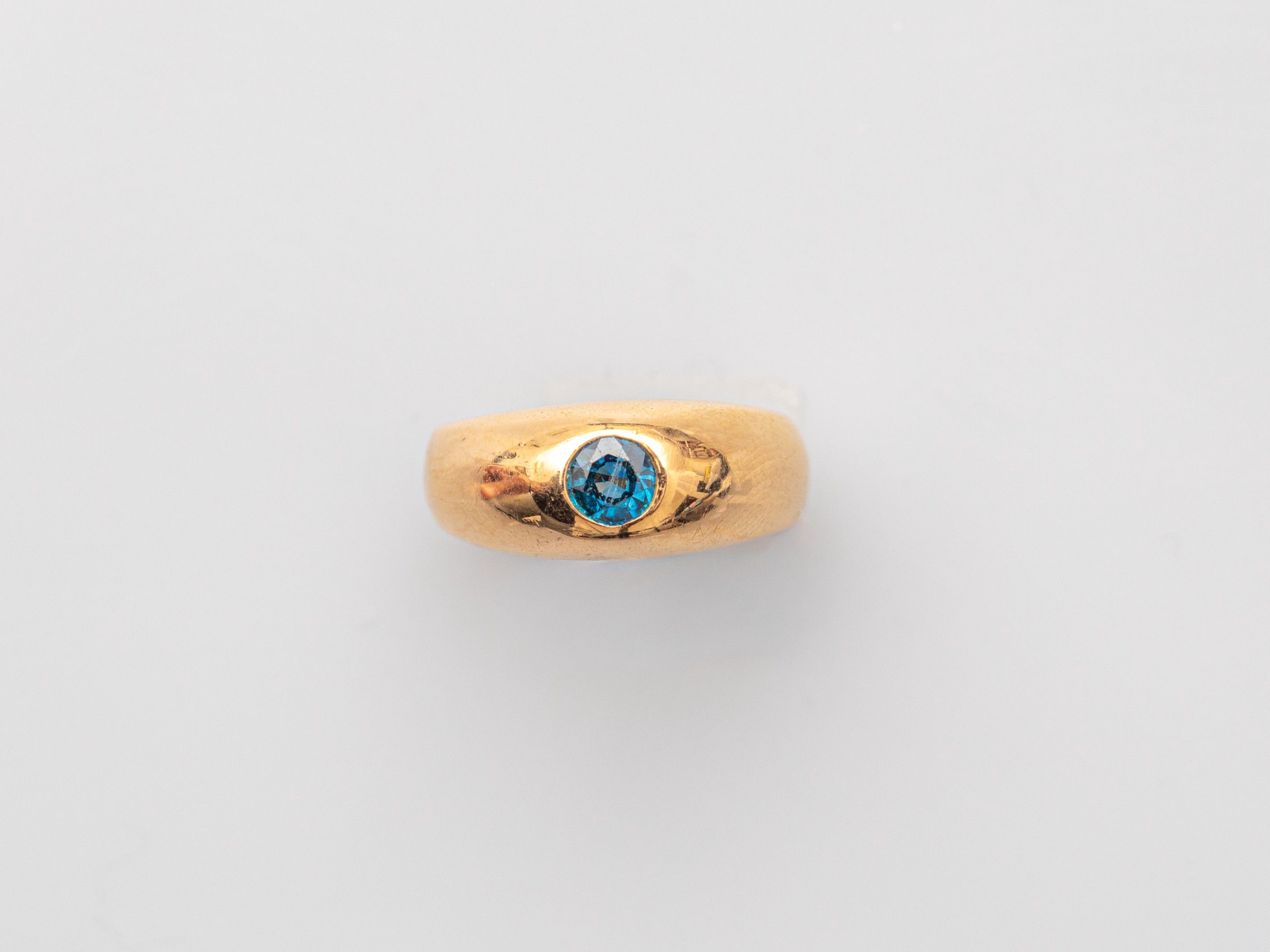 Petite chevalière en or jaune 750°/°° (18K), sertie d'un petit saphir rond facetté (trace de rayures). 5.8 g. TDD 46. Largeur: 7.1 mm. Poinçon tête d'aigle.