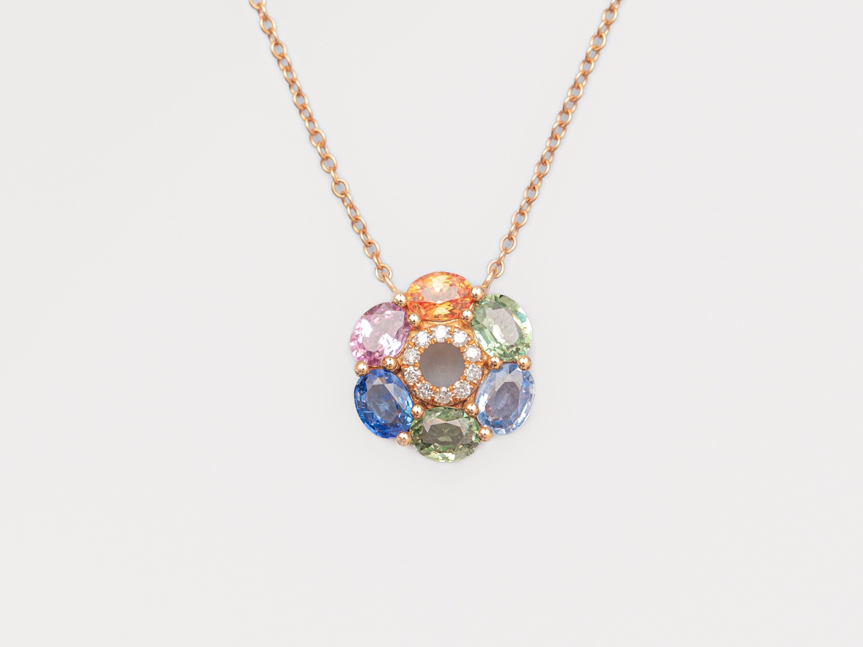 Collier en or rose 750°/°° (18K), à maille jaseron, motif ovale serti de saphirs multicolores taille ovale (1.5ct) et de petits diamants taille brillant. 2.2 g. Longueur ajustable grâce à un coulant (max 43 cm). Diamètre: 11 mm. Poinçon tête d'aigle.