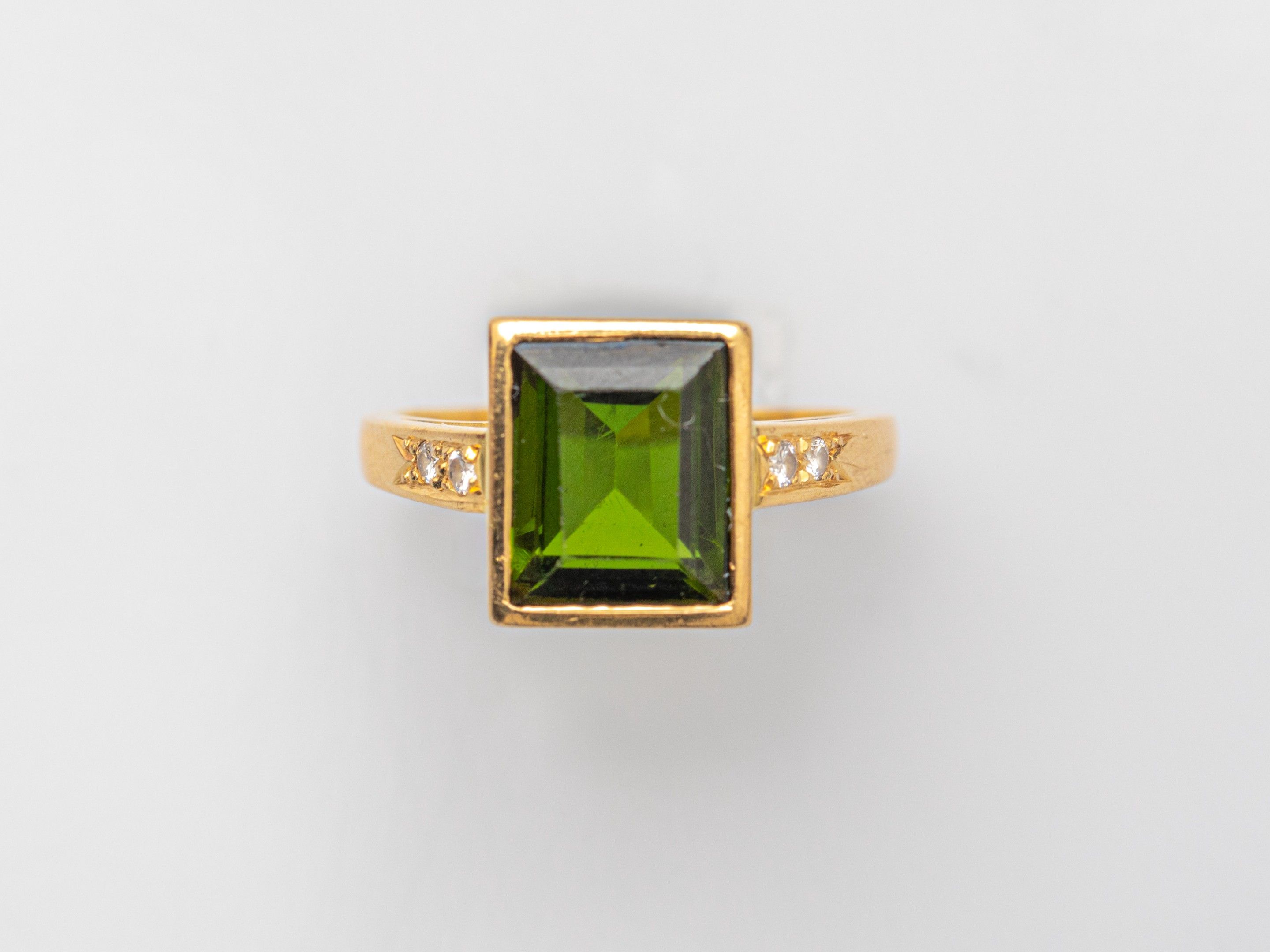 Bague en or jaune 750°/°° (18K), sertie d'une tourmaline verte rectangulaire à pans, épaulée de quatre petits diamants taille brillant. 5.8 g. TDD 56. Largeur: 11.8 mm. Poinçon tête d'aigle.