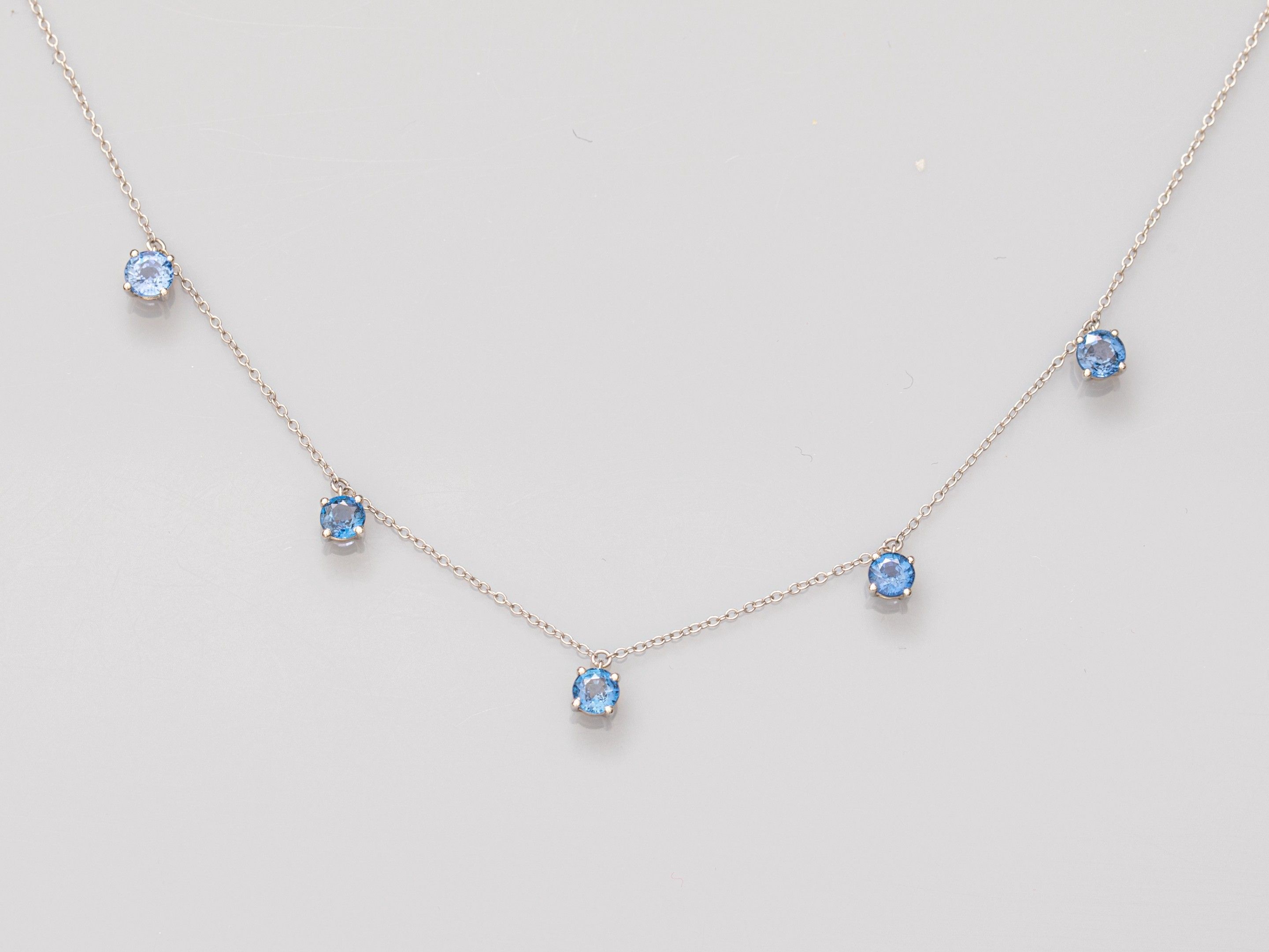 Collier draperie en or gris 750°/°° (18K), à maille forçat, orné de cinq saphirs ronds facettés en pampille pour 1.80 ct environ. 1.9 g. Longueur: 45 cm. Poinçon tête d'aigle.