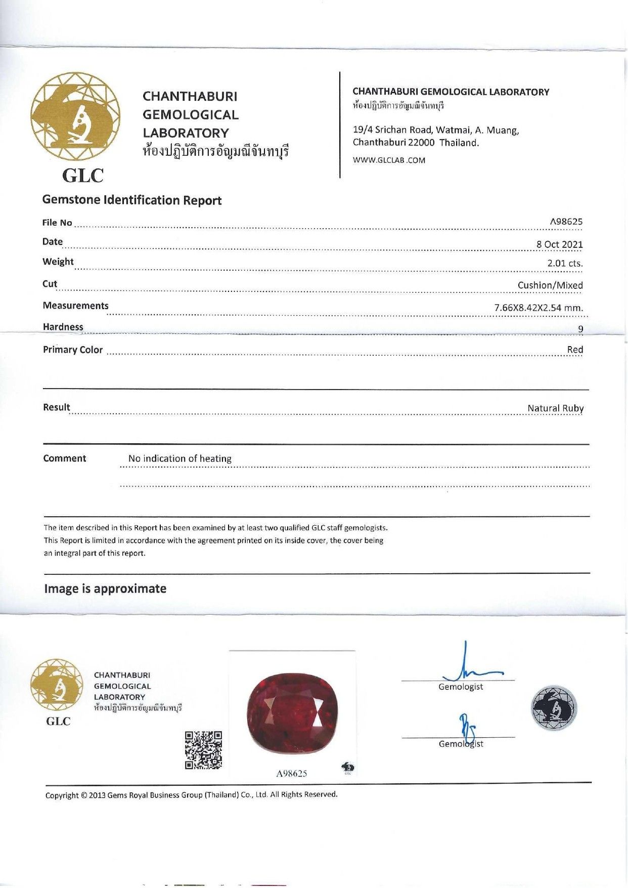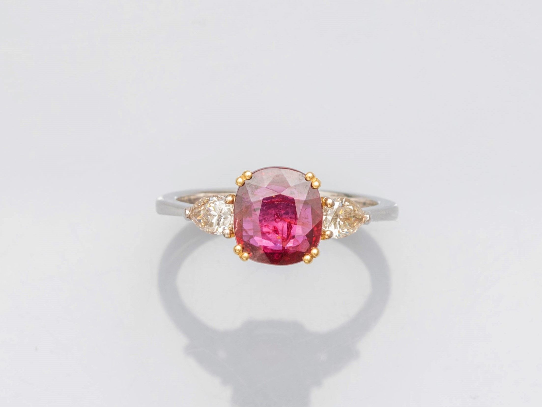 Bague en or deux tons 750°/°°(18K), sertie d'un beau rubis coussin naturel de 2.01 ct, épaulé de deux diamants taillés en poires. Rapport d'analyse de laboratoire. 4 g. TDD 55. largeur: 8.2 mm. Poinçon tête d'aigle