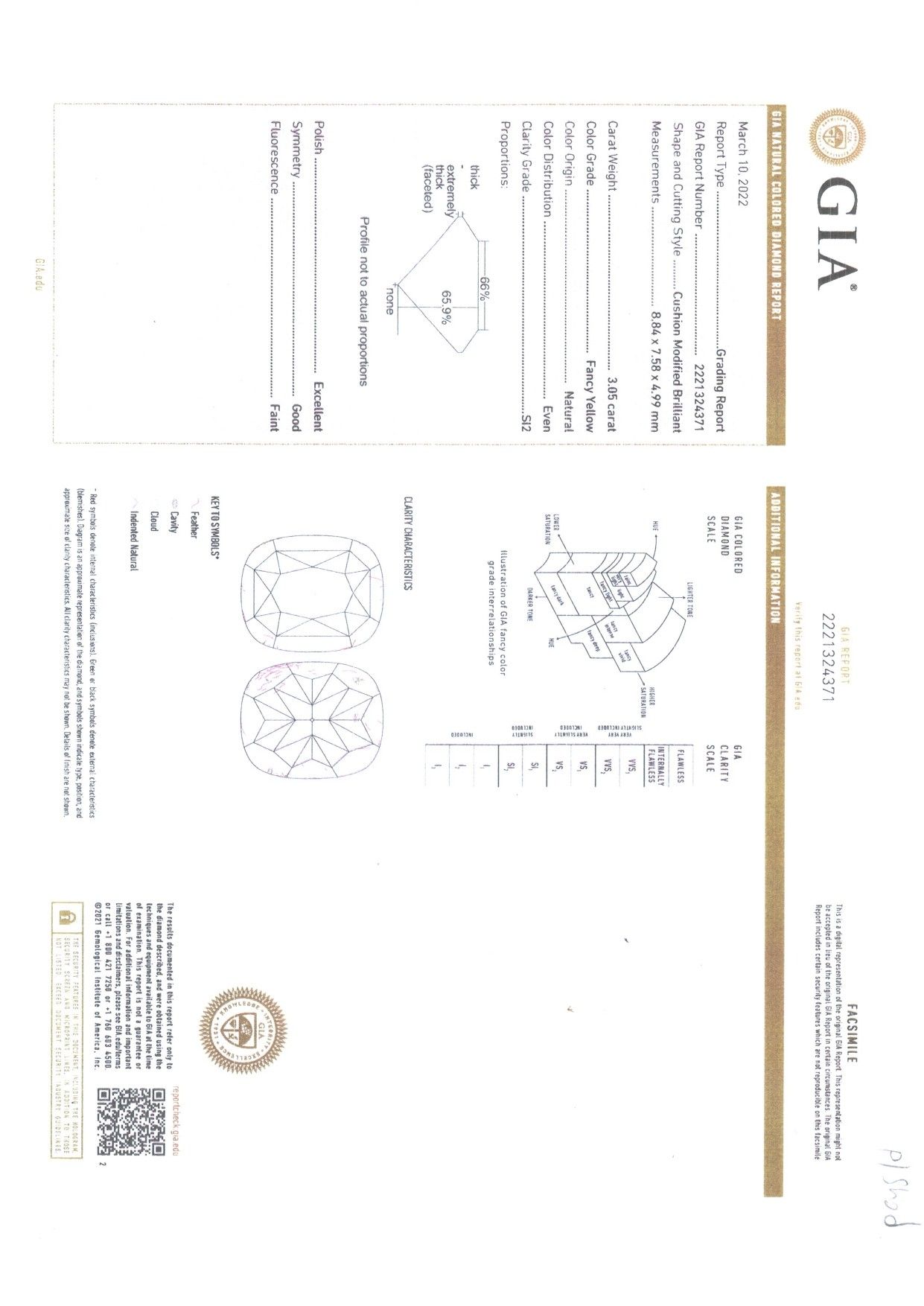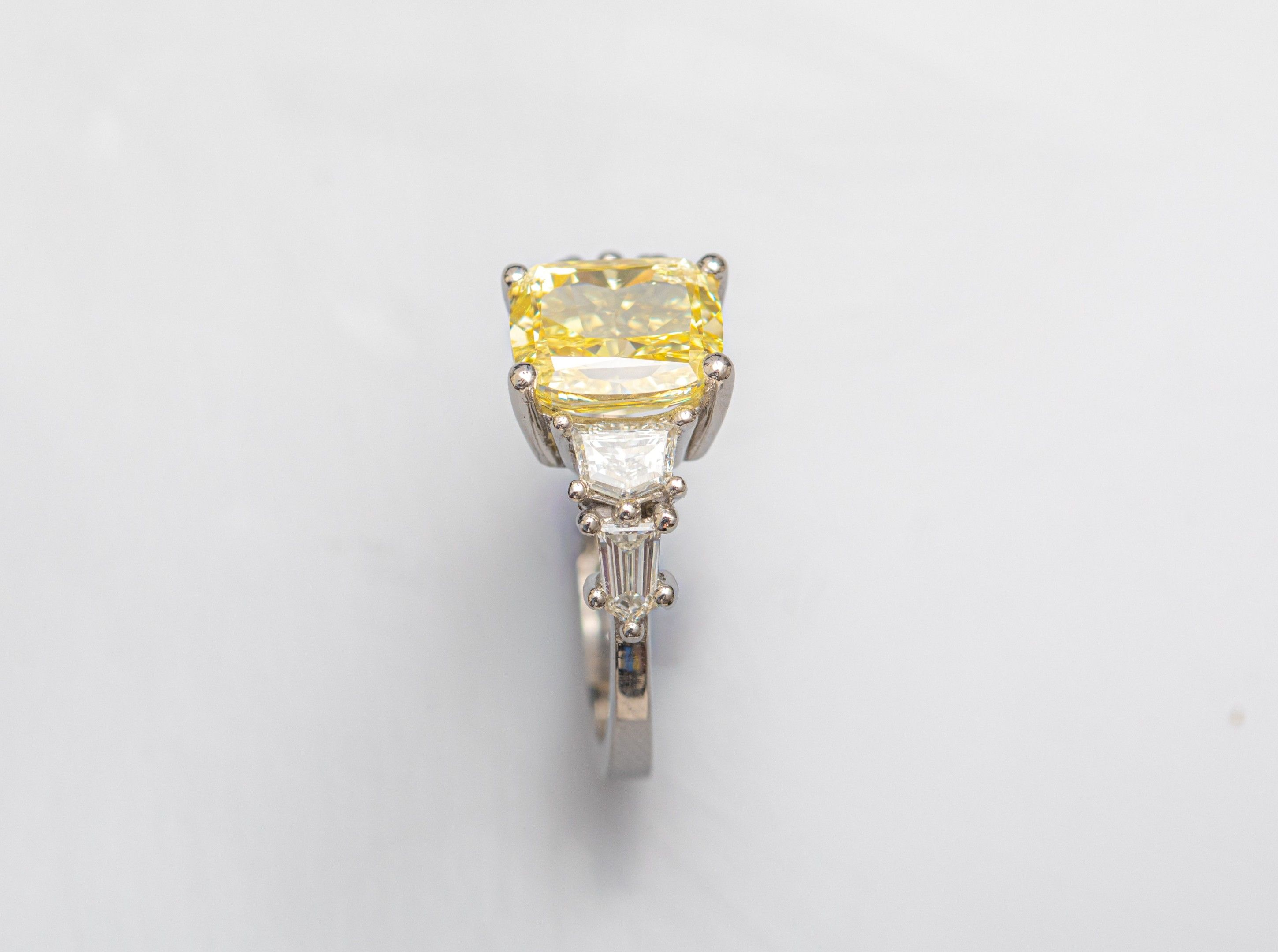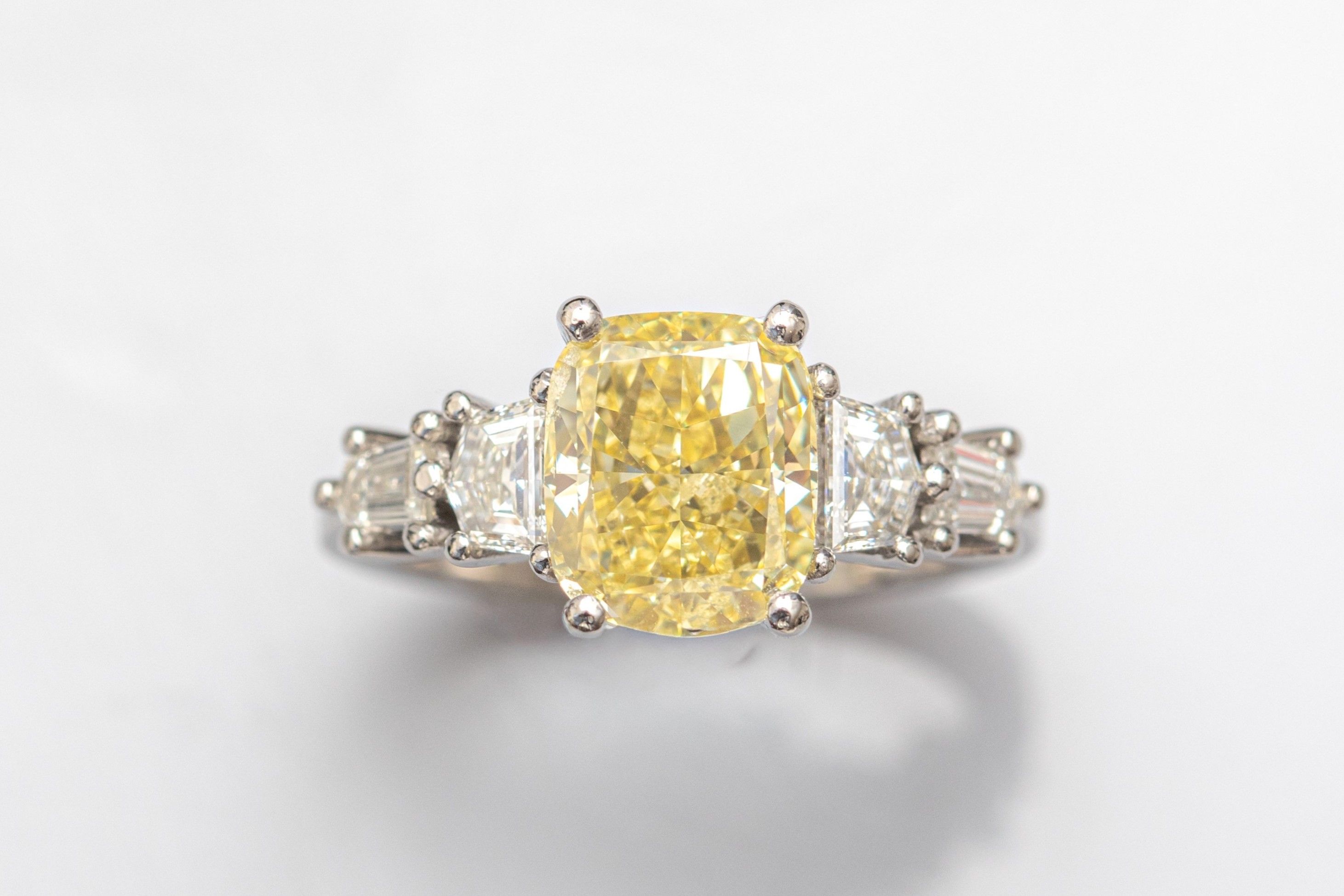 Bague en platine , sertie d'un important diamant jaune coussin de 3.05 ct , couleur Fancy Yellow et pureté SI2, épaulé de diamants demi lunes et de diamants baguettes. Rapport d'analyse du laboratoire GIA.. 6.46 g. TDD 52. Longueur: 9.5 mm. Poinçon mascaron