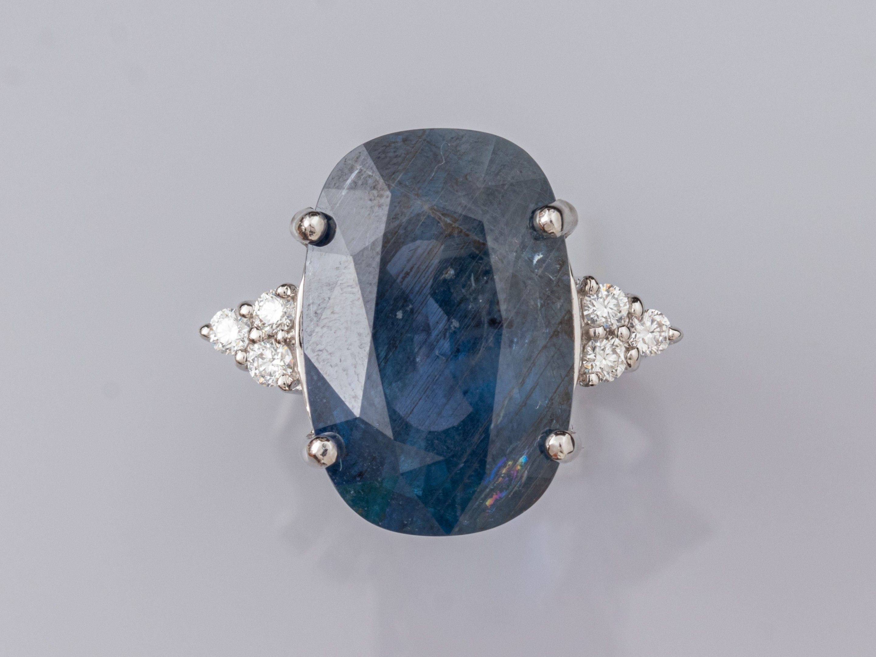 Bague en or gris 750°/°°(18K) , sertie d'un saphir naturel coussin à facettes de 15.12 ct, épaulé de diamants taille brillant. Rapport d'analyse de laboratoire "pas de traitement thermique constaté". 7.3 g. TDD: 52.5. Largeur: 17.5 mm. Poinçon tête d'aigle.