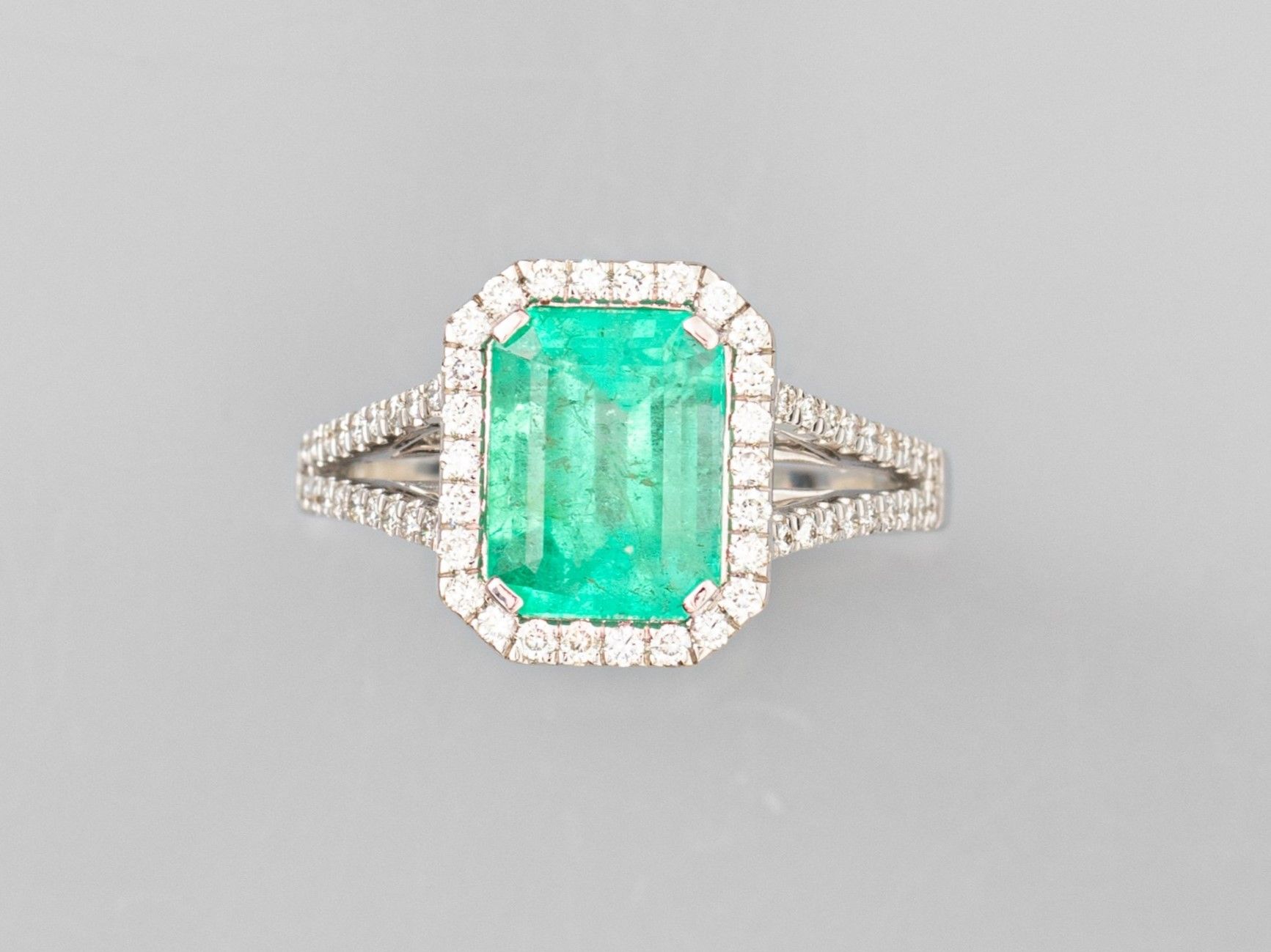 Bague en or gris 750°/°°(18K) , sertie d'une émeraude rectangulaire à pans de 1.70 ct environ (traces de résine), dans un entourage de diamants taille brillant. Monture ajourée sertie de petits diamants taille brillant. 4.6 g. TDD 54. Longueur: 11.8 mm. Poinçon tête d'aigle.