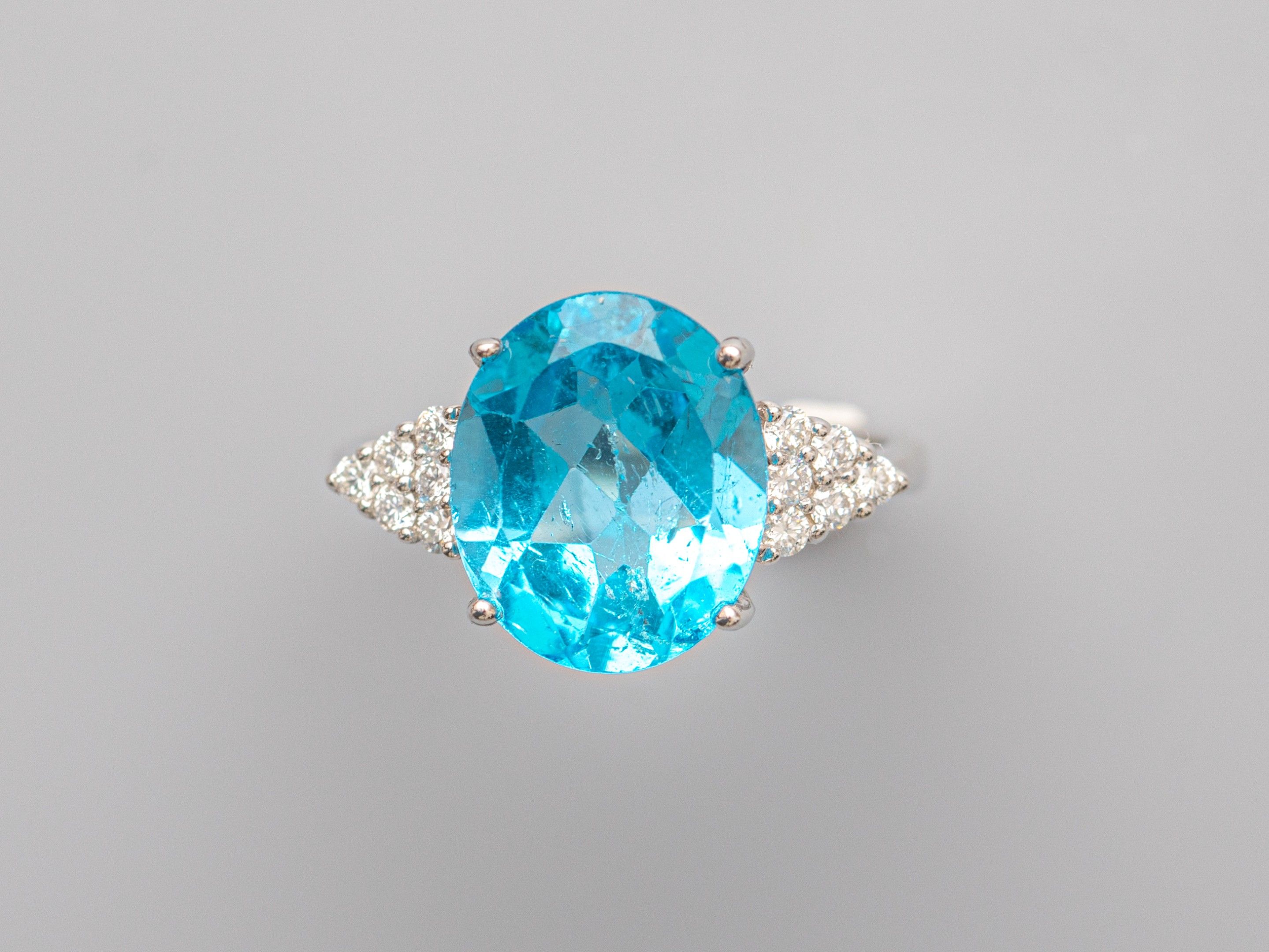 Bague en or gris 750°/°° (18K), sertie d'une topaze "Bleue Suisse" taille ovale de 5 ct environ, épaulée de diamants taille brillant. 3.7 g. TDD 53. Largeur: 12 mm. Poinçon tête d'aigle.