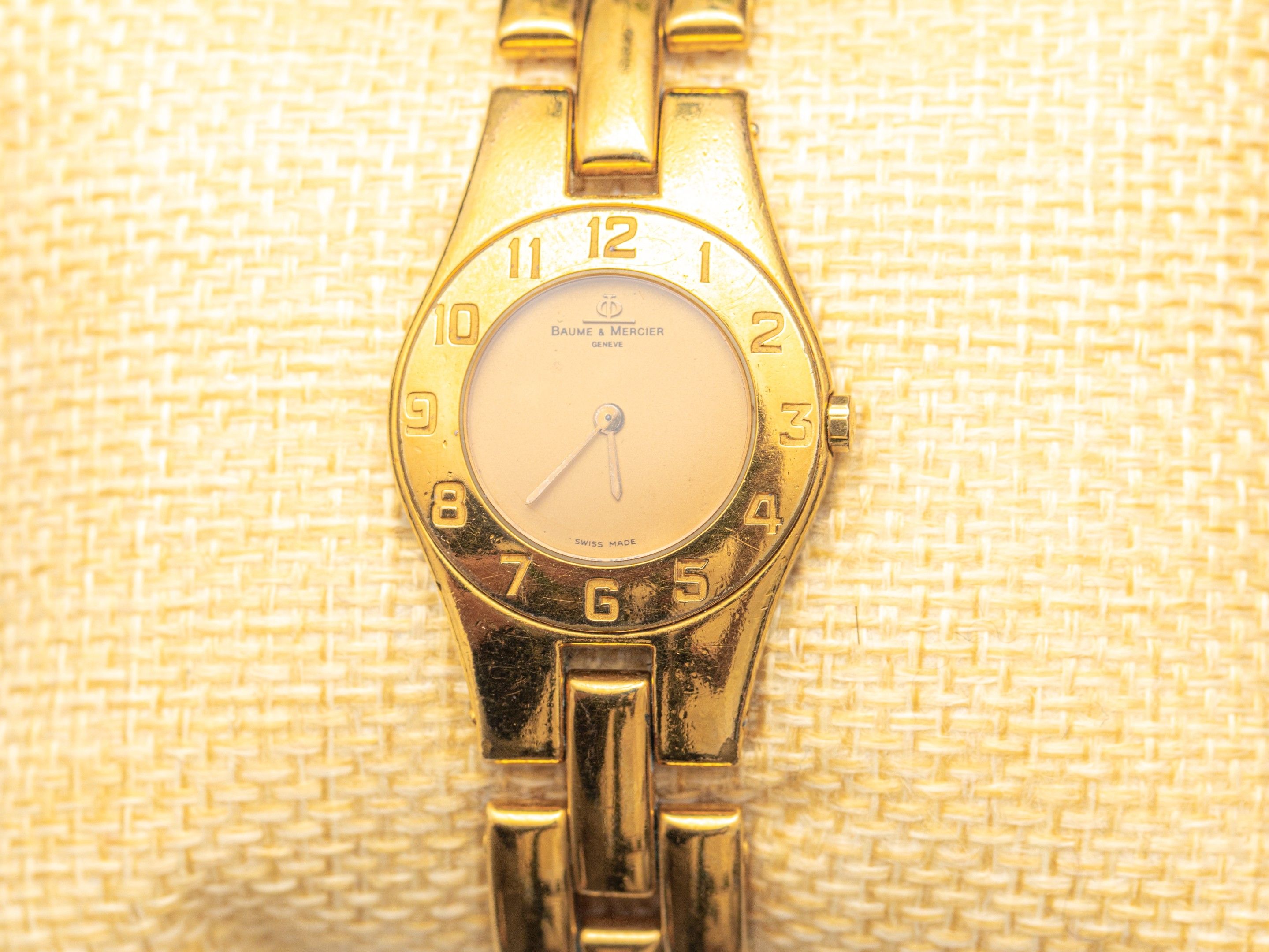BAUME & MERCIER, modèle Linéa, montre bracelet de dame en métal doré, mouvement quartz (pile à changer), bracelet à boucle déployante, rayures d'usage. Dimensions: 24 mm.