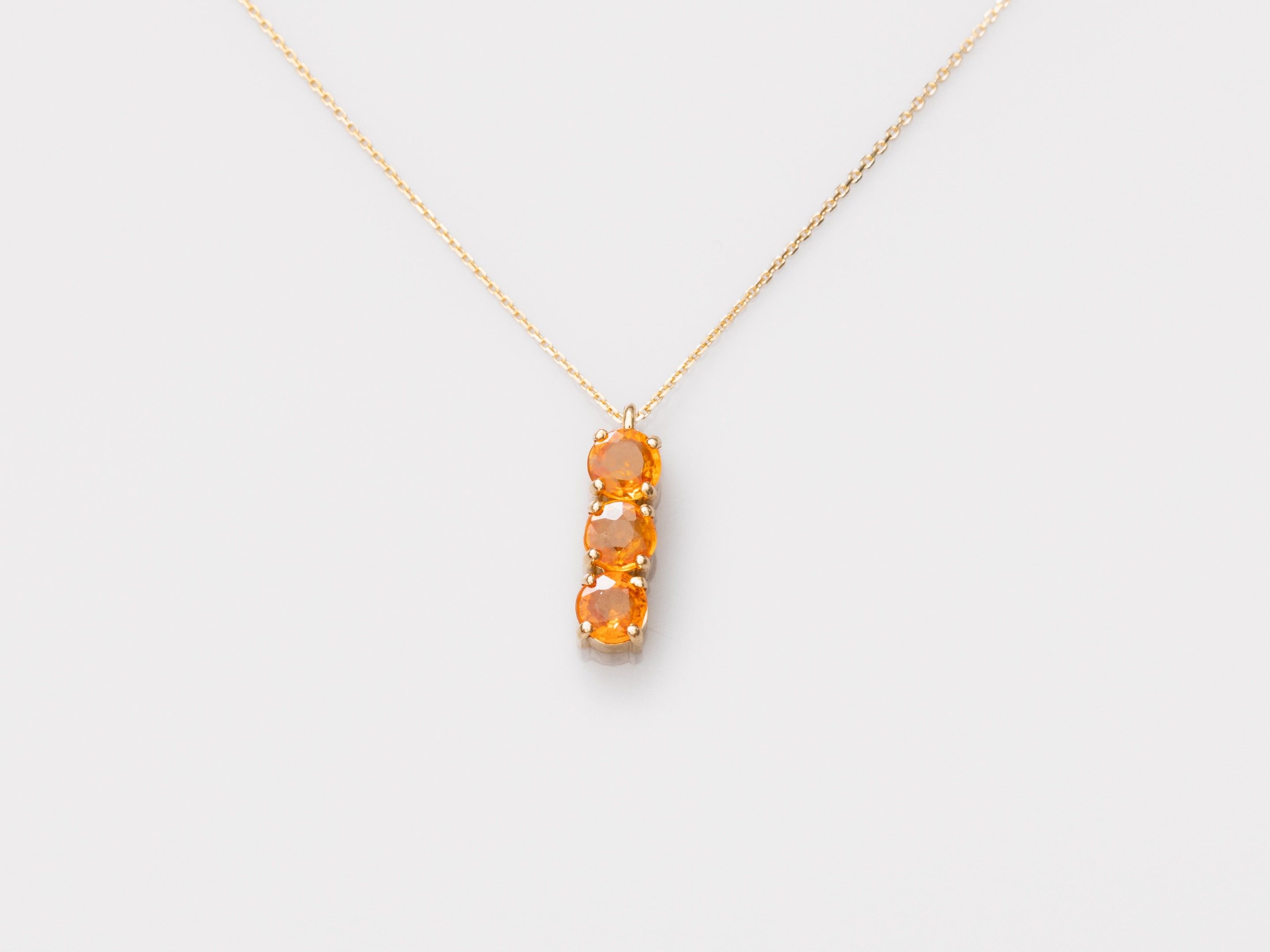 Pendentif en or jaune 750°/°° (18K), serti de trois saphirs oranges ronds facettés, avec sa chaîne en or jaune 750°/°° (18K), à fine maille forçat. 3.1 g. Longueur: 45 cm. Hauteur pendentif: 1.5 cm. Poinçon tête d'aigle