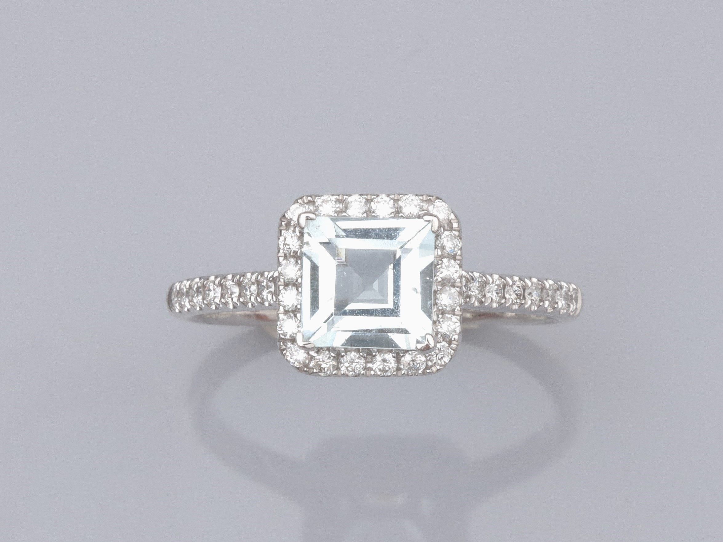 Bague en or gris 750°/°°(18K), sertie d'une aigue-marine carrée à pans de 1 ct environ, entourage de diamants taille brillant. 2.5 g. TDD 54. Poinçon tête d'aigle