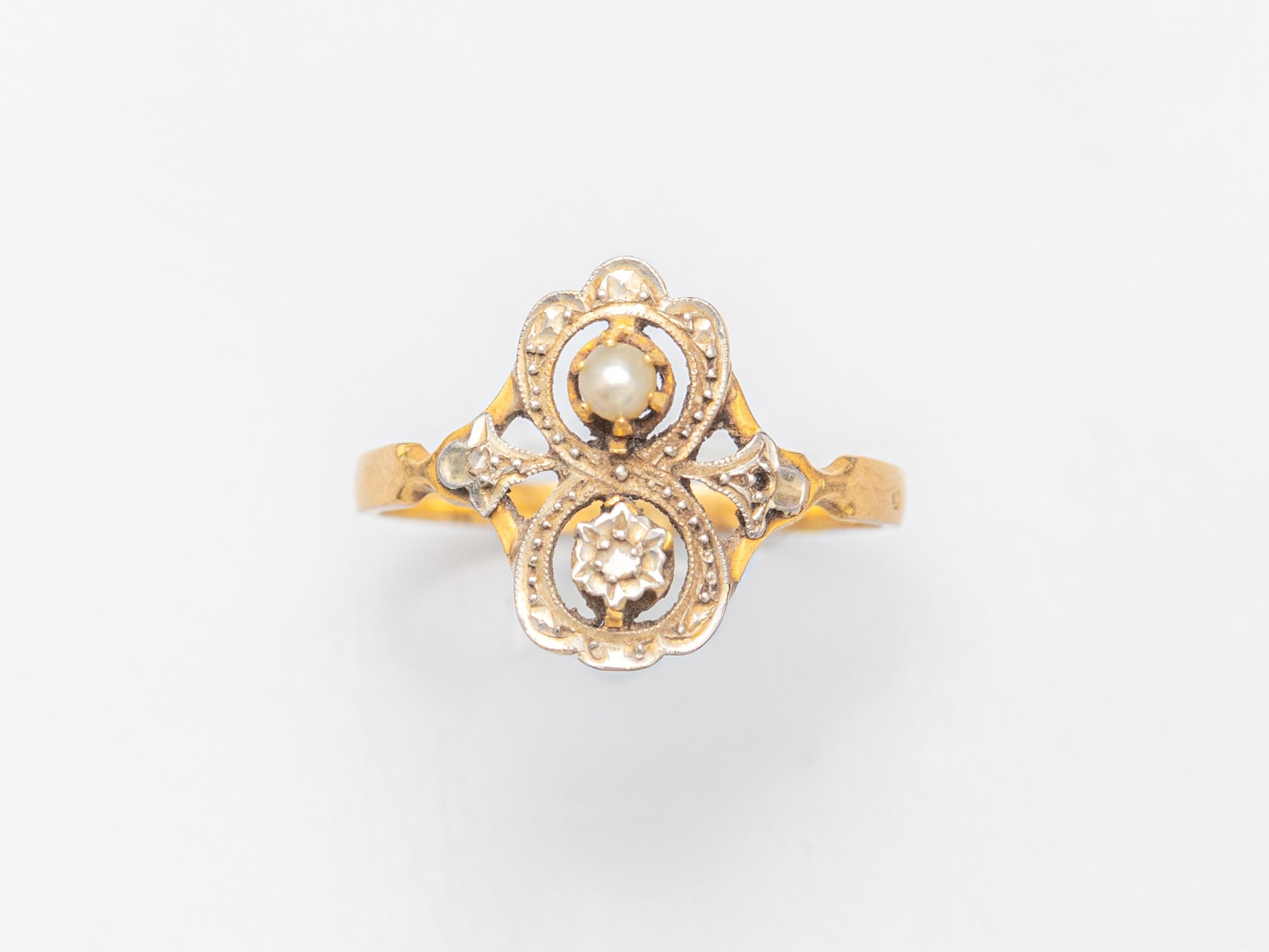Bague ancienne en or deux tons 750°/°° (18K), sertie d'une demi perle et de diamants taille rose (dont un manquant). Travail vers 1900. 2.6 g. TDD 59. Longueur: 15.5 mm. Poinçon tête d'aigle.