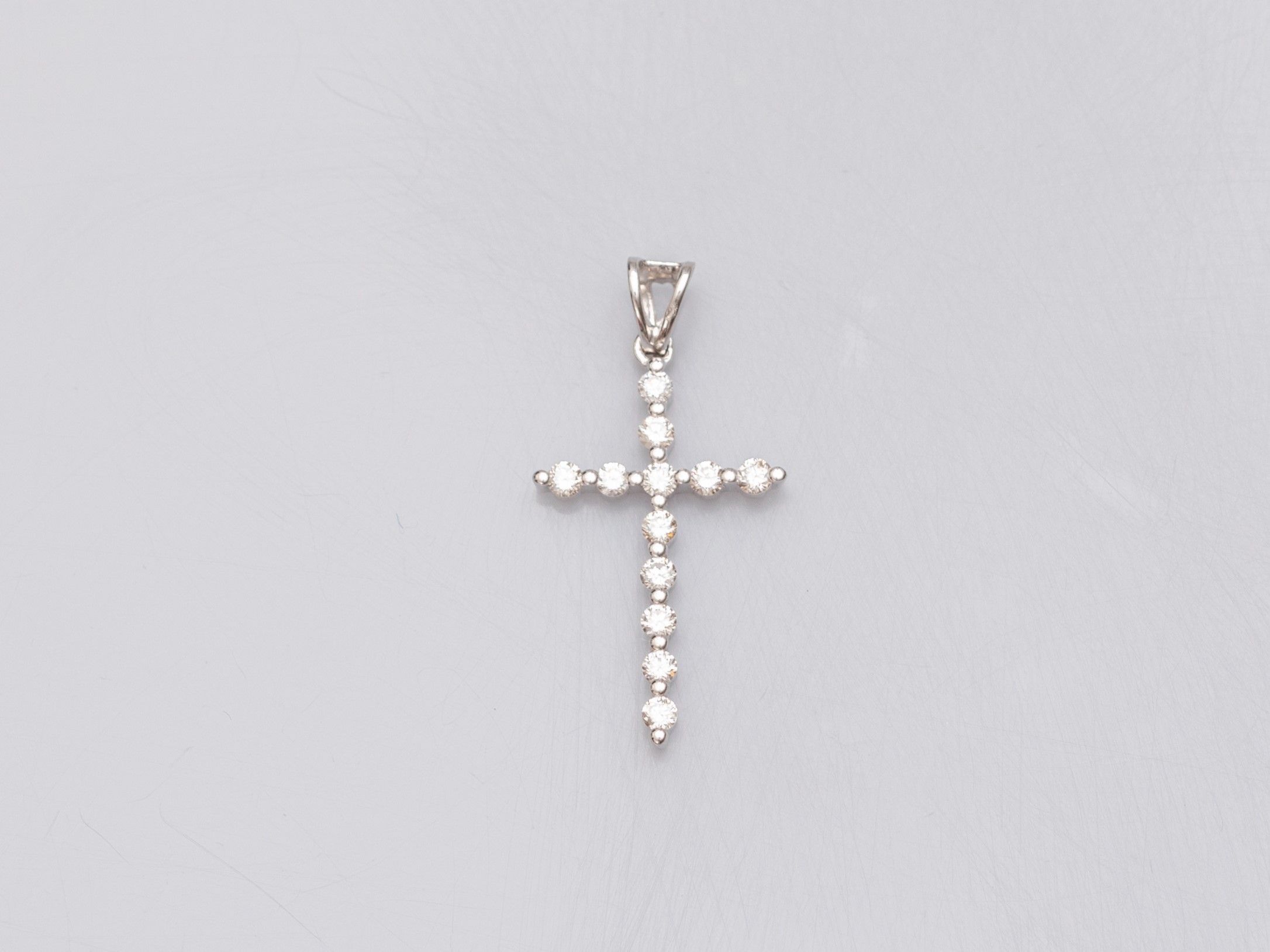 Croix en or gris 750°/°°(18K) , sertie de diamants taille brillant. 0.6 g. Longueur: 2.5 cm. Poinçon tête d'aigle.