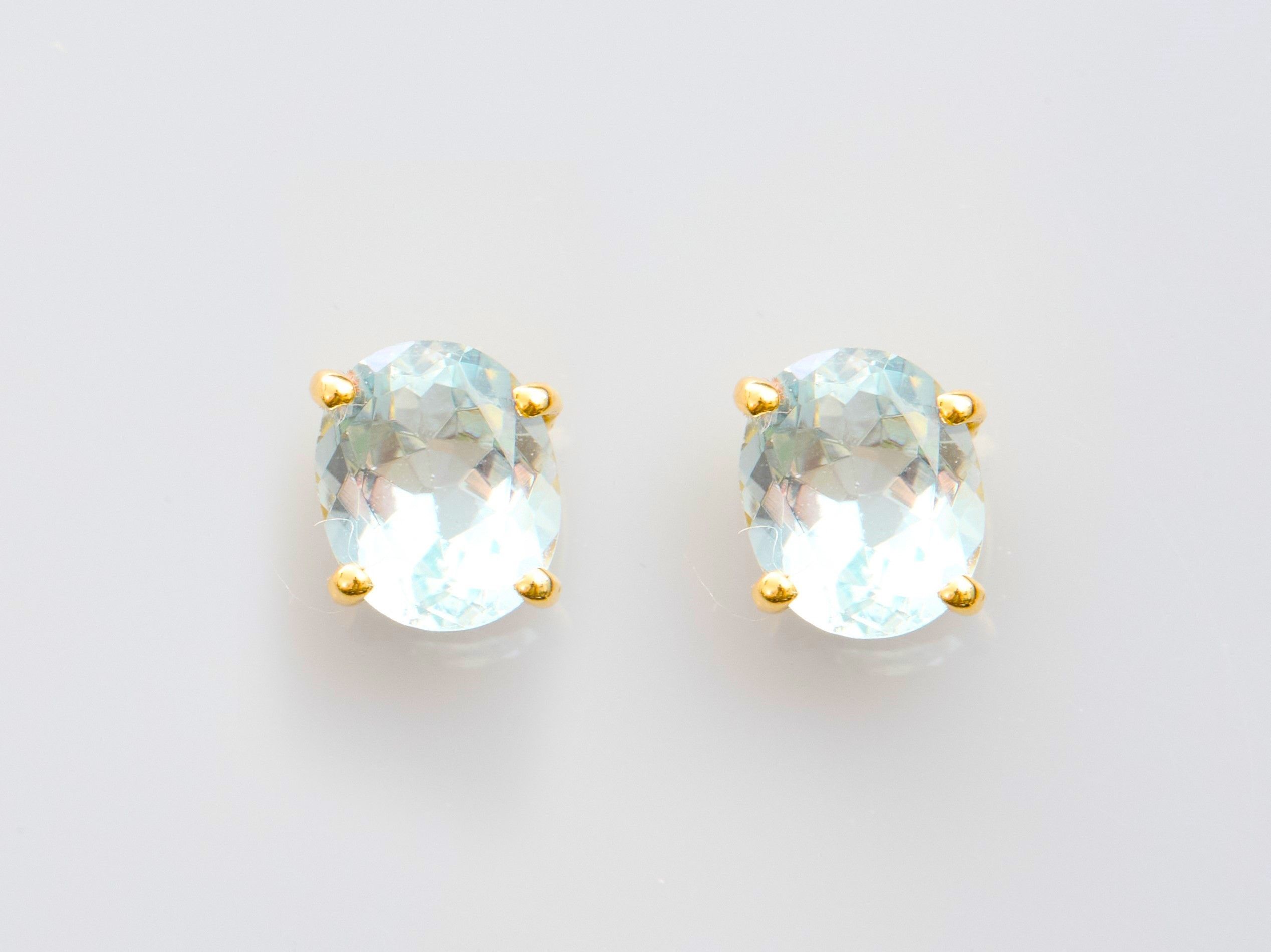 Paire de boucles d'oreilles en or jaune 750°/°°(18K) , serties chacune d'une aigue-marine ovale facettée de 1 ct. Fermoirs Alpa en or. 1.8 g. Longueur: 8 mm. Poinçon tête d'aigle.