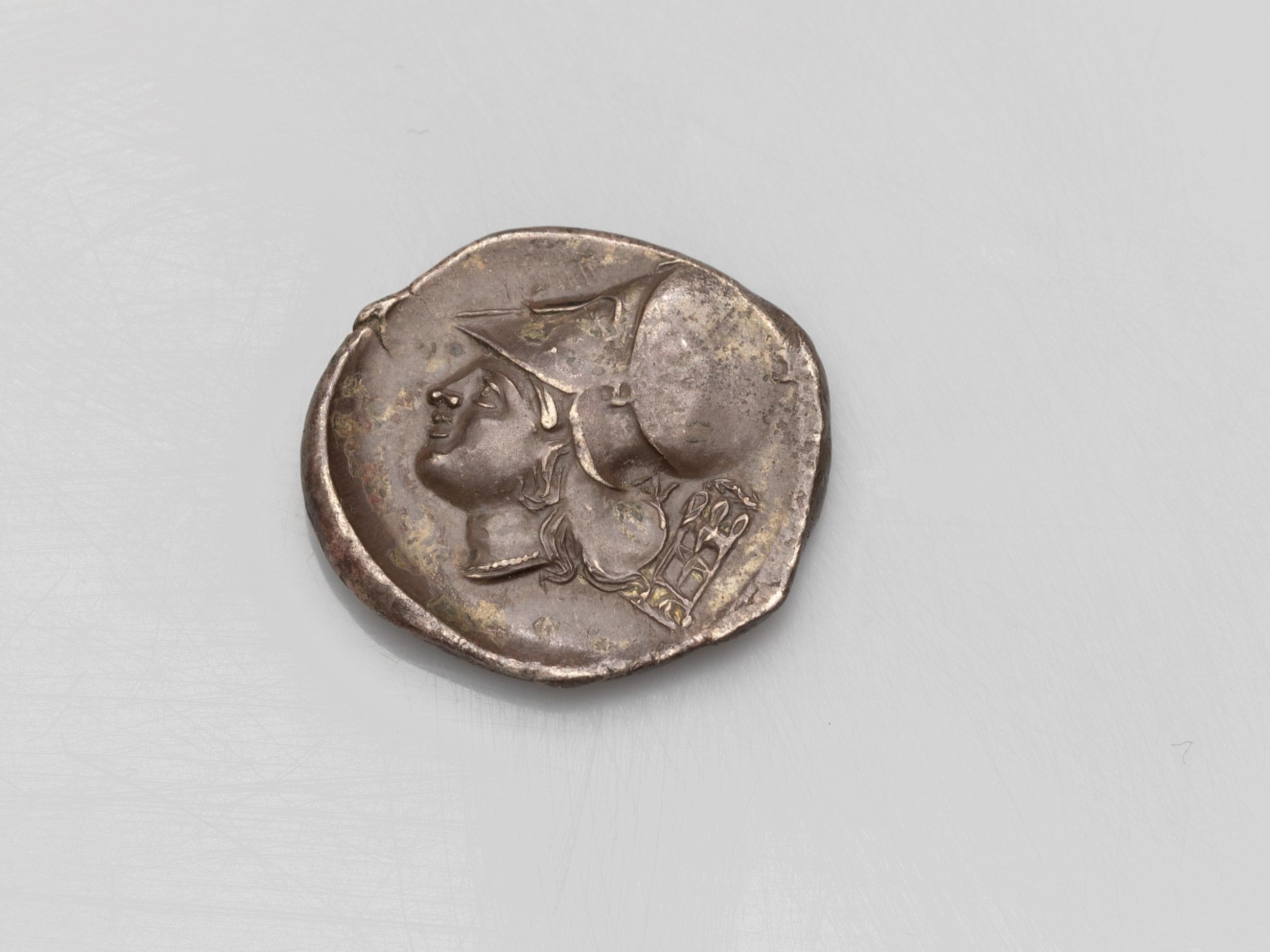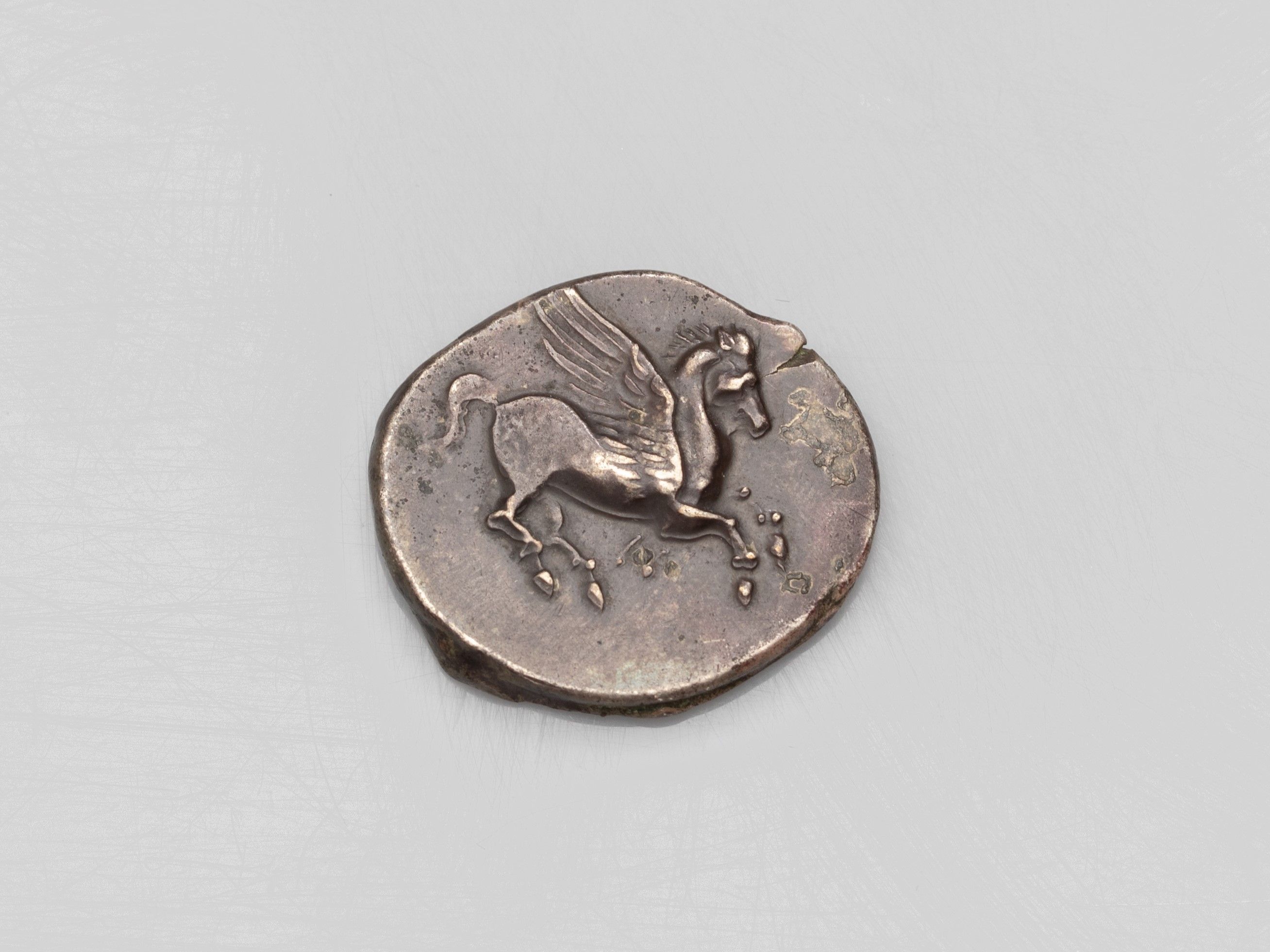 Statère d'Argent antique, tête d'Athéna et Pégase, 350-285 AC (probablement), Corinthe. 8.4 g. Diamètre: 2.3 cm environ.