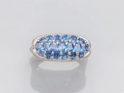 Bague bandeau en or gris 750°/°°(18K), pavée de saphirs rond…