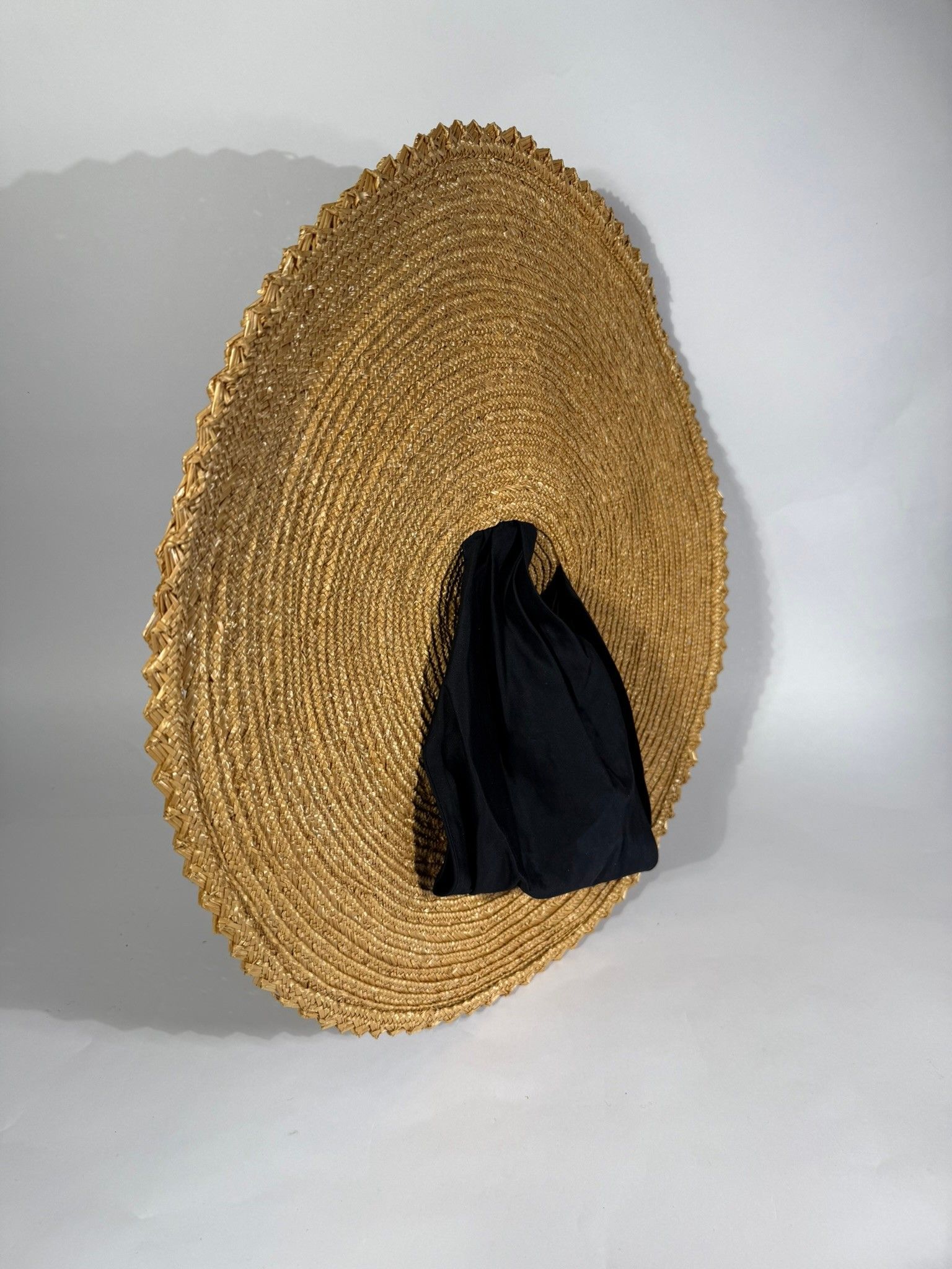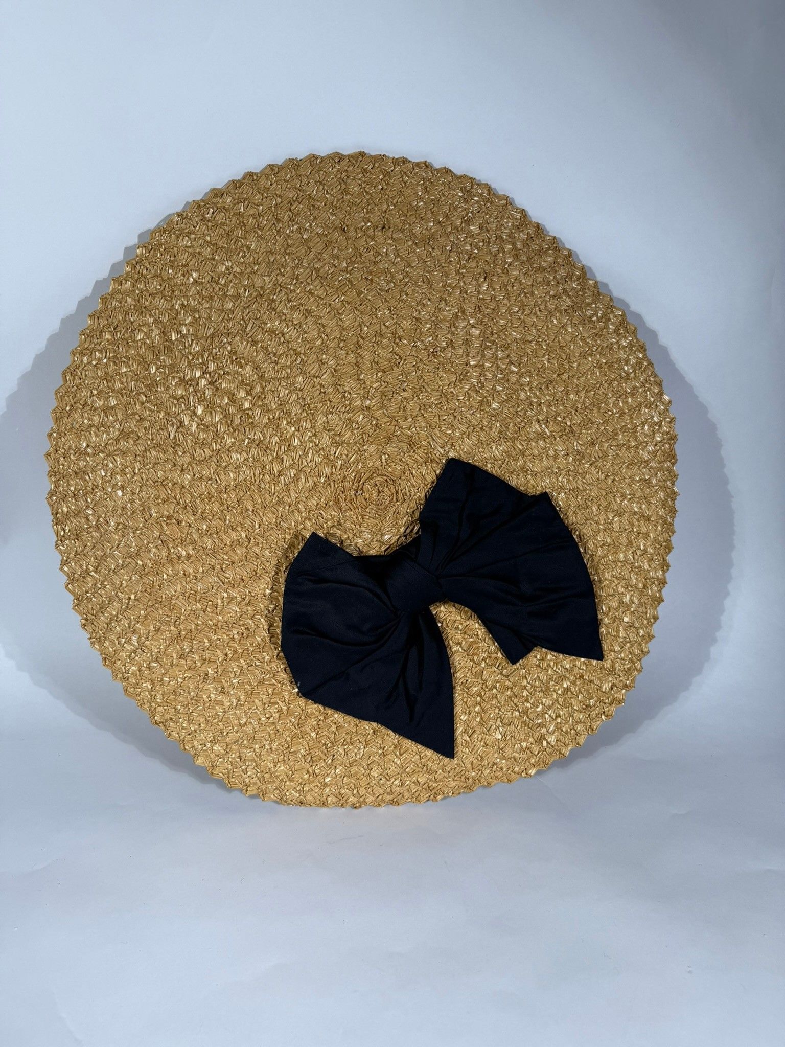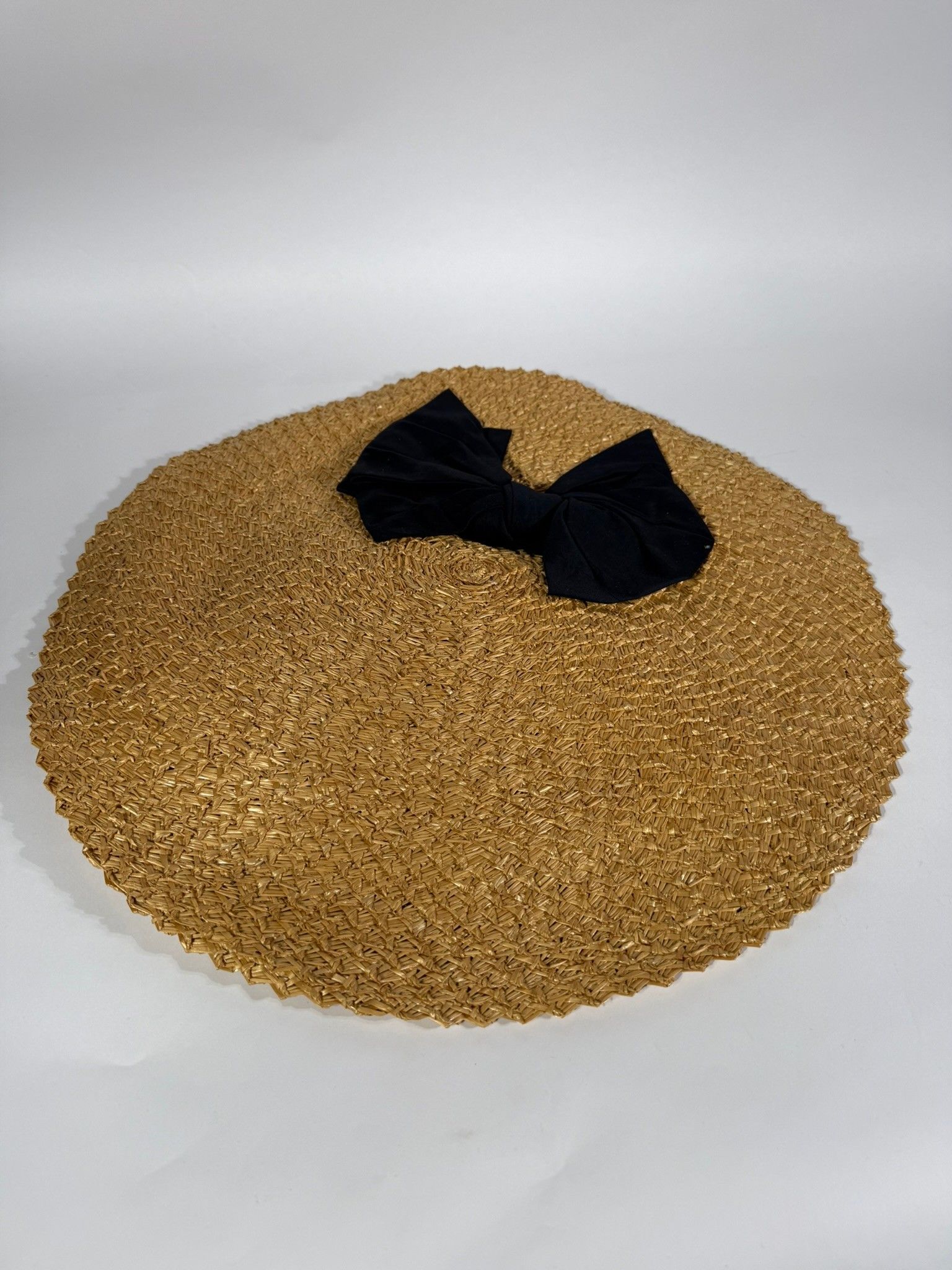 Capeline de paille à nœud de coton noir rappelant le travail d'Yves Saint Laurent. Diam : 49,5 cm