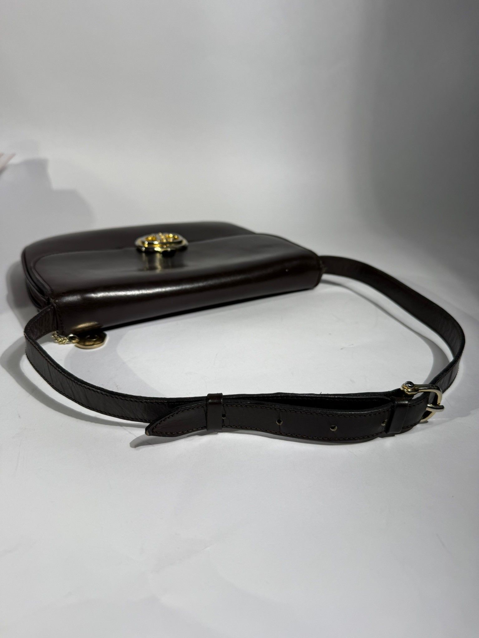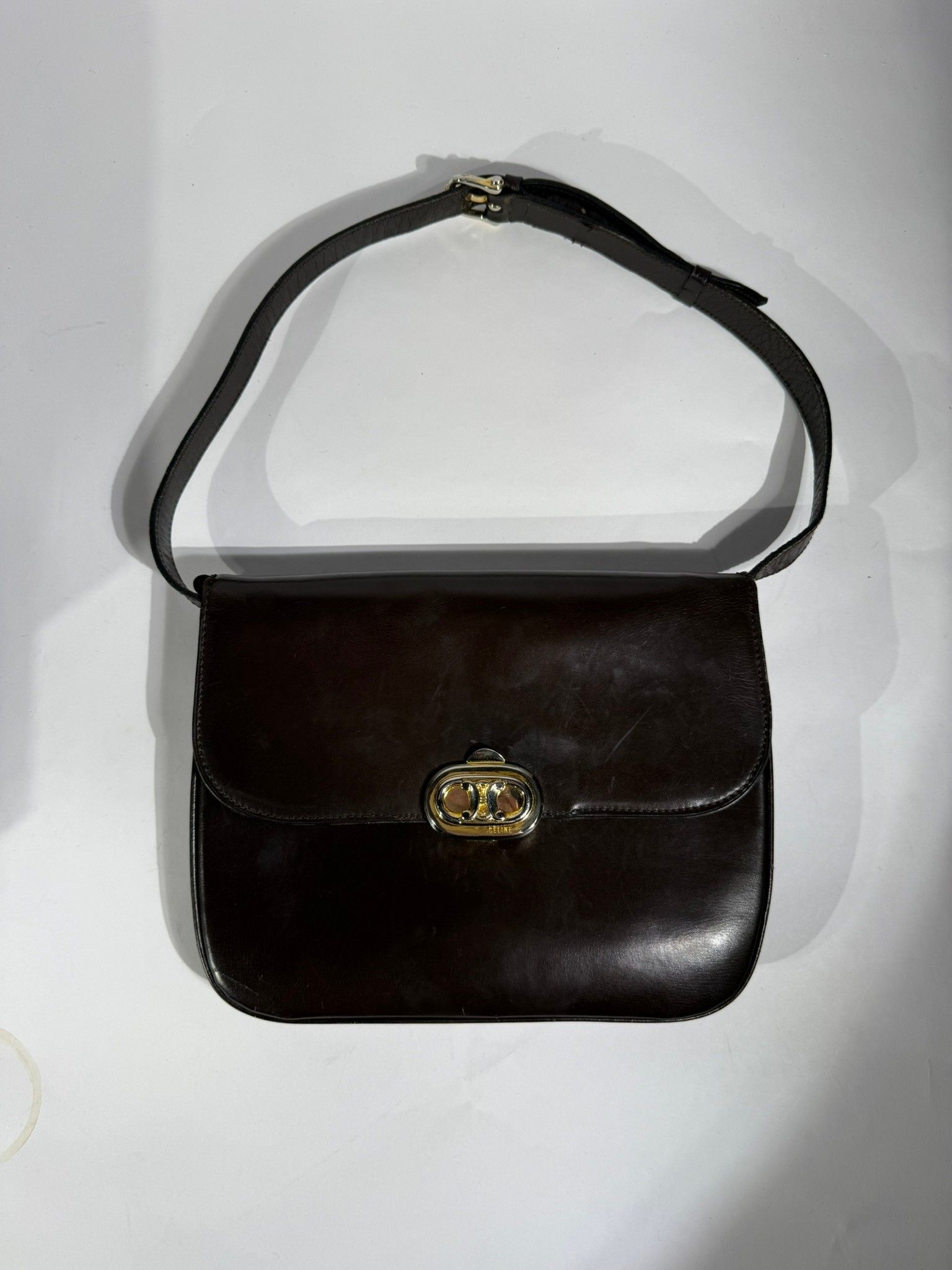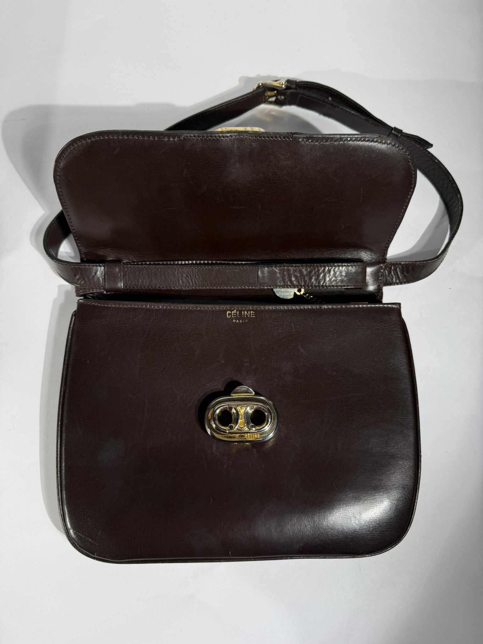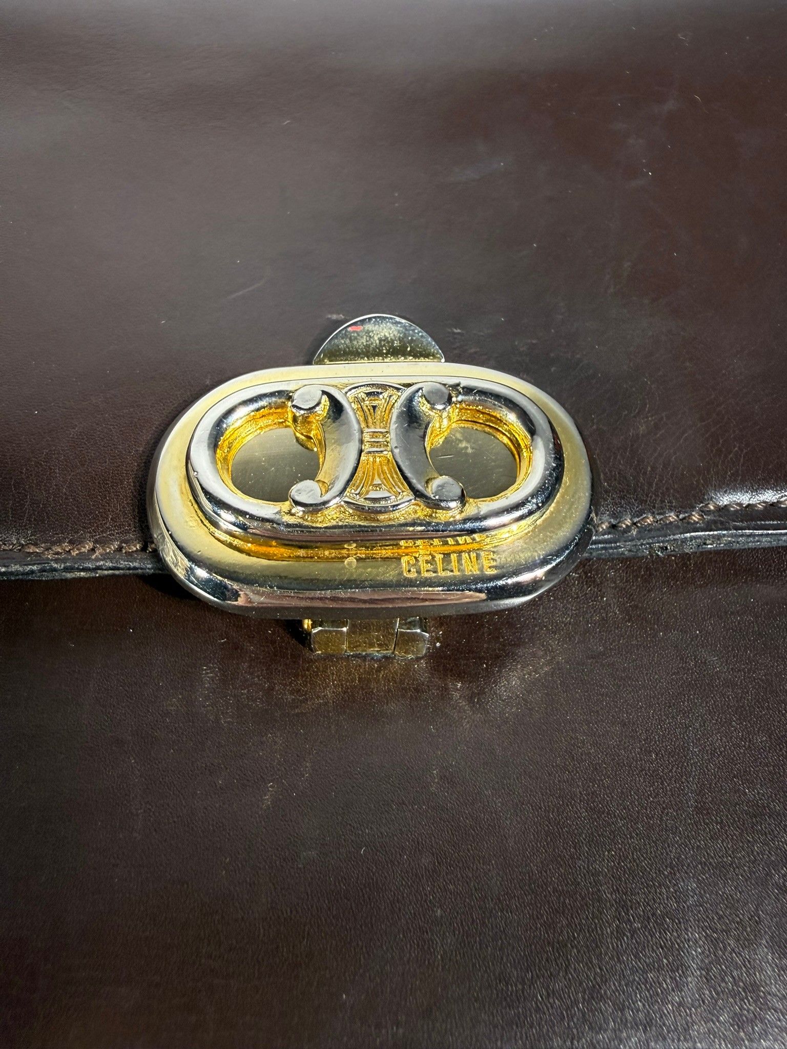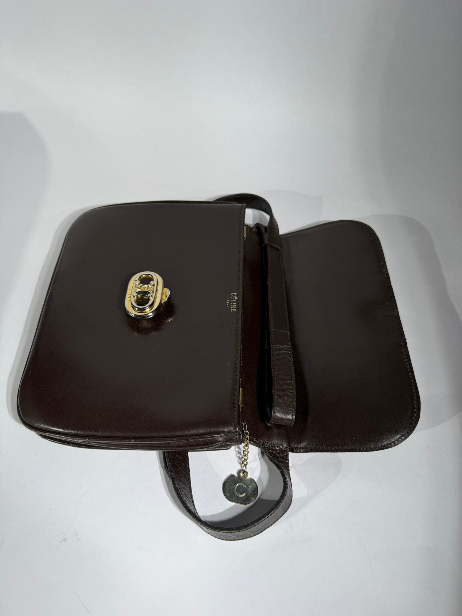 CELINE Petit sac en box marron, fermoir et garniture en méta…