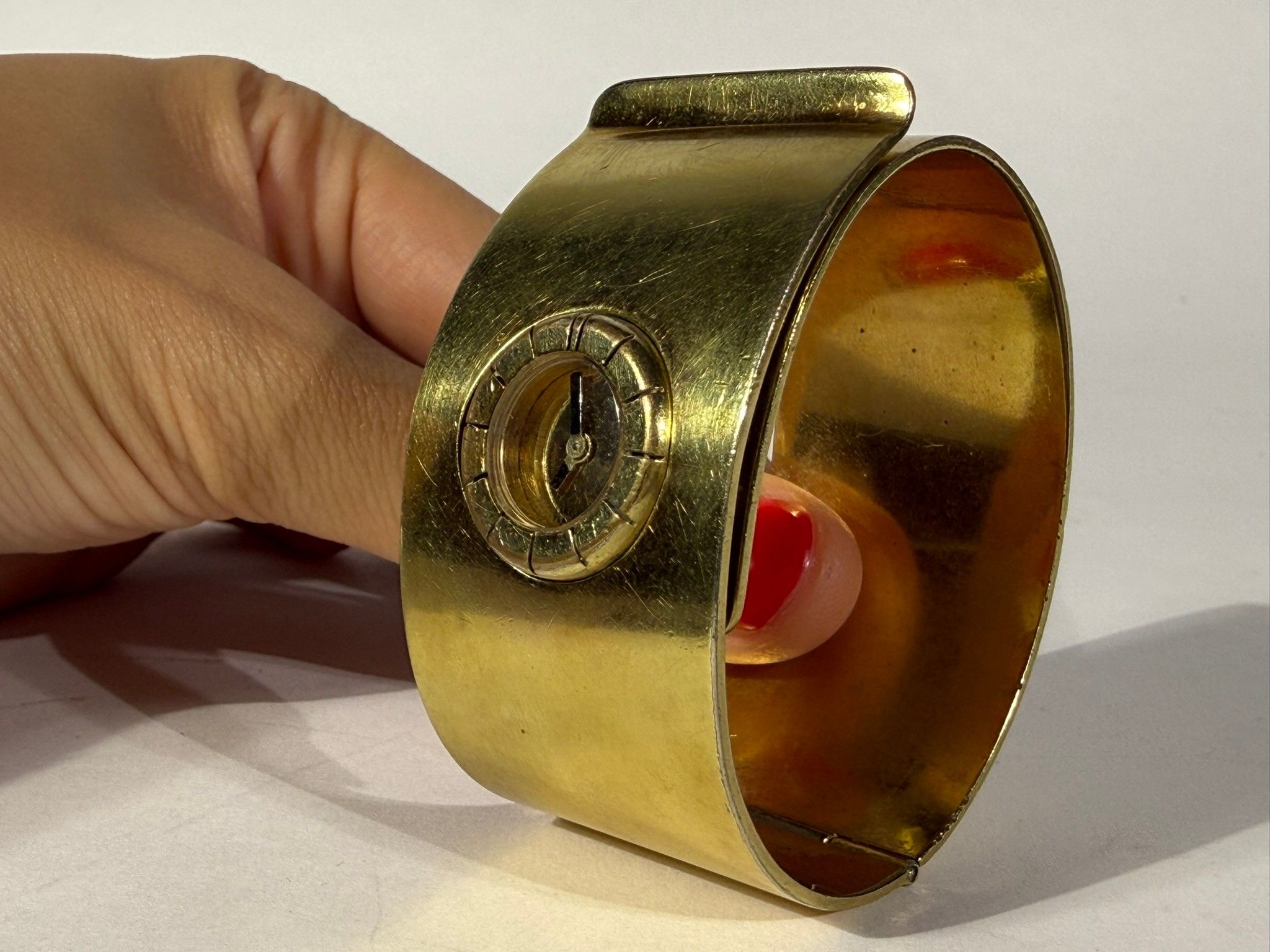 Montre manchette en métal doré, mouvement mécanique. Signée (rayures et traces d'usage)