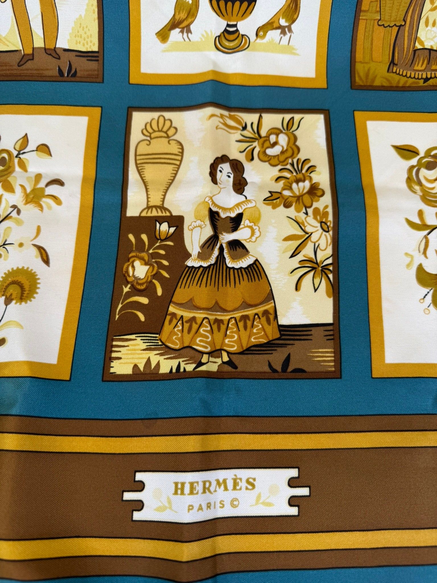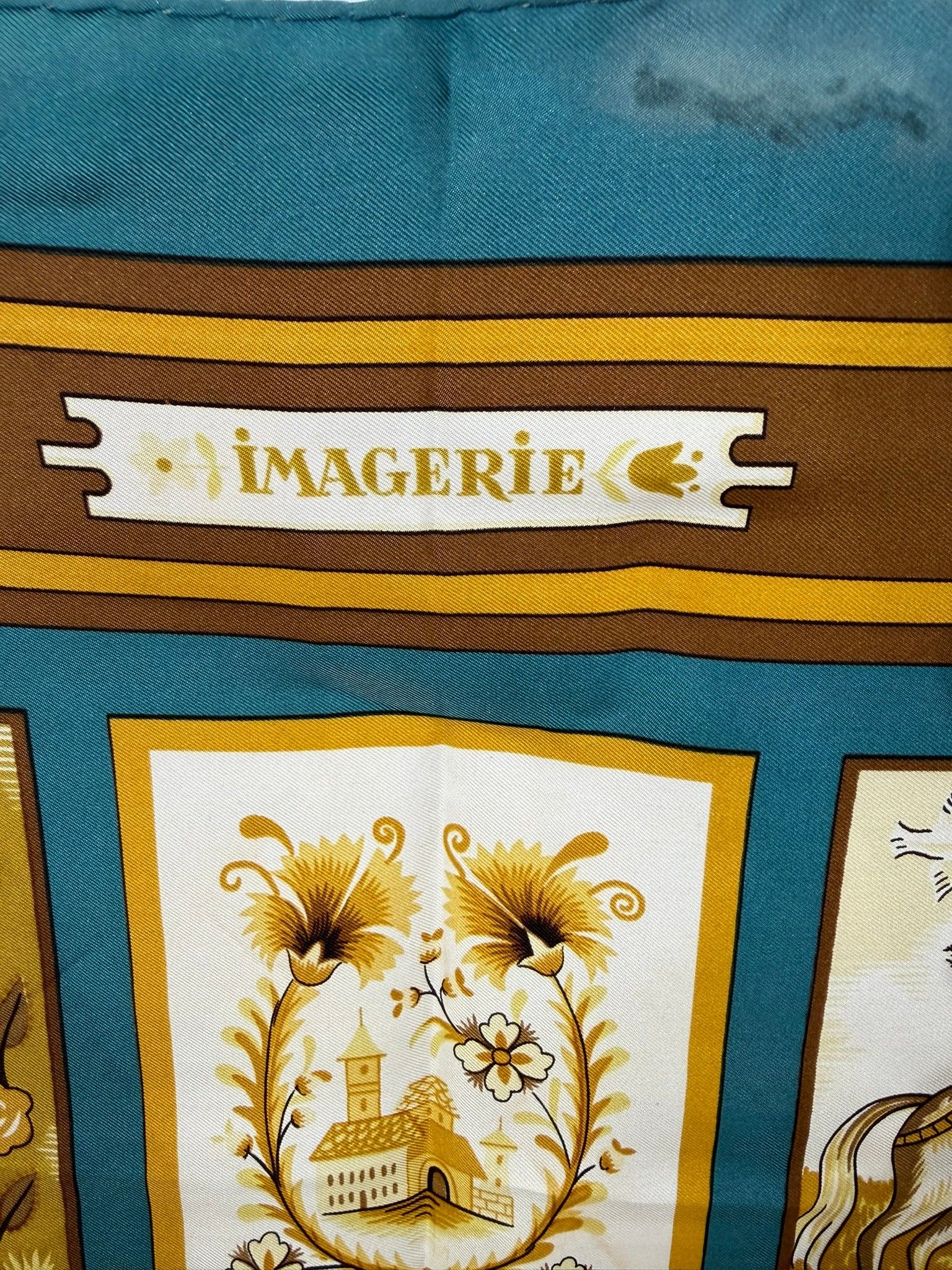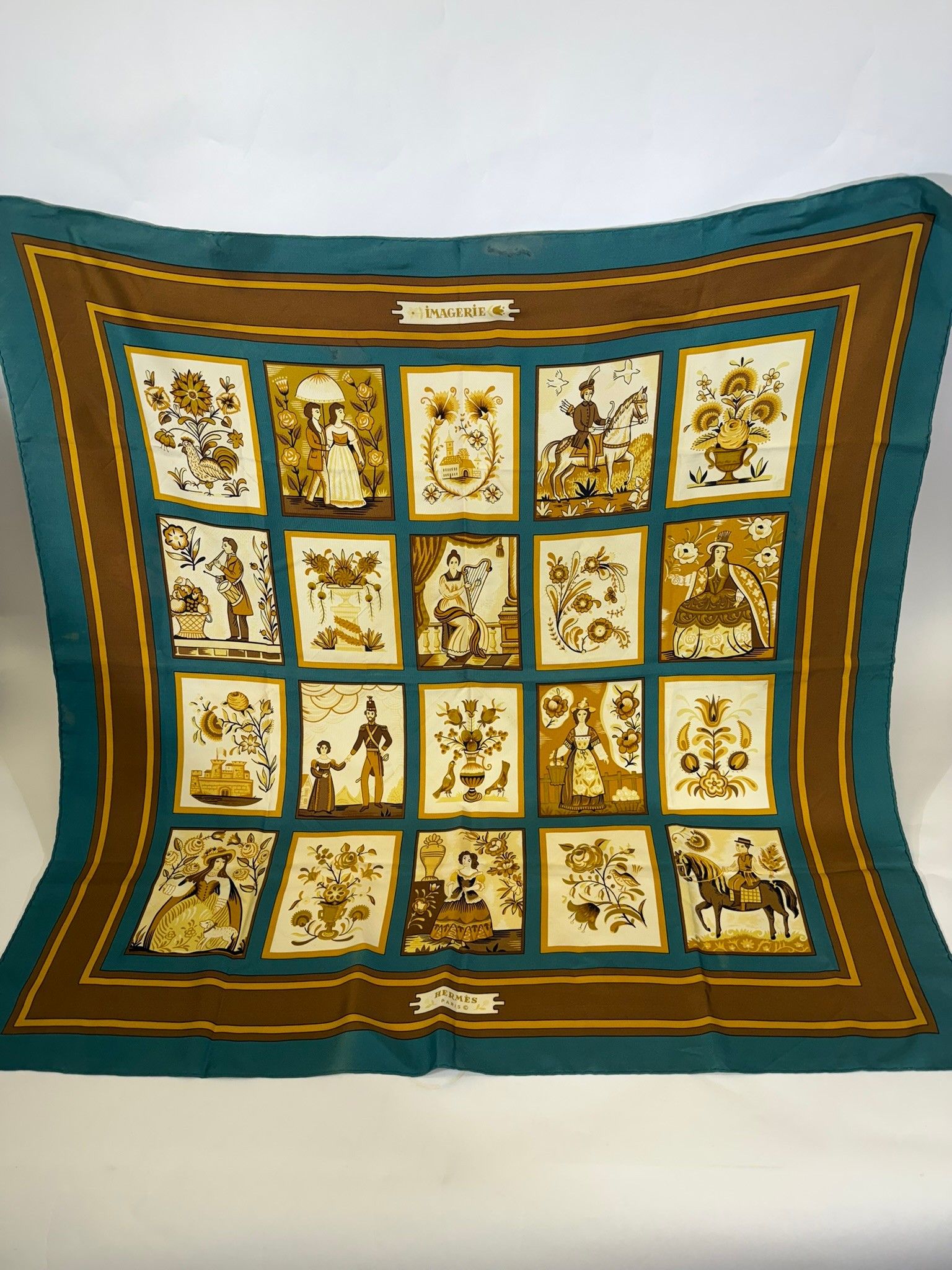 Carré en soie modèle "Imagerie" sur fond vert et doré