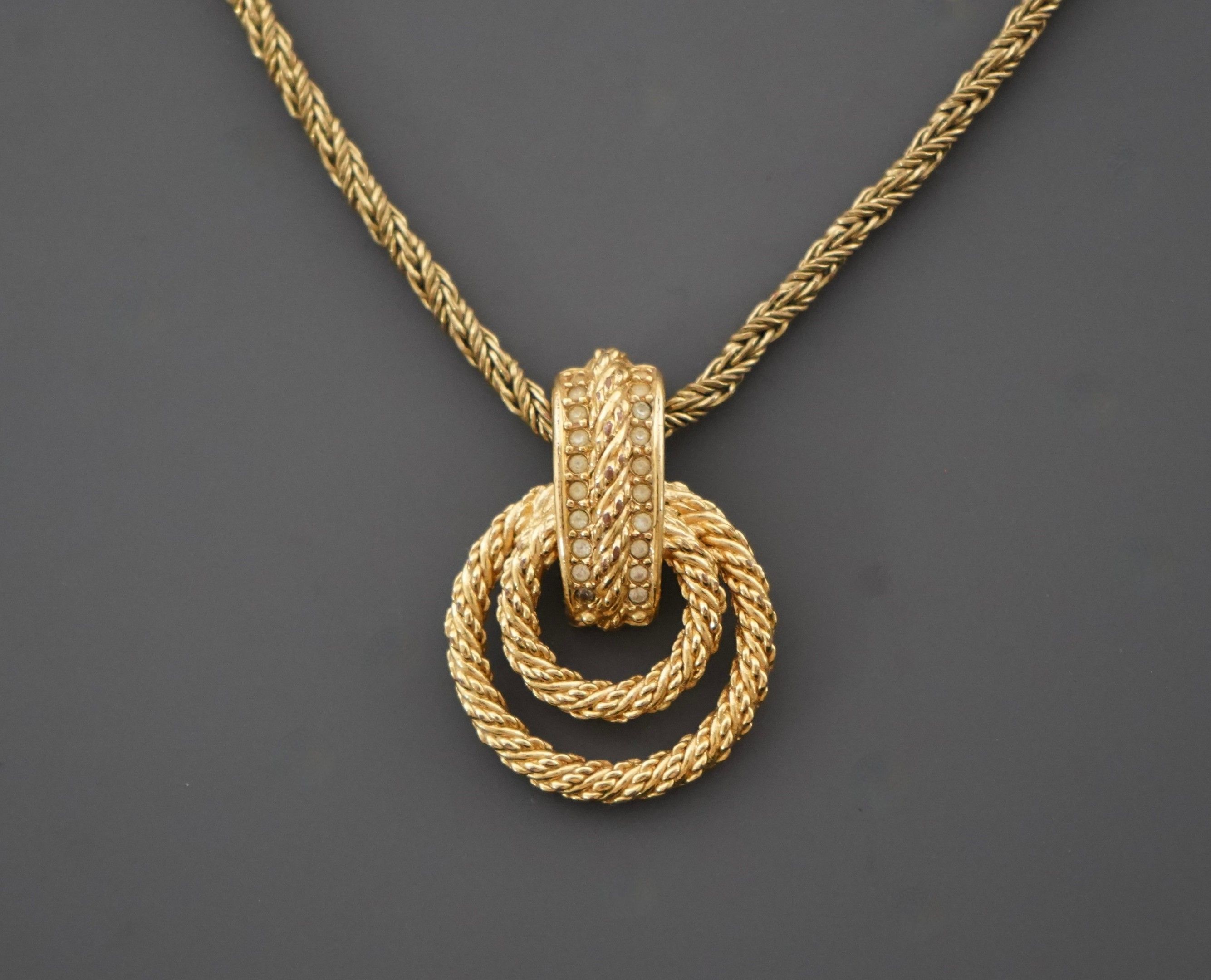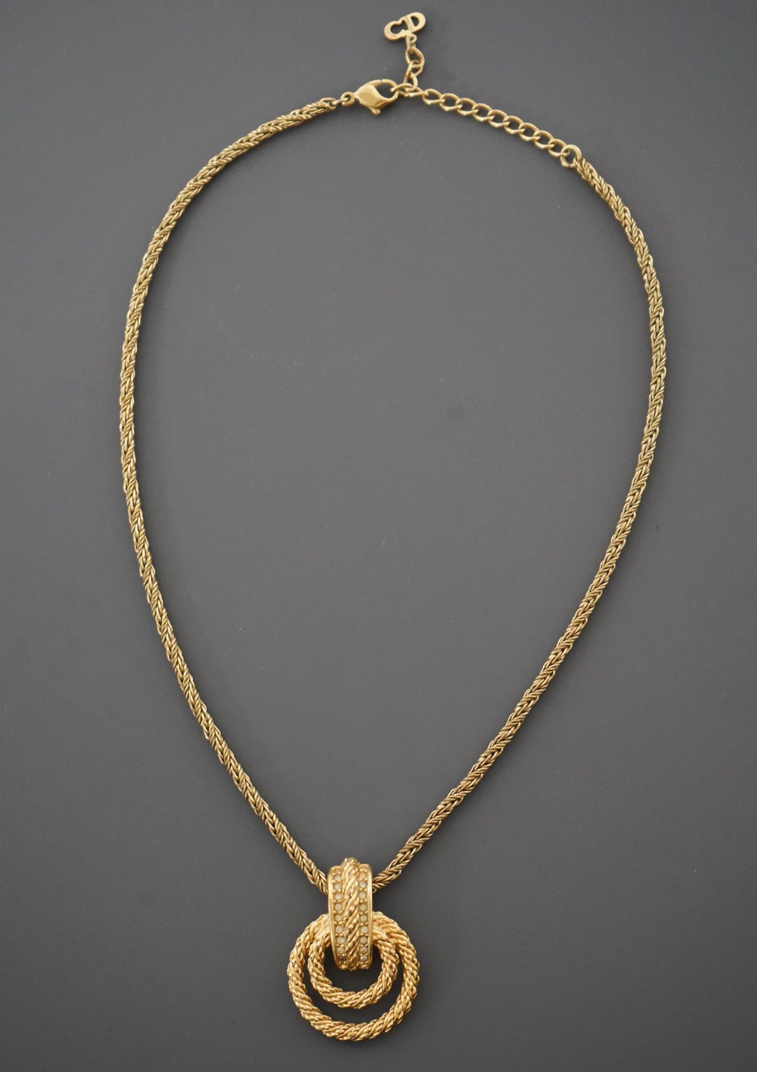 CHRISTIAN DIOR Collier pendentif en métal doré à chaîne torsadée et pendentif rond strassé. H pendentif : 4 cm