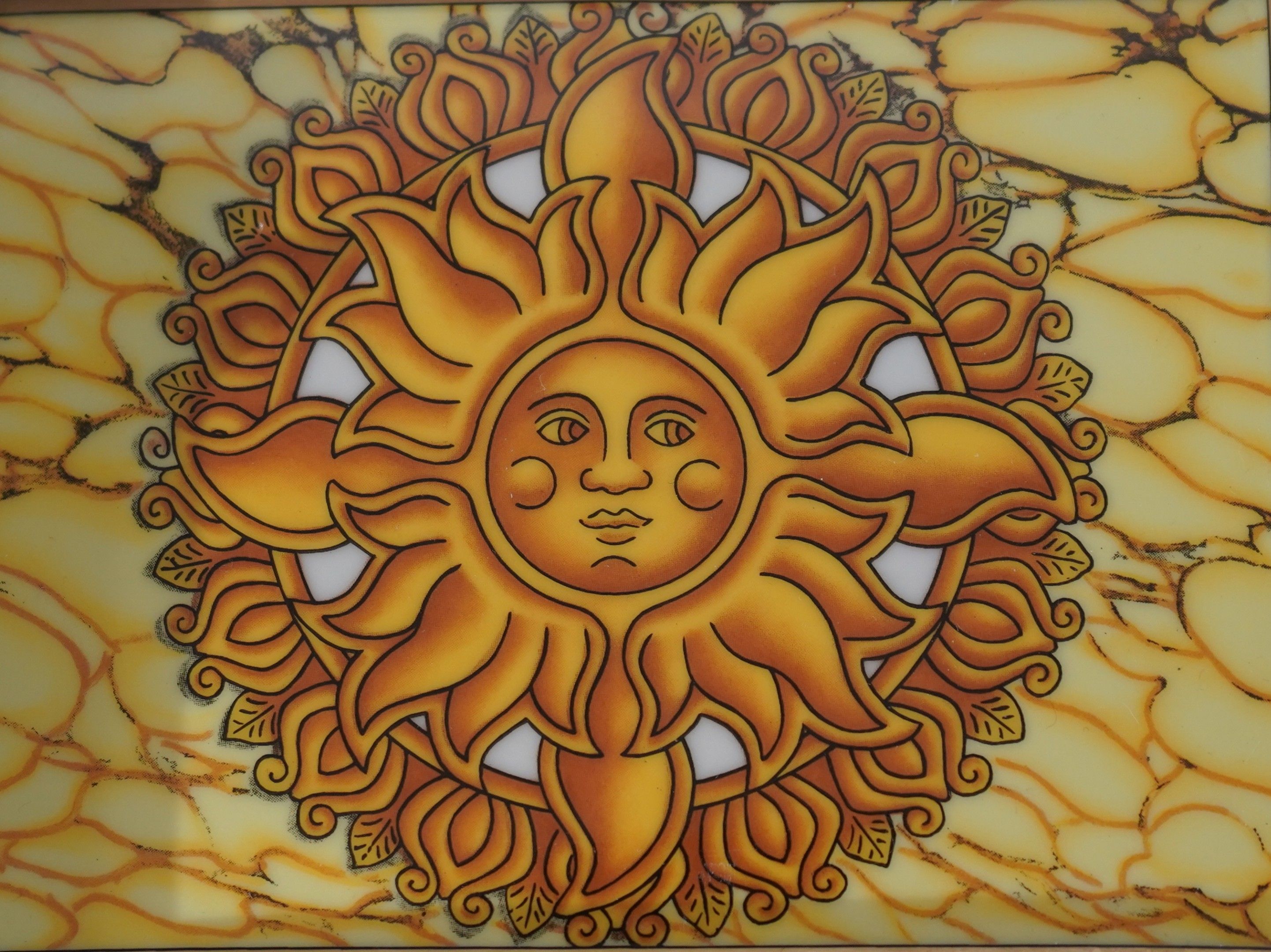 Cendrier en porcelaine à décor d'un soleil, dans les tons bleus et jaunes. 20 x 16 cm