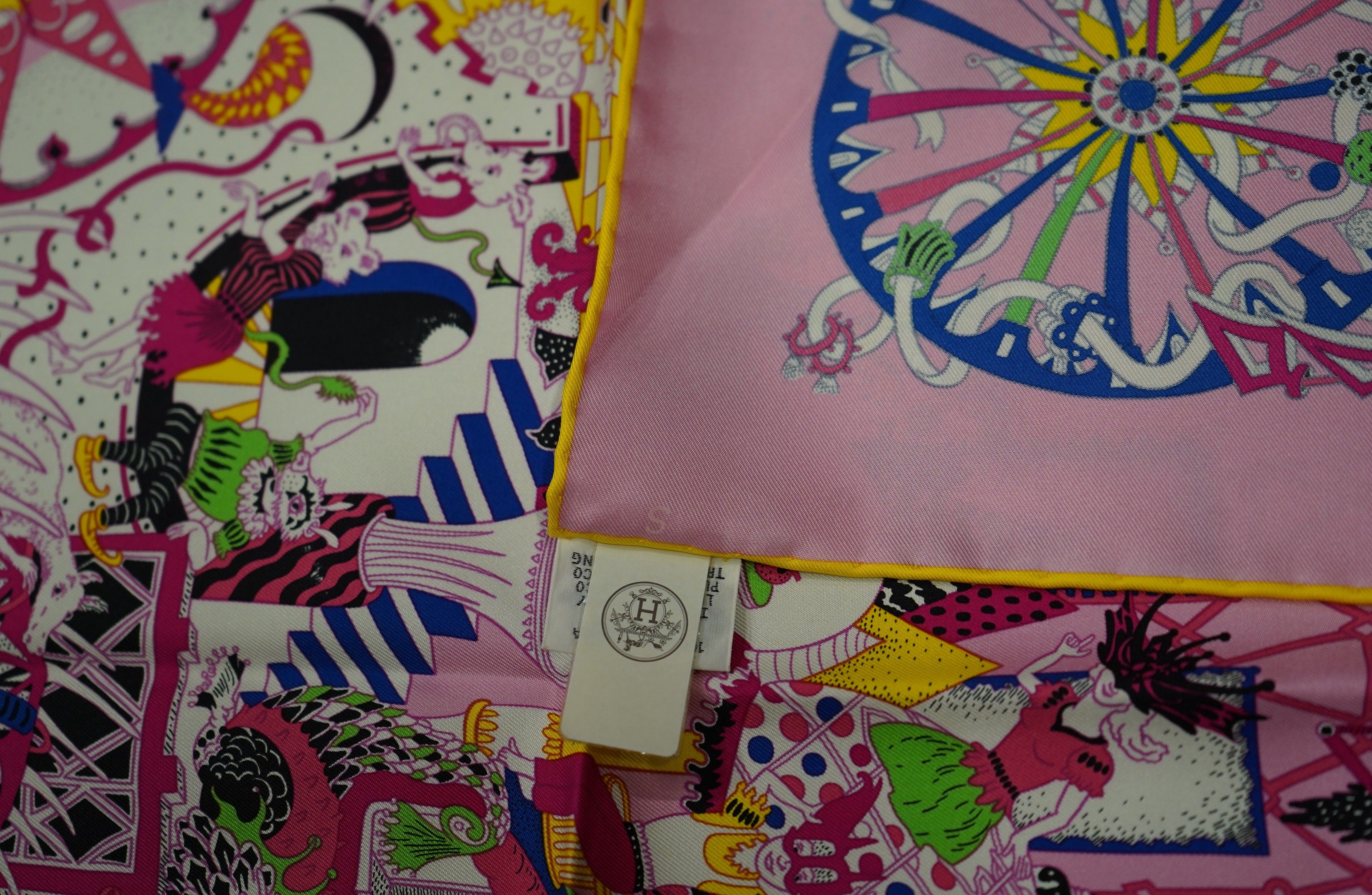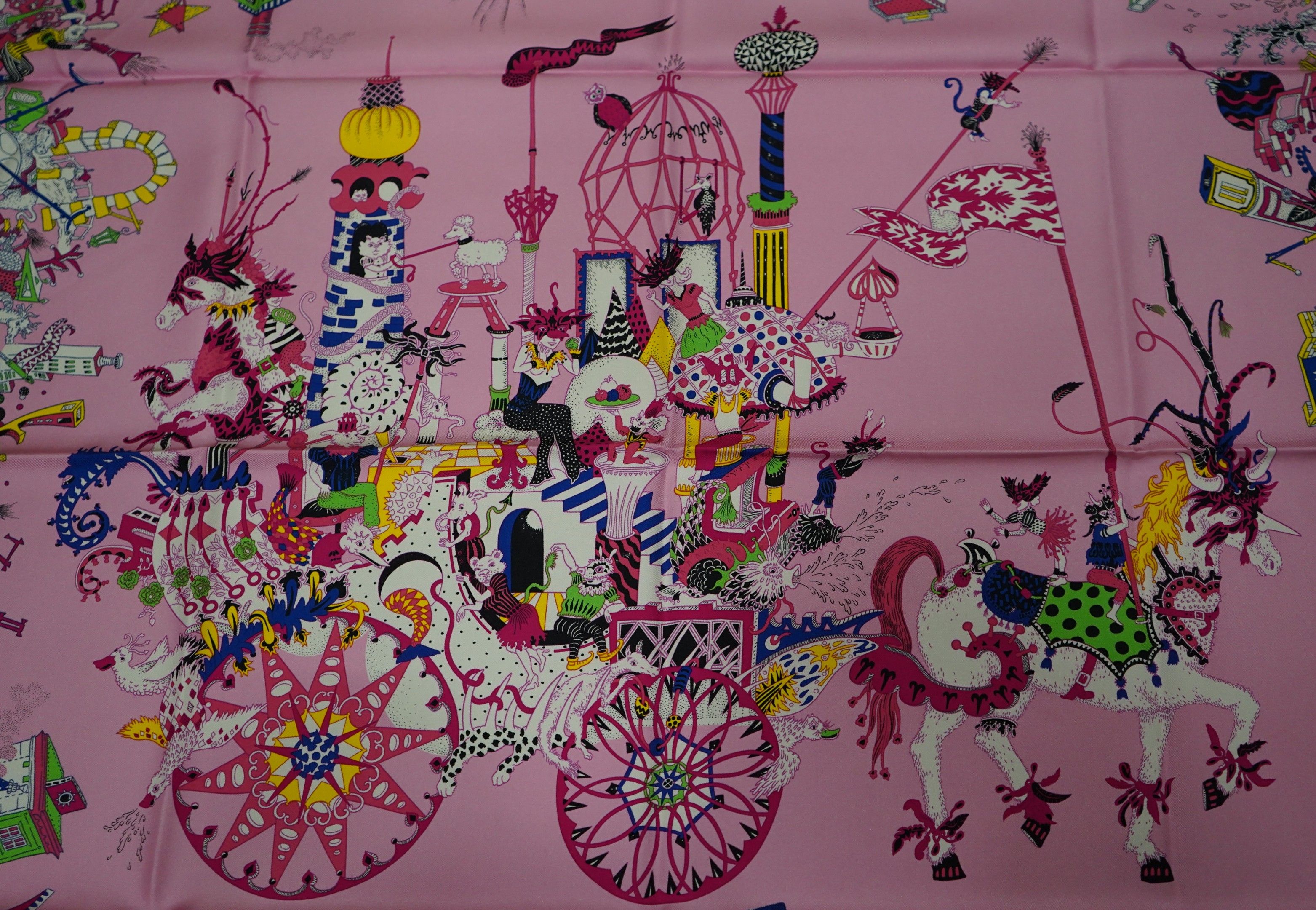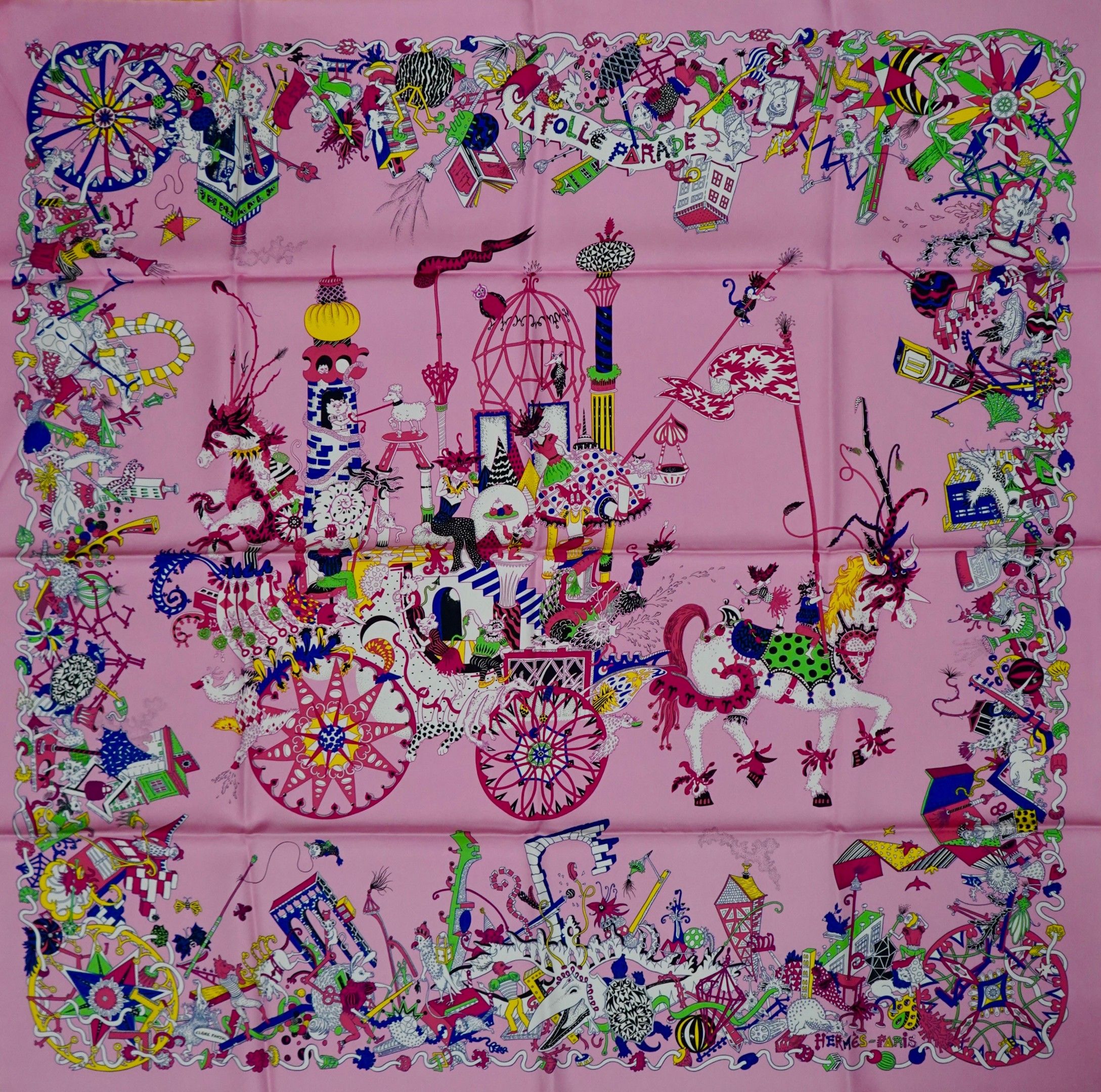 HERMÈS PARIS Carré 90 en twill de soie "La folle Parade", signé Claire Fanjul, fond et roulotté jaune (très bel état)