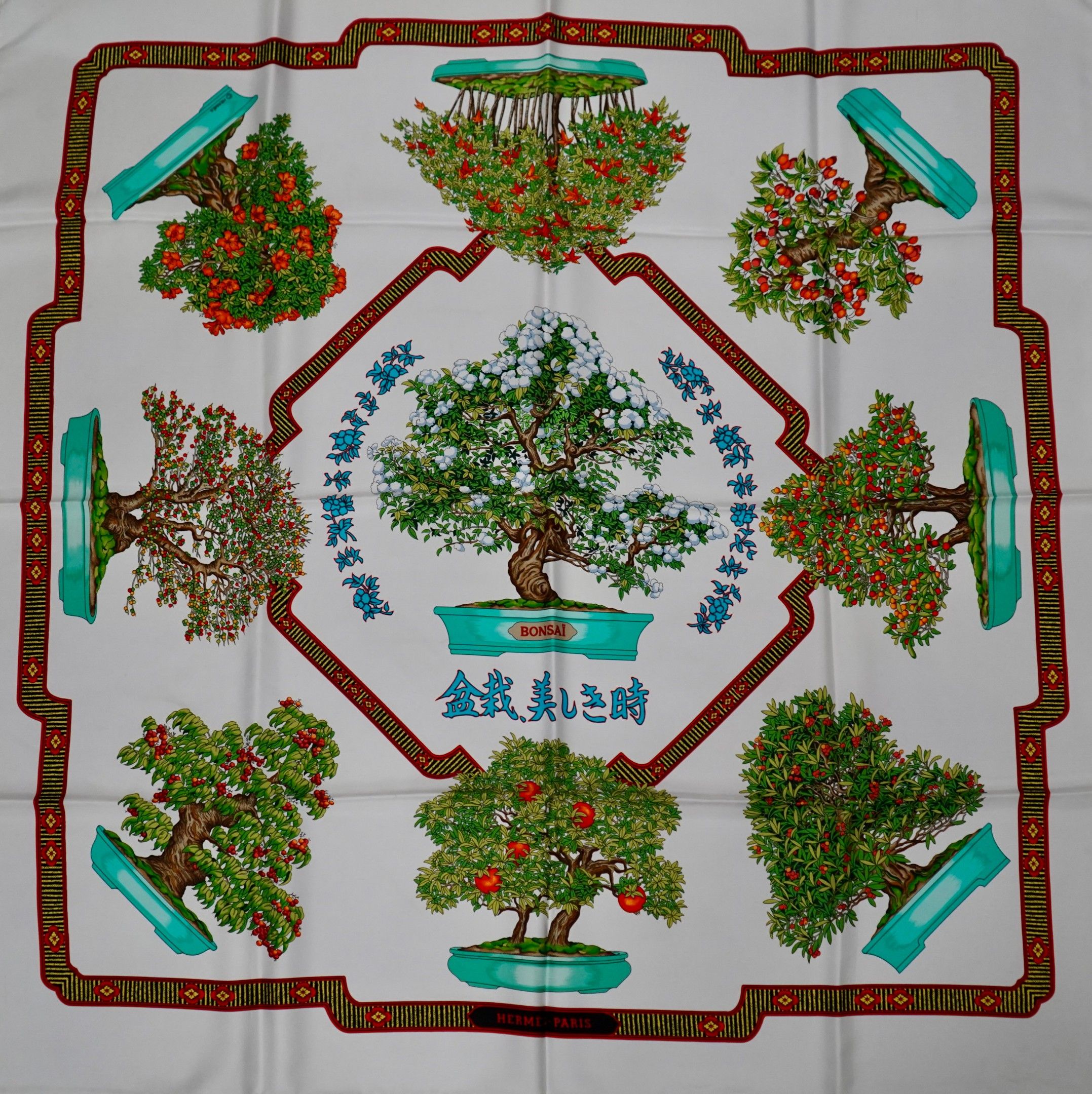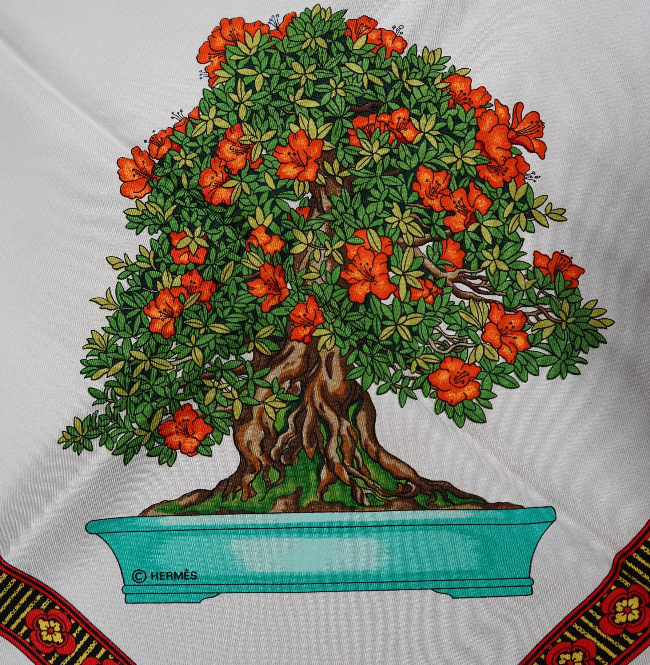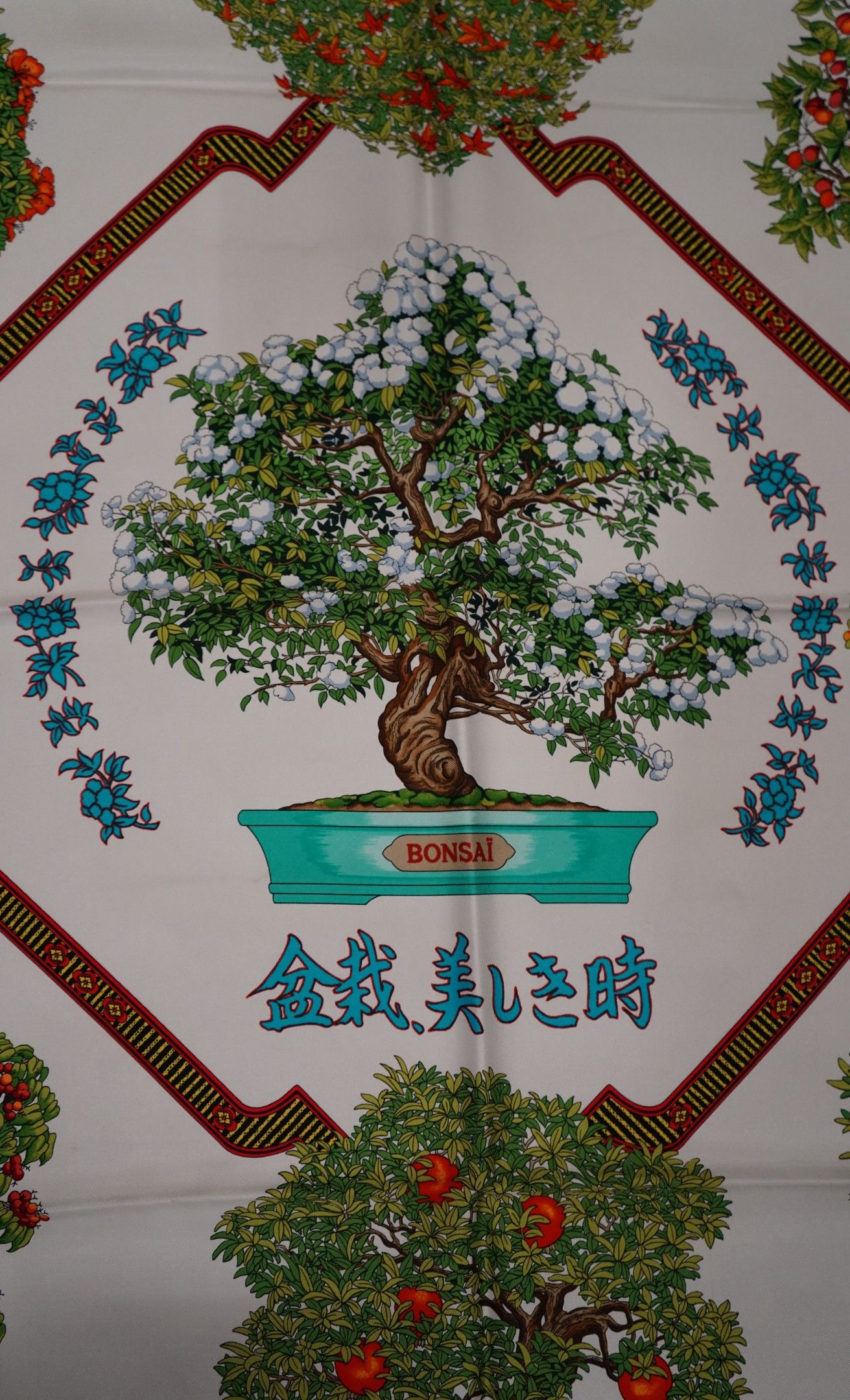 Carré 90 en twill de soie Les beaux jours du Bonzaï, d'après un dessin de Catherine Baschet, fond blanc
